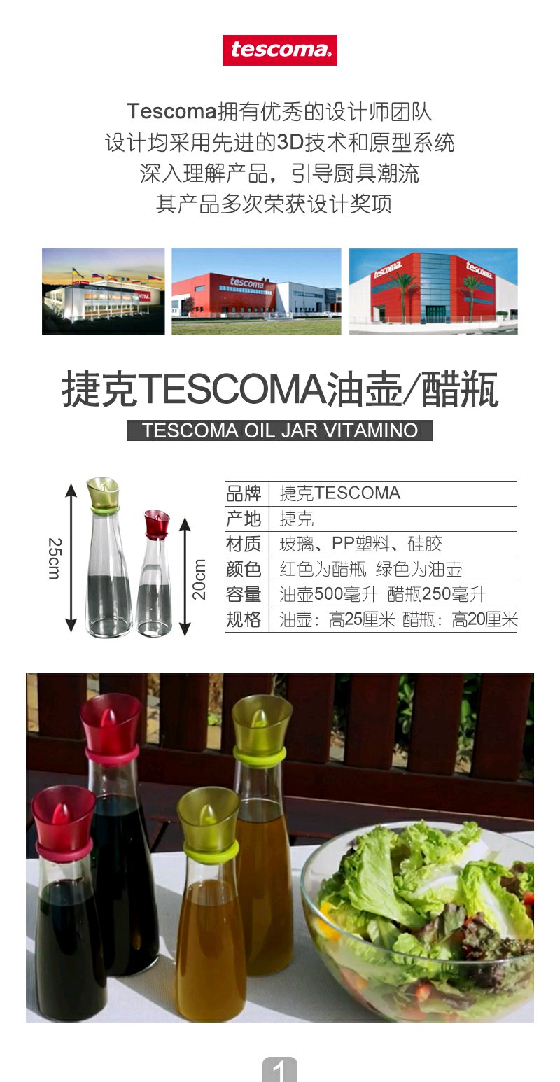 捷克进口/tescoma VITAMINO系列500ml油壶 玻璃防漏油瓶 酱油罐