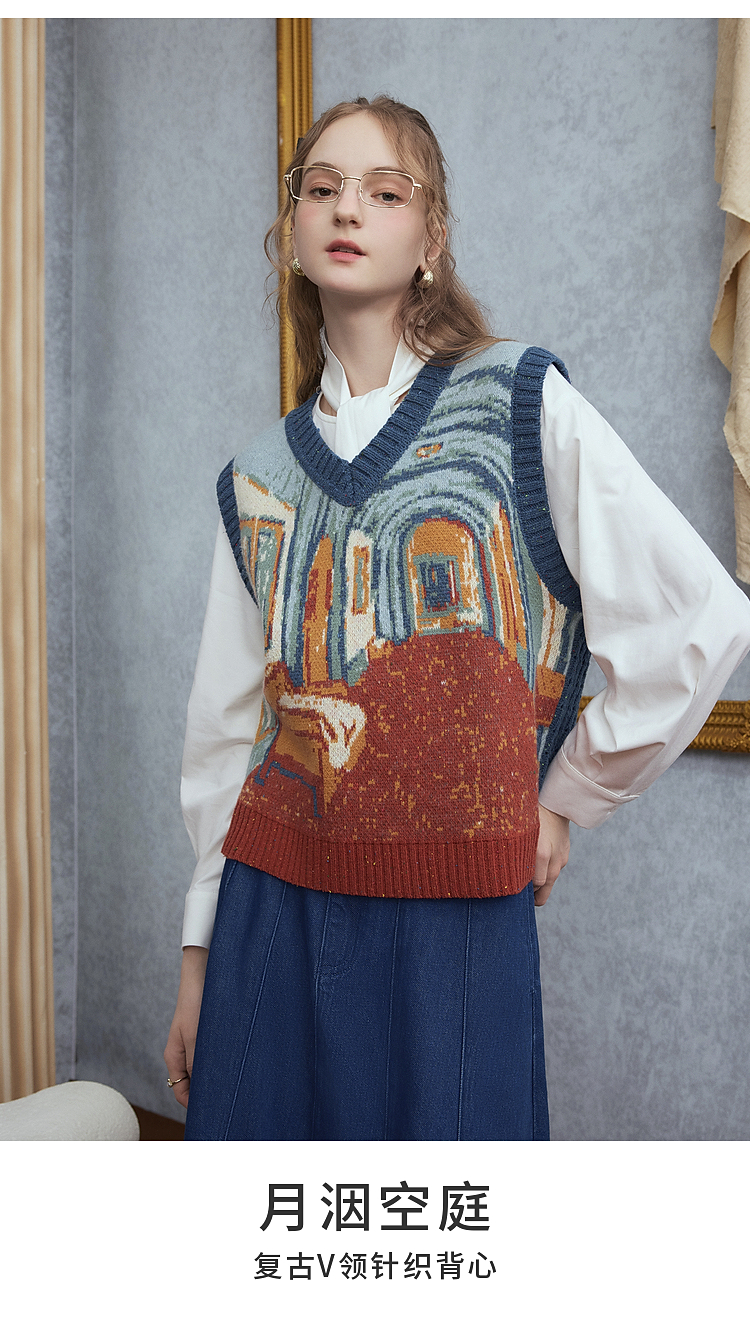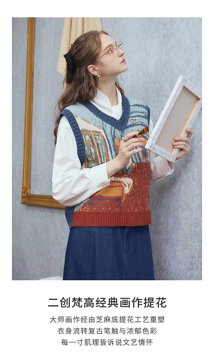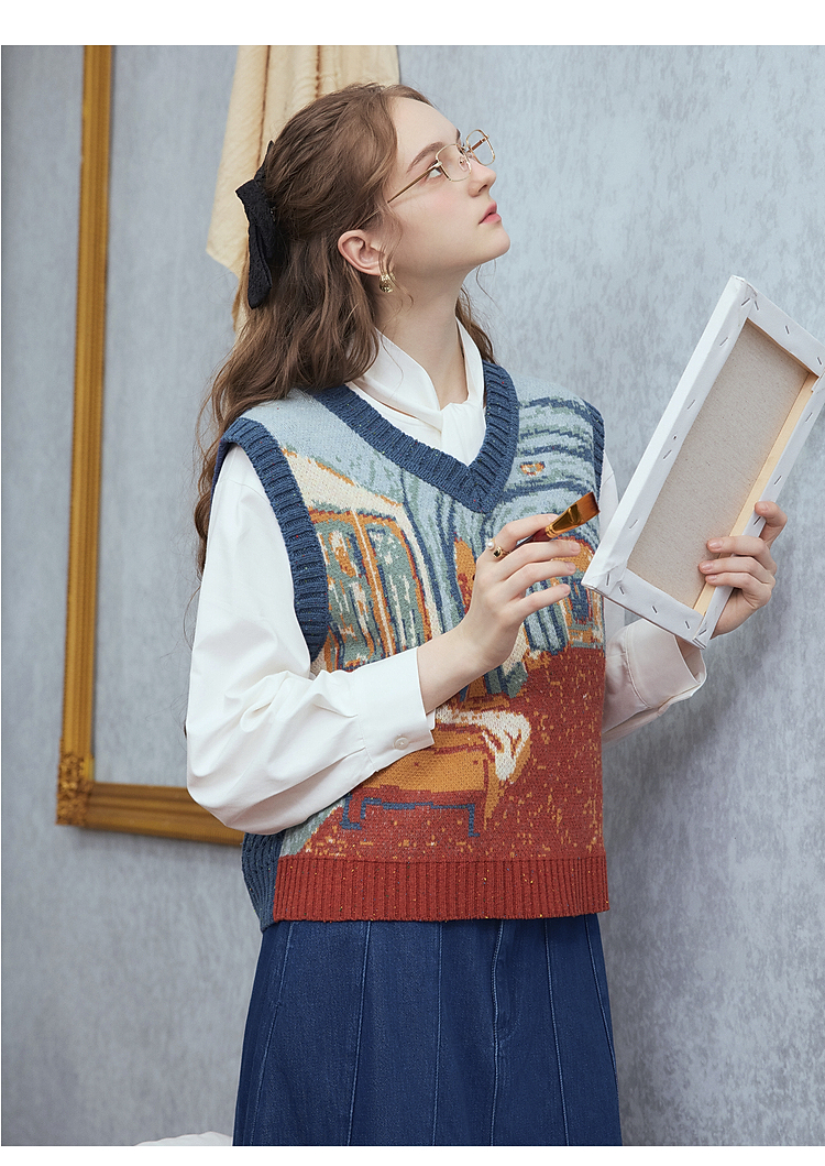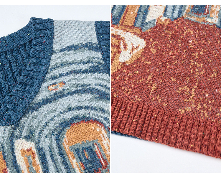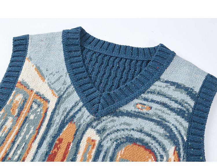 两三事梵高文艺月洇空庭2025冬季新款抽象图案毛织马甲女宽松马夹