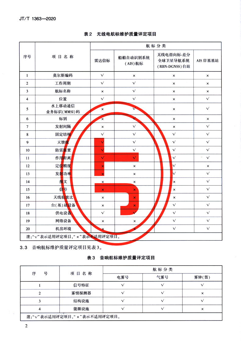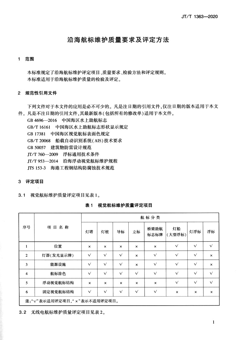 | 沿海航标维护质量要求及评定方法(JT/T 1363—2020) | ||