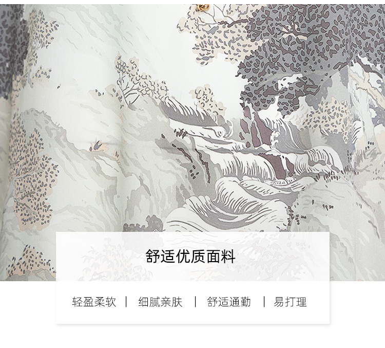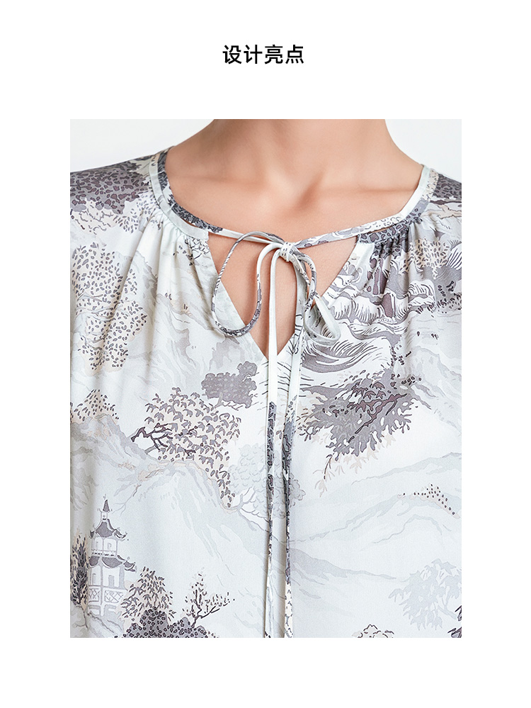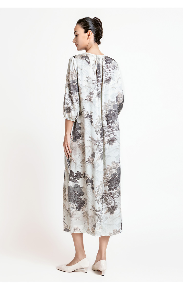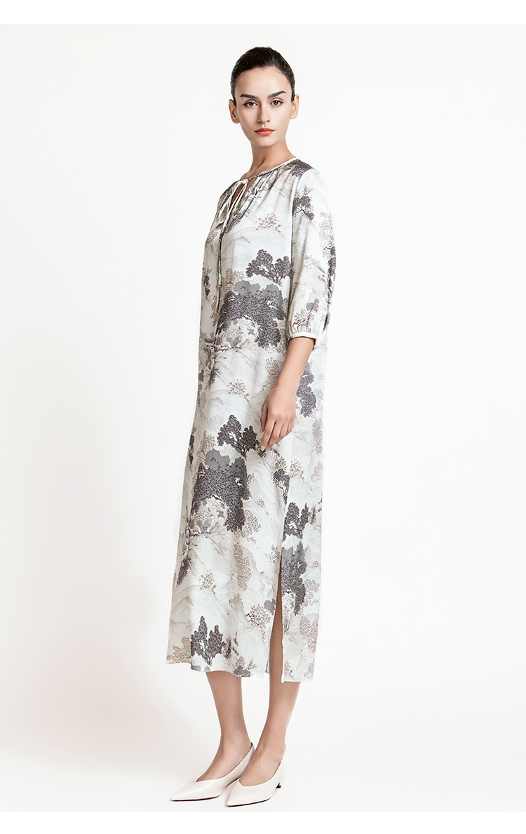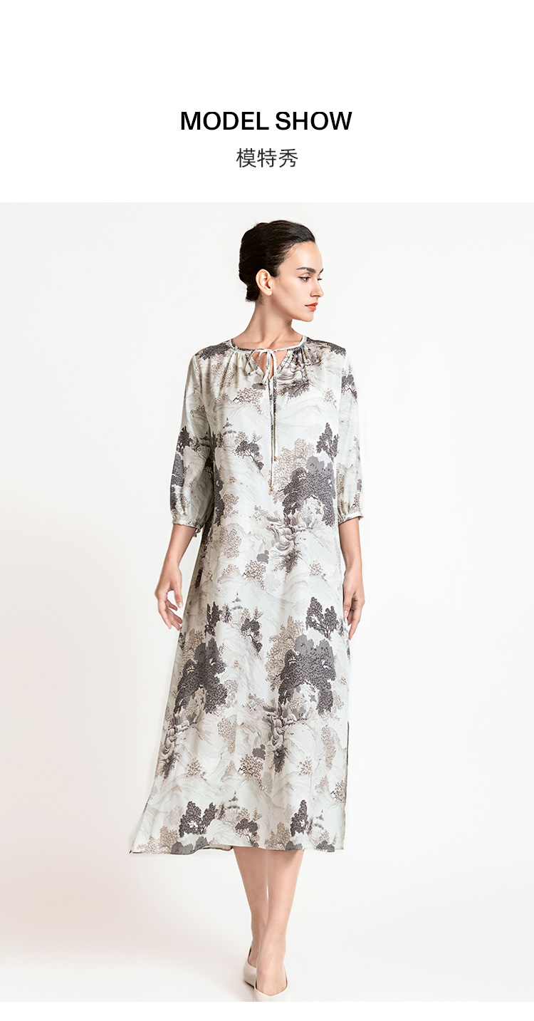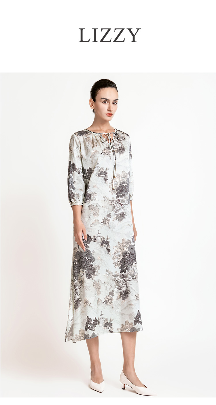 LIZZY 新中式山水画图案圆领中袖阔版型水滴V领连衣裙7941