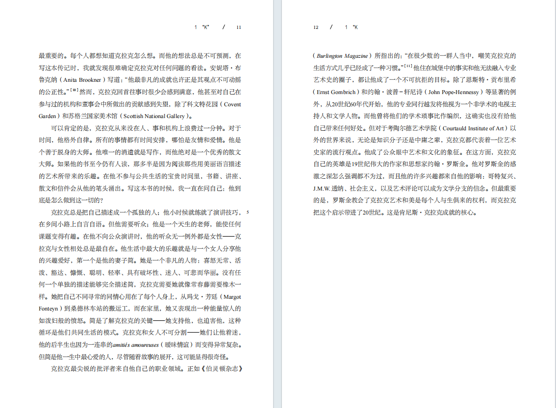 肯尼斯·克拉克,英国著名艺术史家、策展人、电视节目主持人。他不仅在关于风景画与裸体艺术的理论研究方面有里程碑式的贡献,在艺术的大众推广方面更是起到了不可估量的作用。30岁时他出任英国国家美术馆馆长,第二次世界大战期间成功使馆藏在轰炸中得以保存,同时又推行“每月一画”等计划,使博物馆成为战争中抚慰、鼓舞民心的机制;1969年,由他主持的BBC艺术纪录片《文明》在全球范围热播,开启了利用大众媒体进行艺术普及的先河。本书为克拉克的人生纪实,作者詹姆斯·斯托顿基于大量之前未曾公开过的档案,向我们详细介绍了克拉克献身学术研究与公共事业的一生,更揭示了他独一无二的人格魅力。