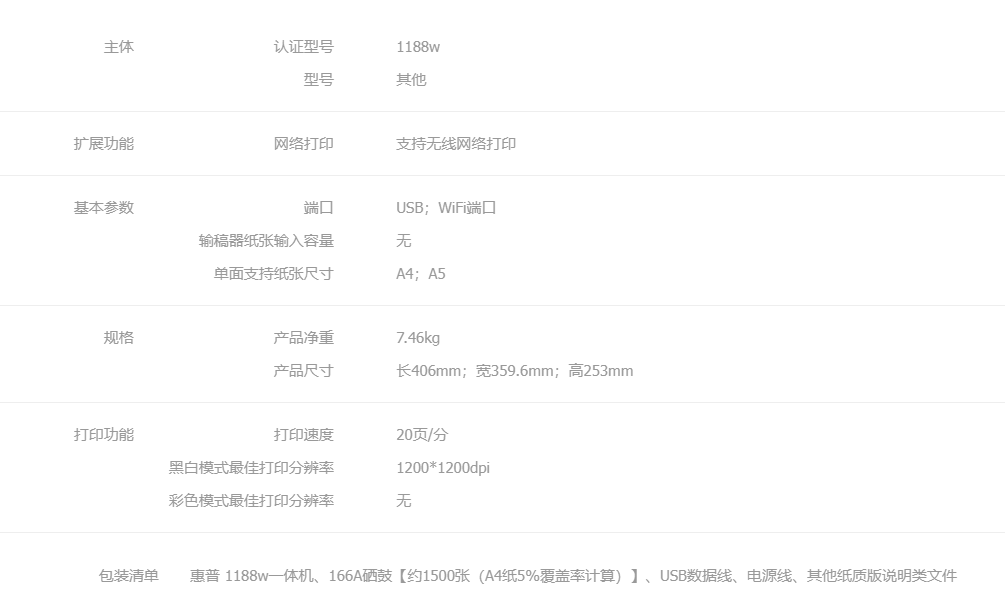 惠普(HP)打印机办公家用 1188w A4黑白激光复印扫描一体机 无线