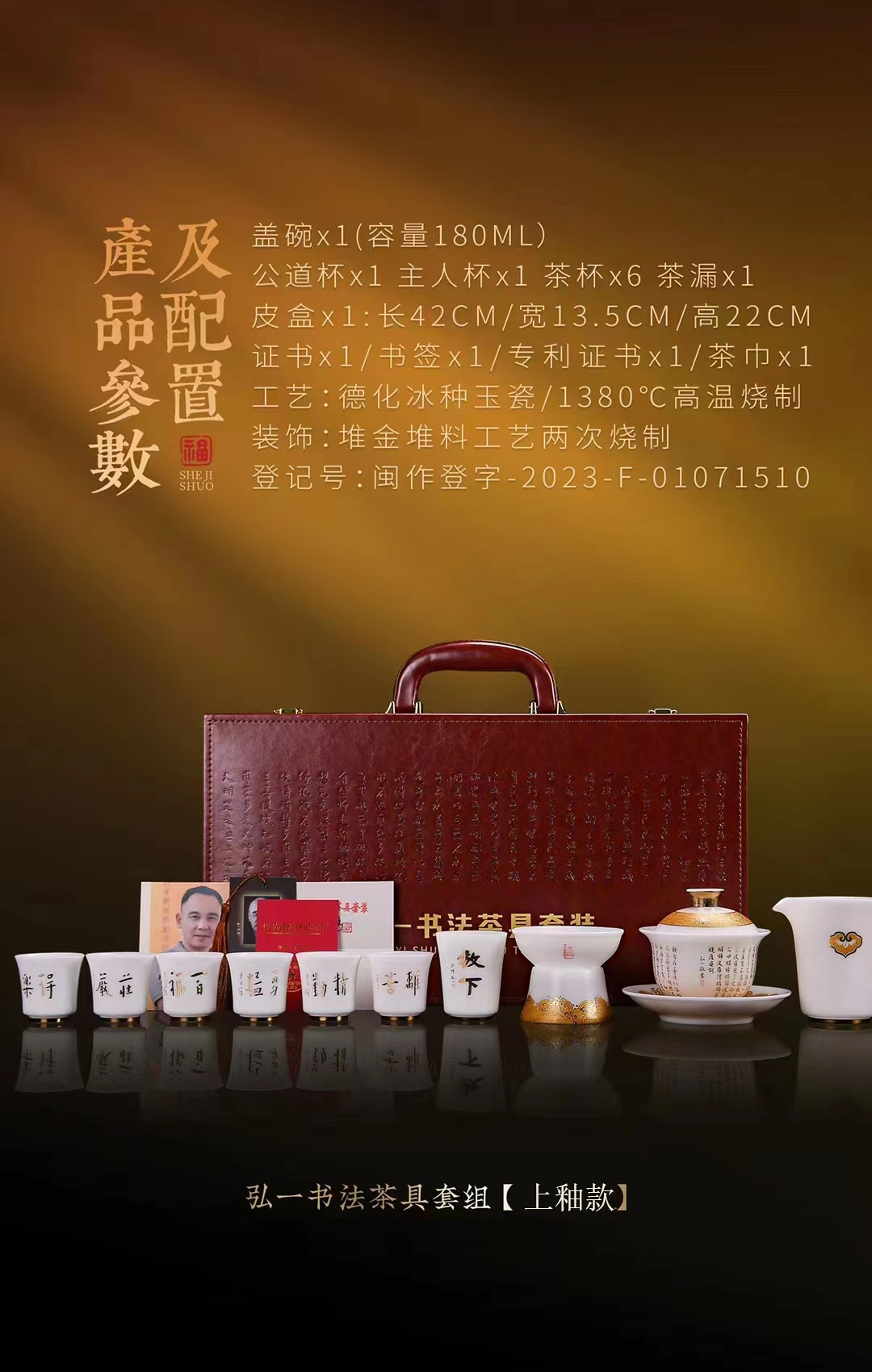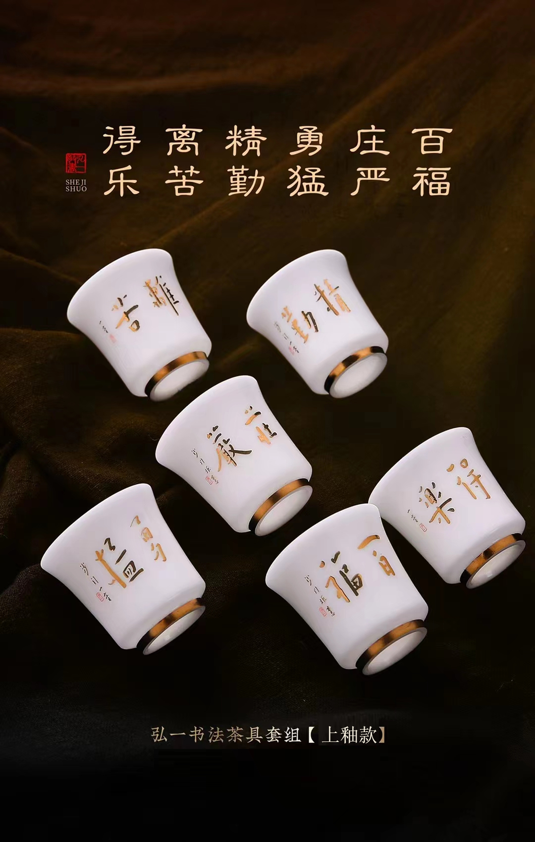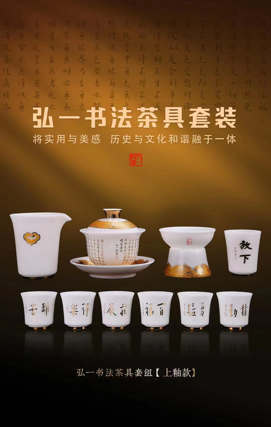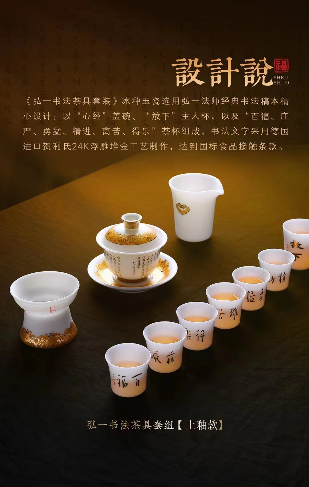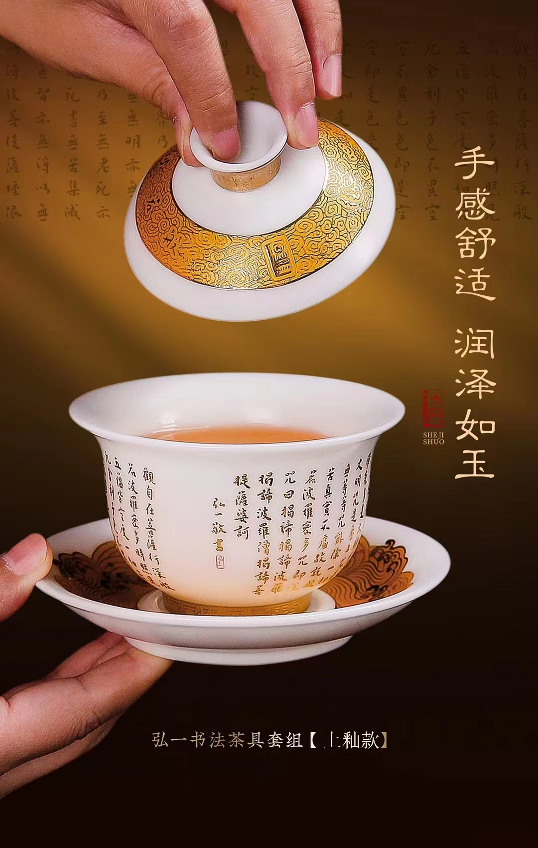 【弘一书法入杯盏,道尽禅机揽福气】弘一书法茶具套装、心经盖碗、放下主人杯,冰种玉瓷 迎光透亮,徐建勇老师签章,珍藏品鉴 送礼臻品