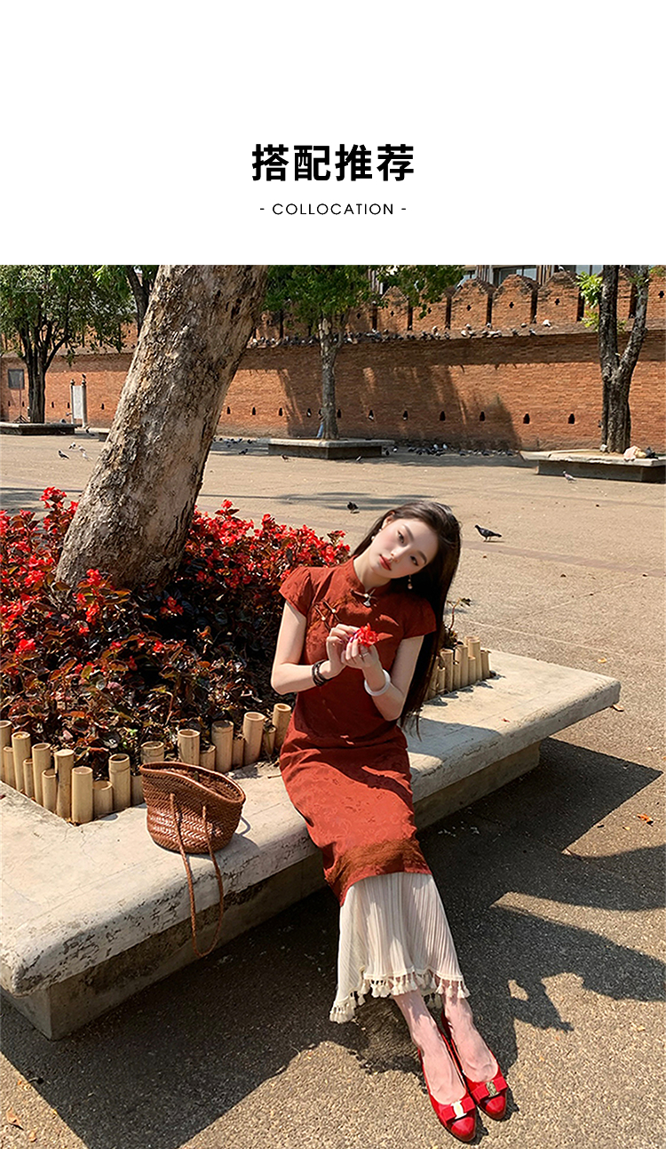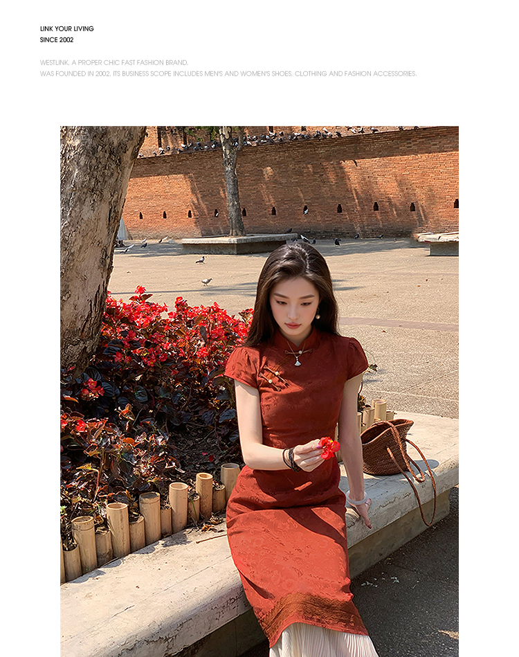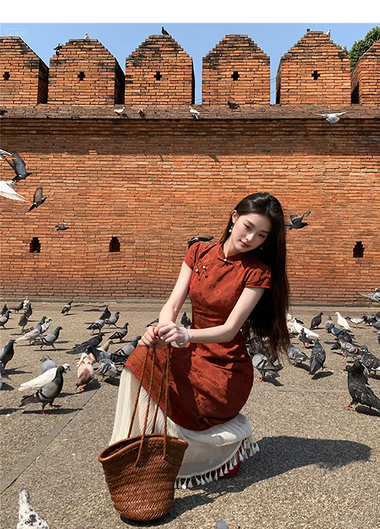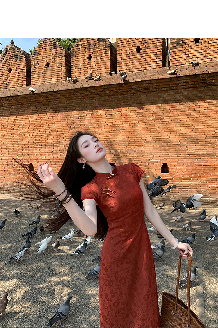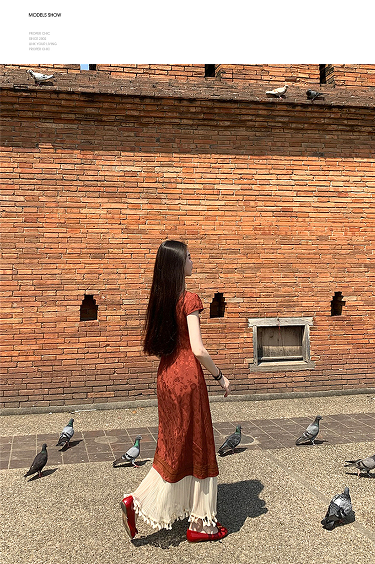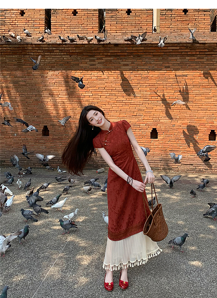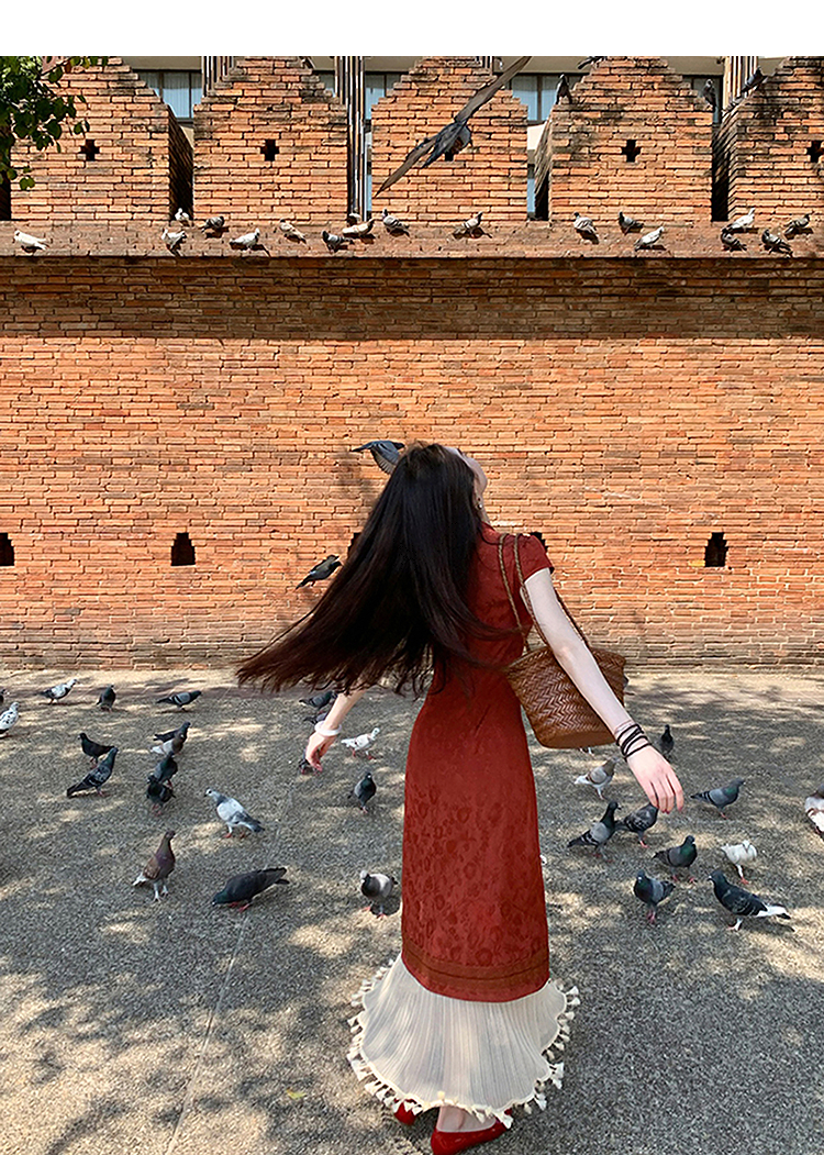 西遇新中式连衣裙女2025年夏季新款修身收腰红色盘扣拼接短袖长裙SS050574