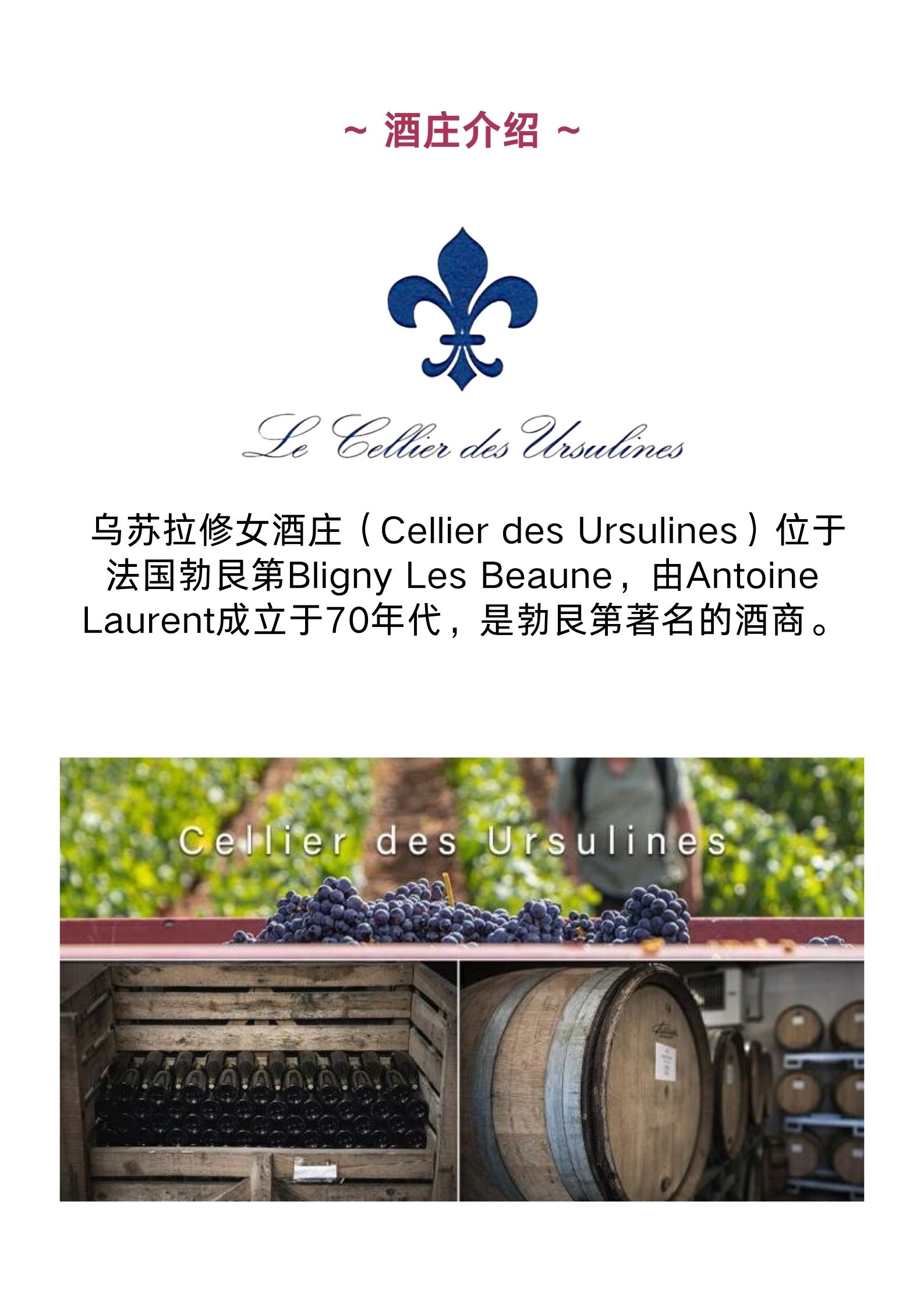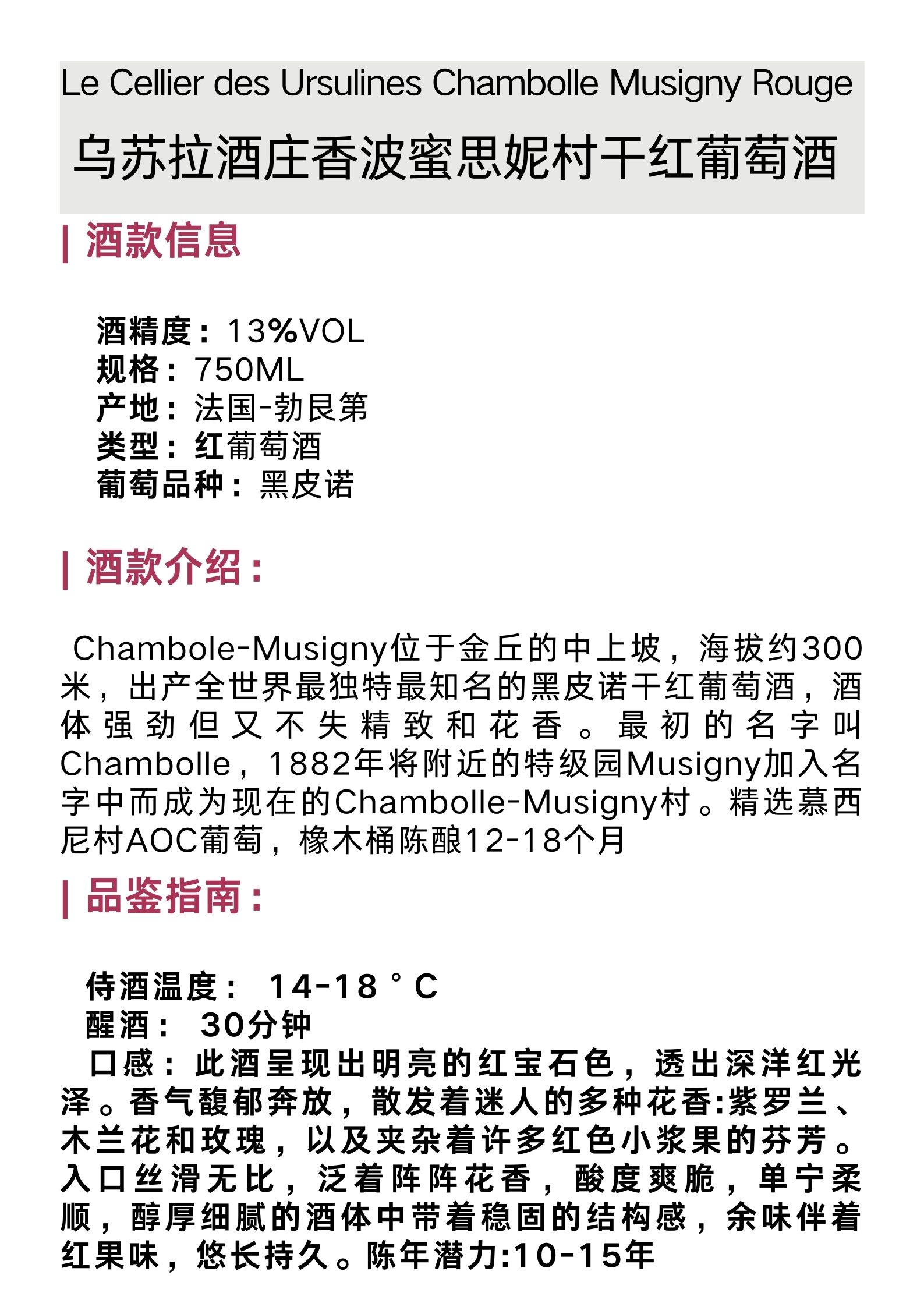 乌苏拉酒庄香波蜜思妮村干红葡萄酒 Le Cellier des Ursulines Chambolle Musigny Rouge