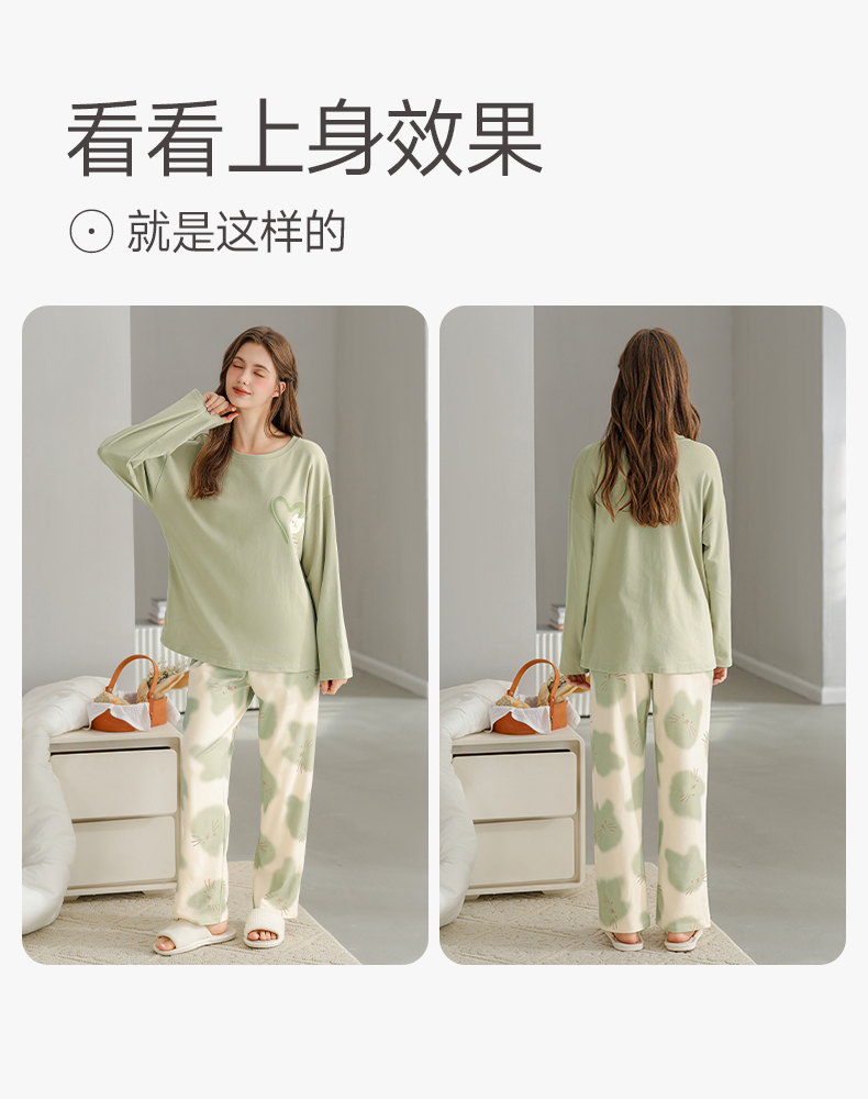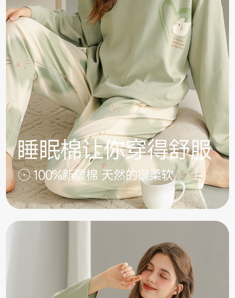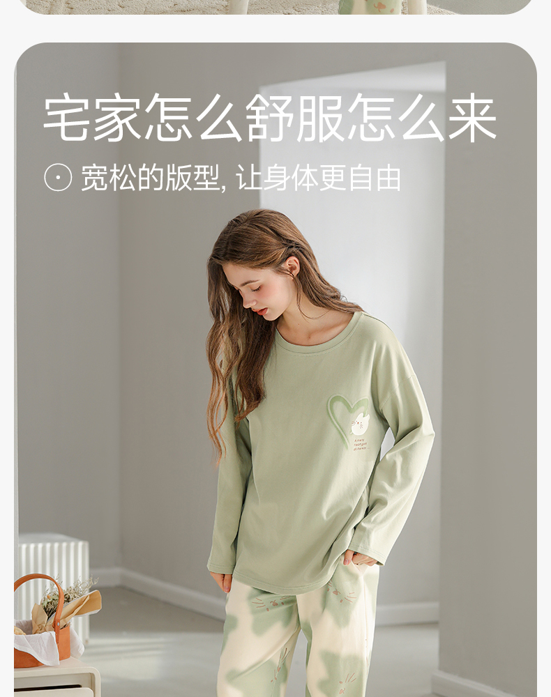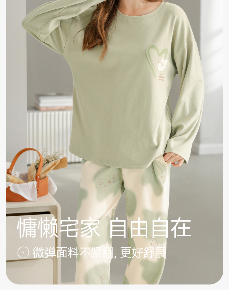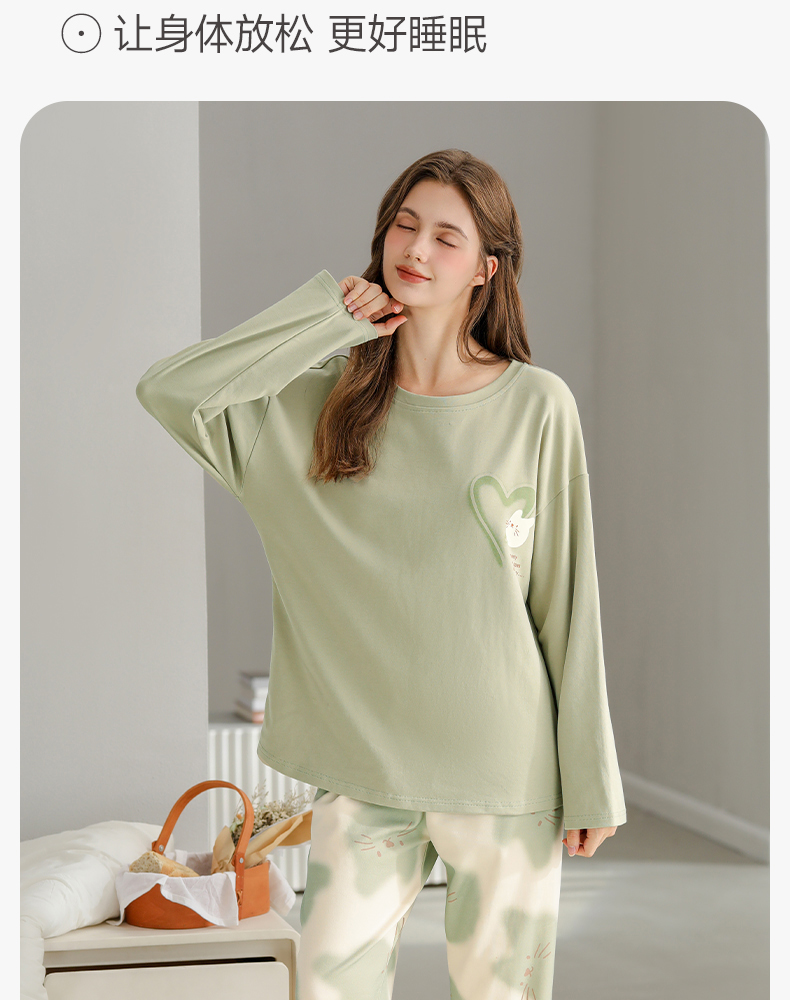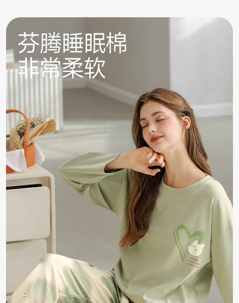 芬腾纯棉春秋季女士睡衣长袖套头套装可爱宽松休闲大码全棉家居服