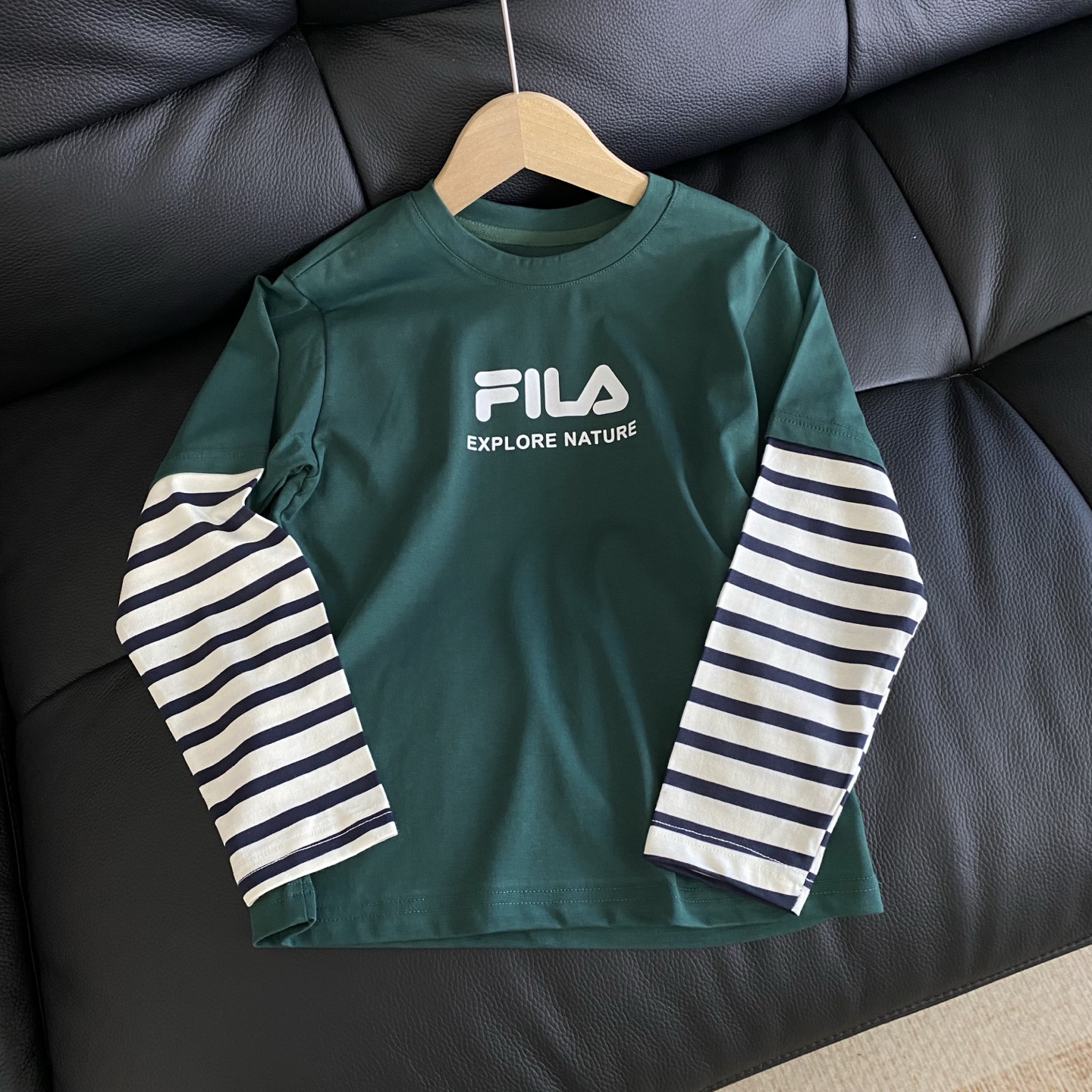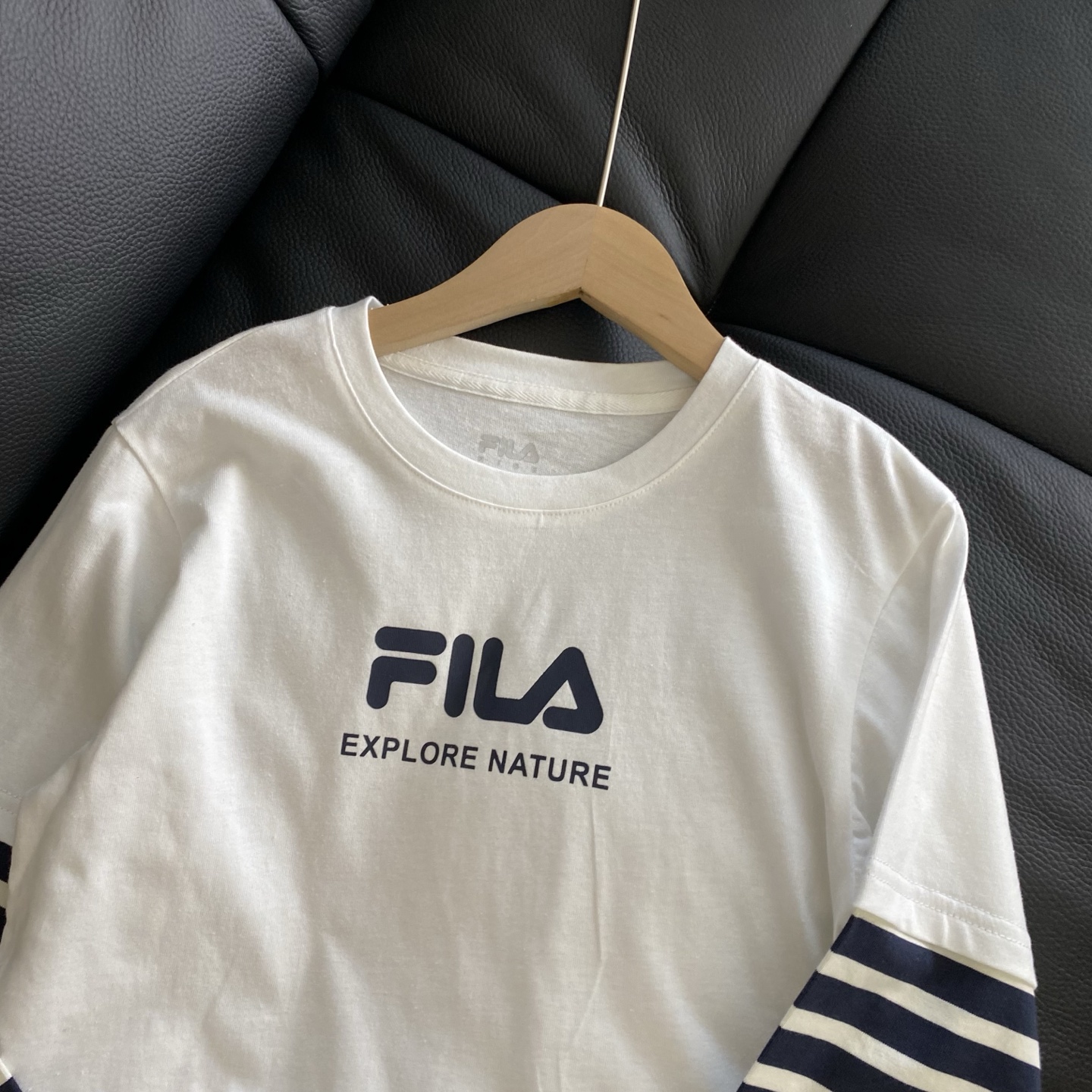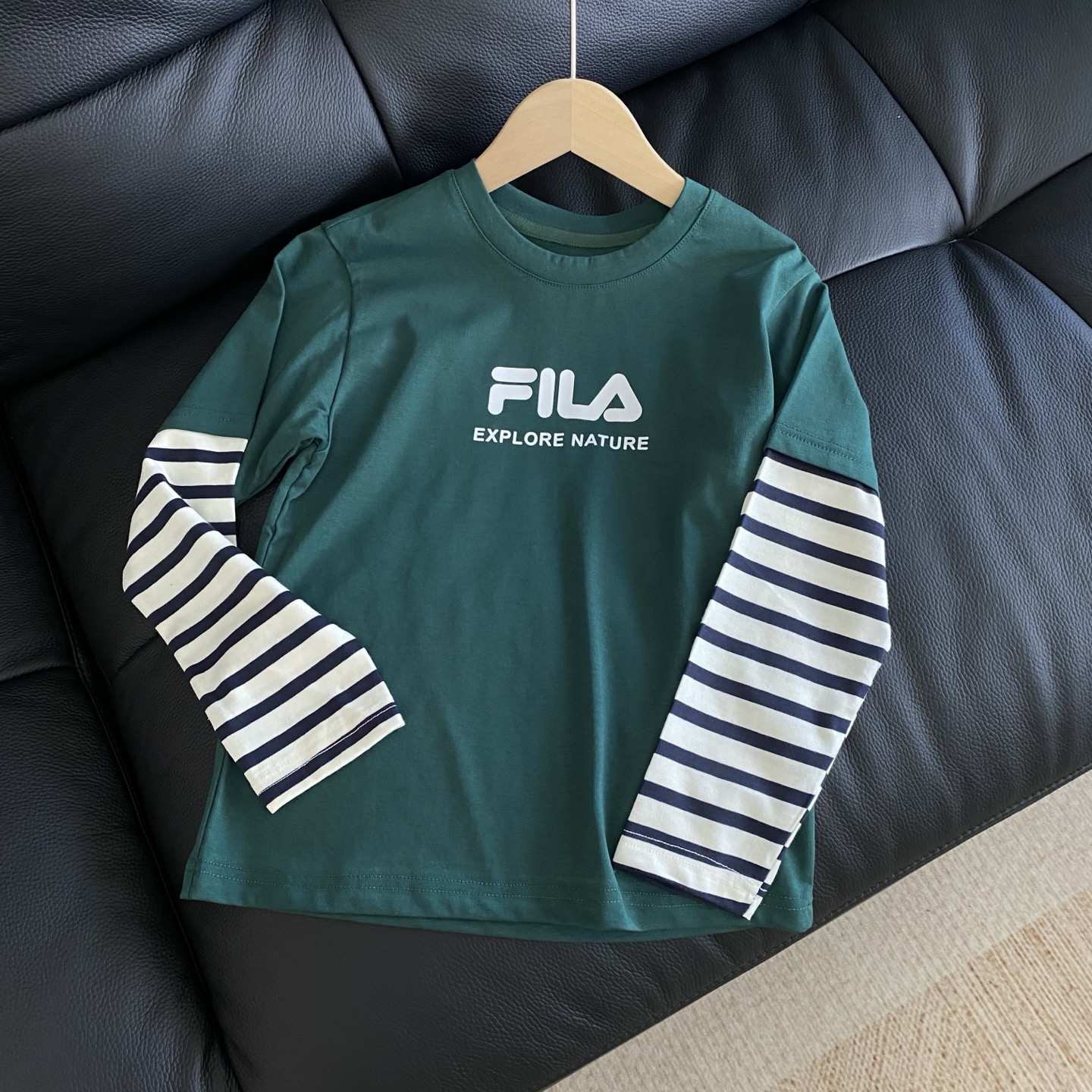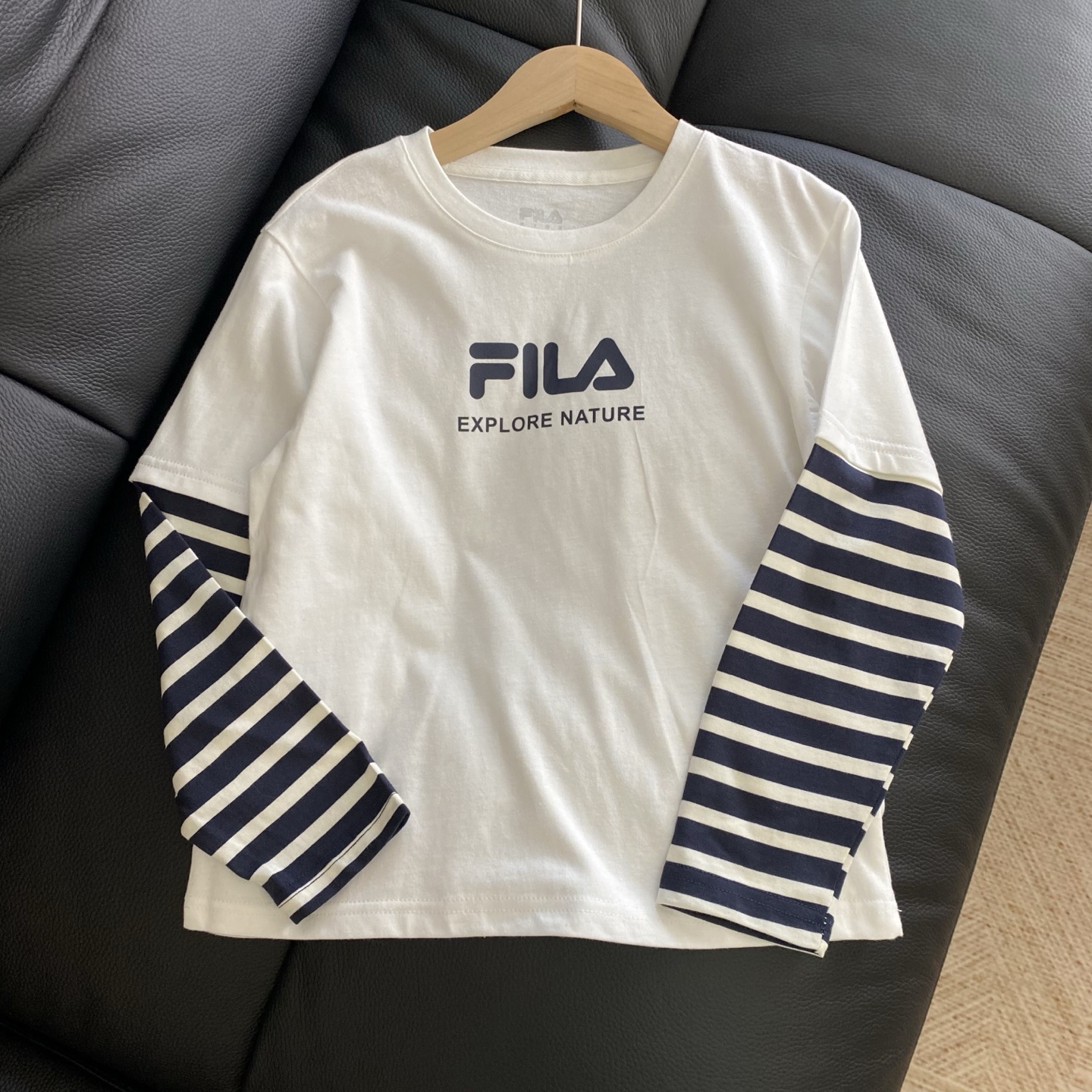 简约的品牌logo印花搭配假两件条纹袖设计,层次感拿捏~