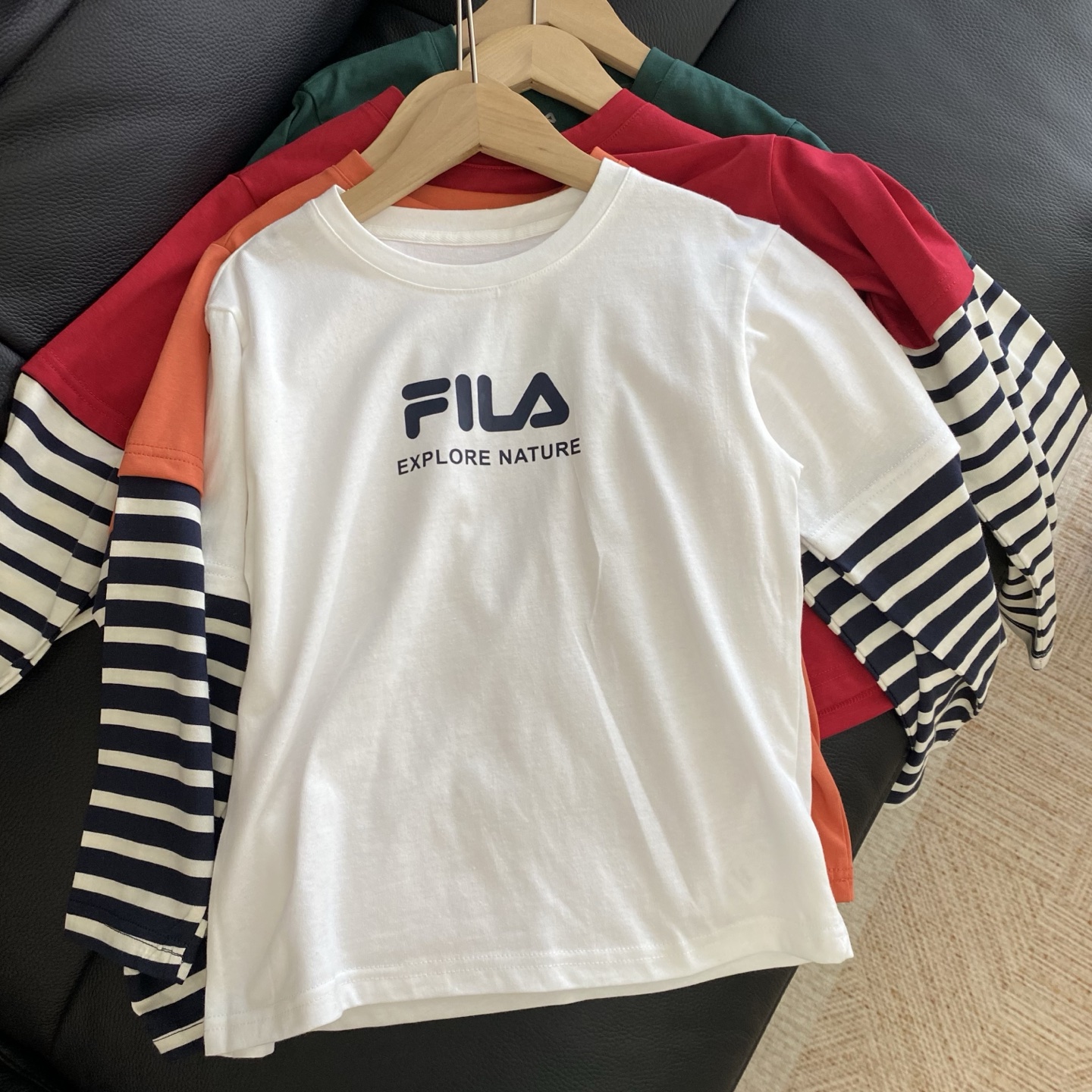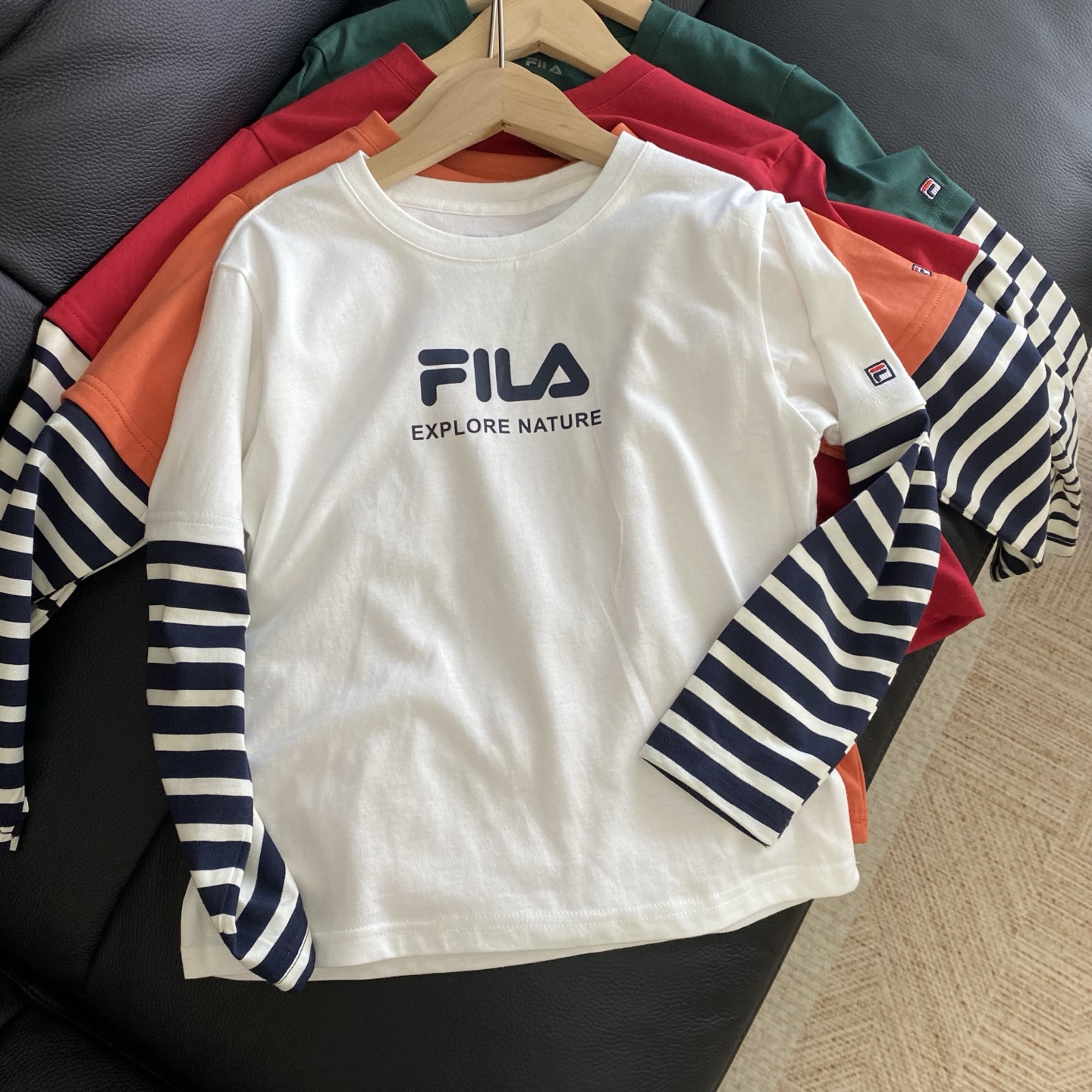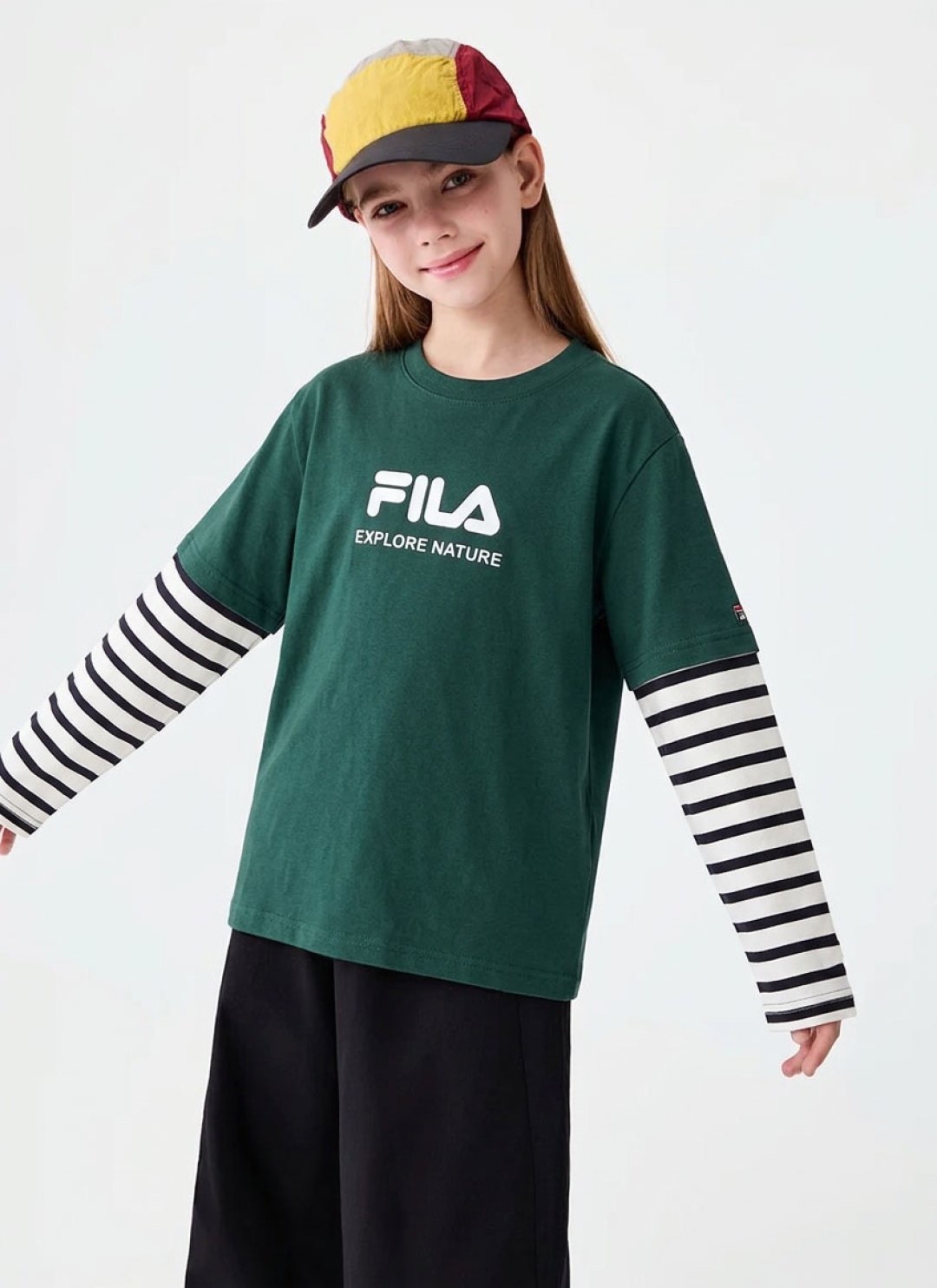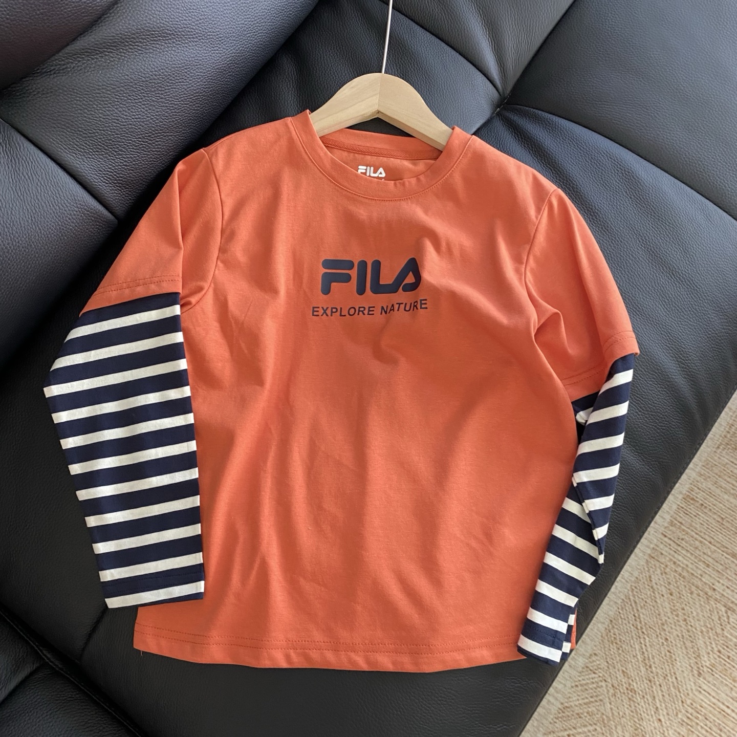 简约的品牌logo印花搭配假两件条纹袖设计,层次感拿捏~