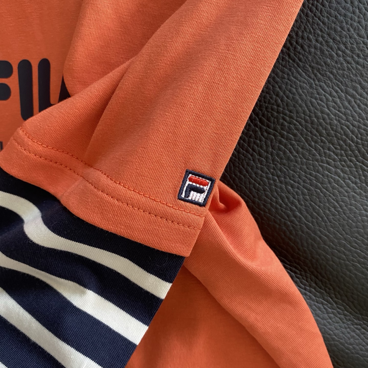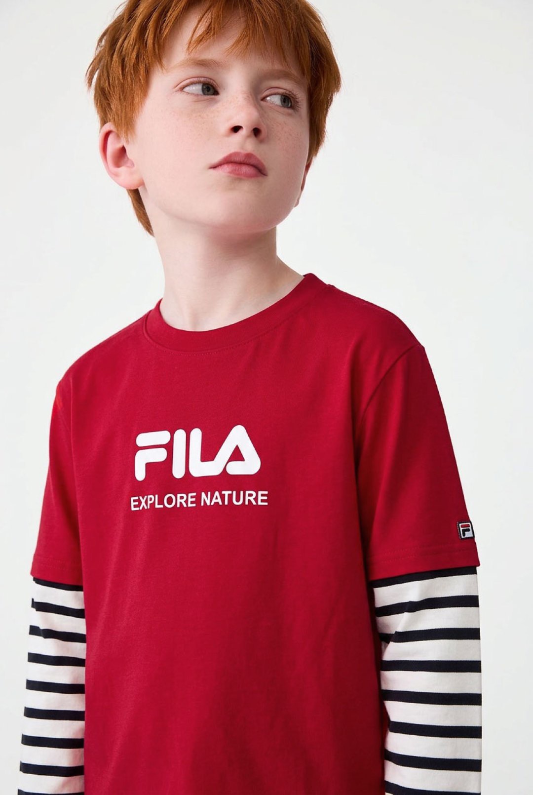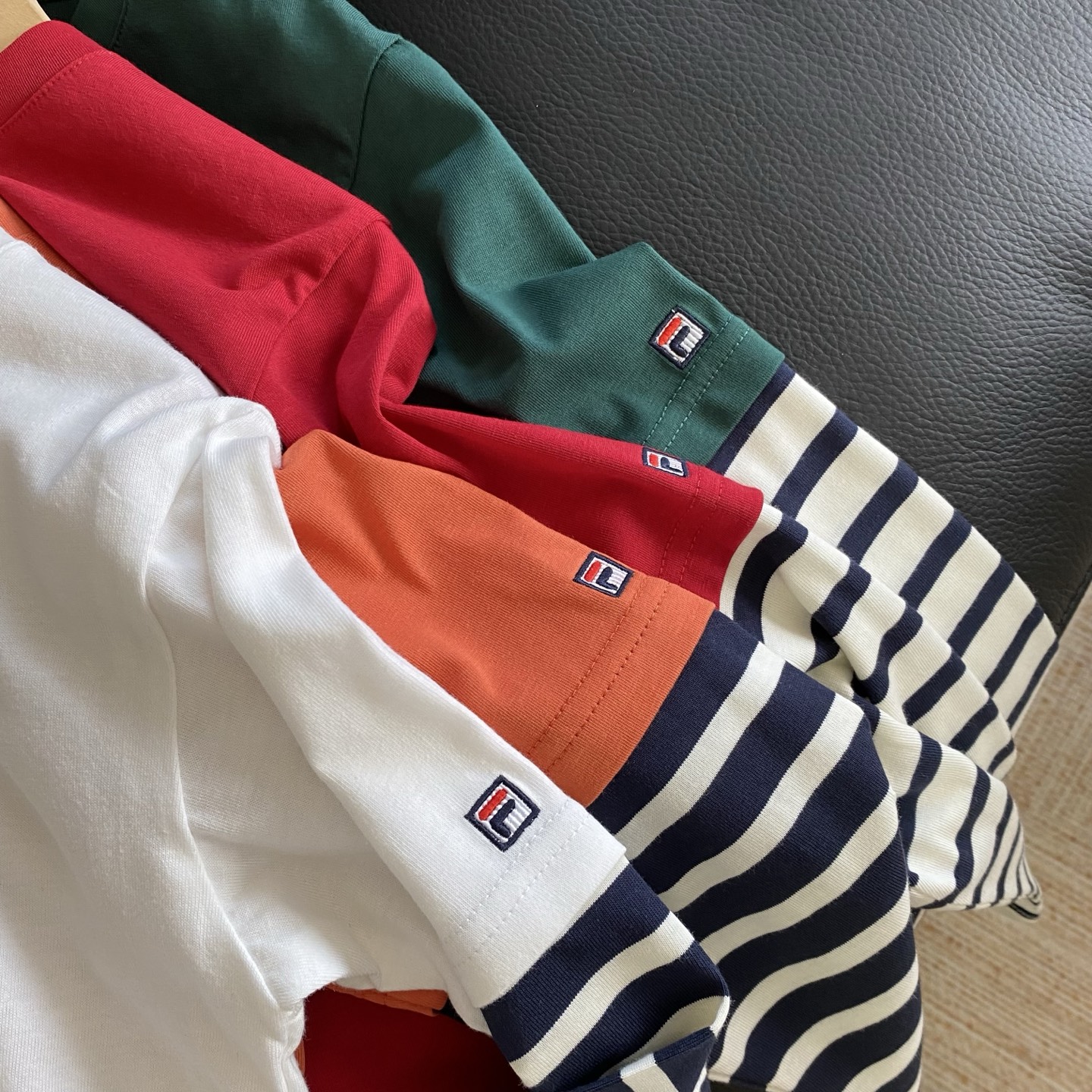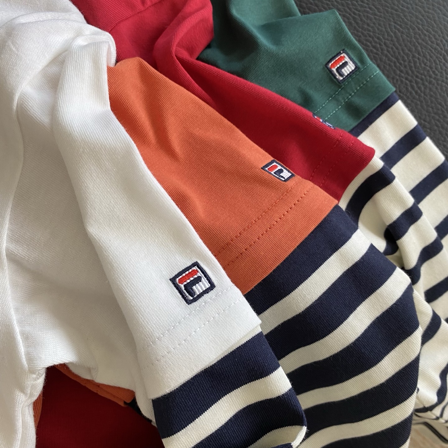 简约的品牌logo印花搭配假两件条纹袖设计,层次感拿捏~