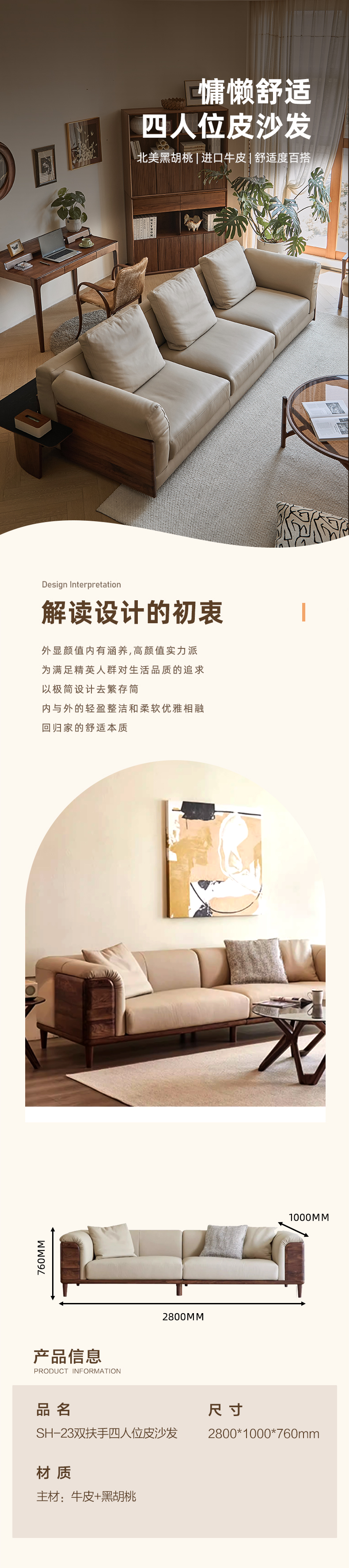 【中古风-SH-23沙发】黑胡桃/真皮/客厅/四人位皮沙发