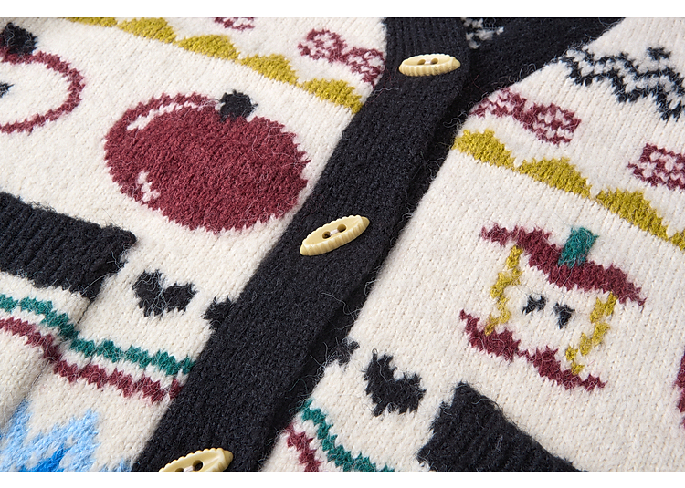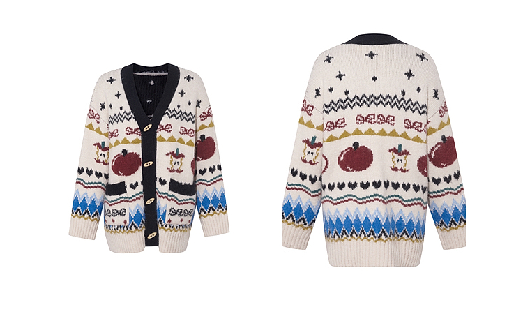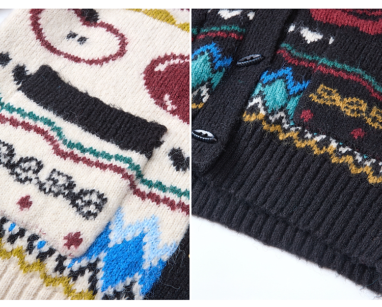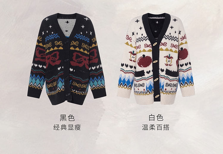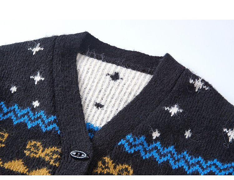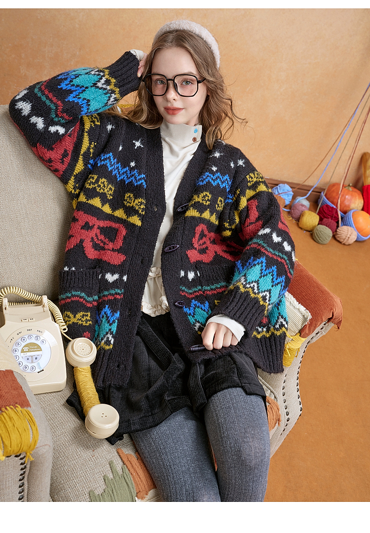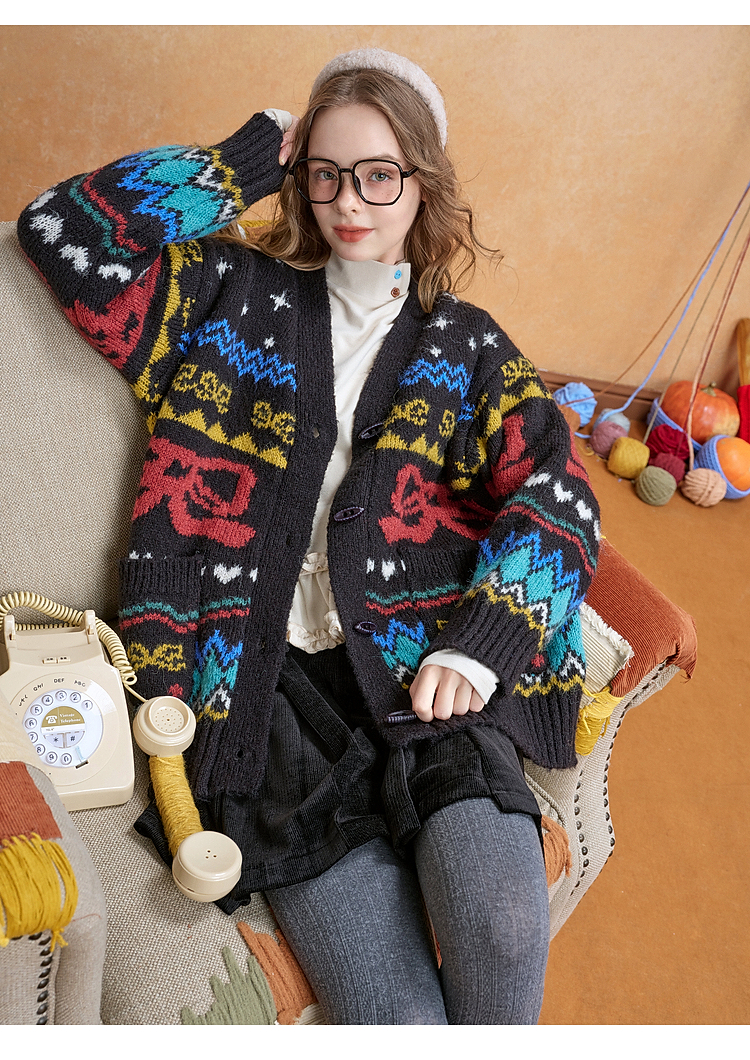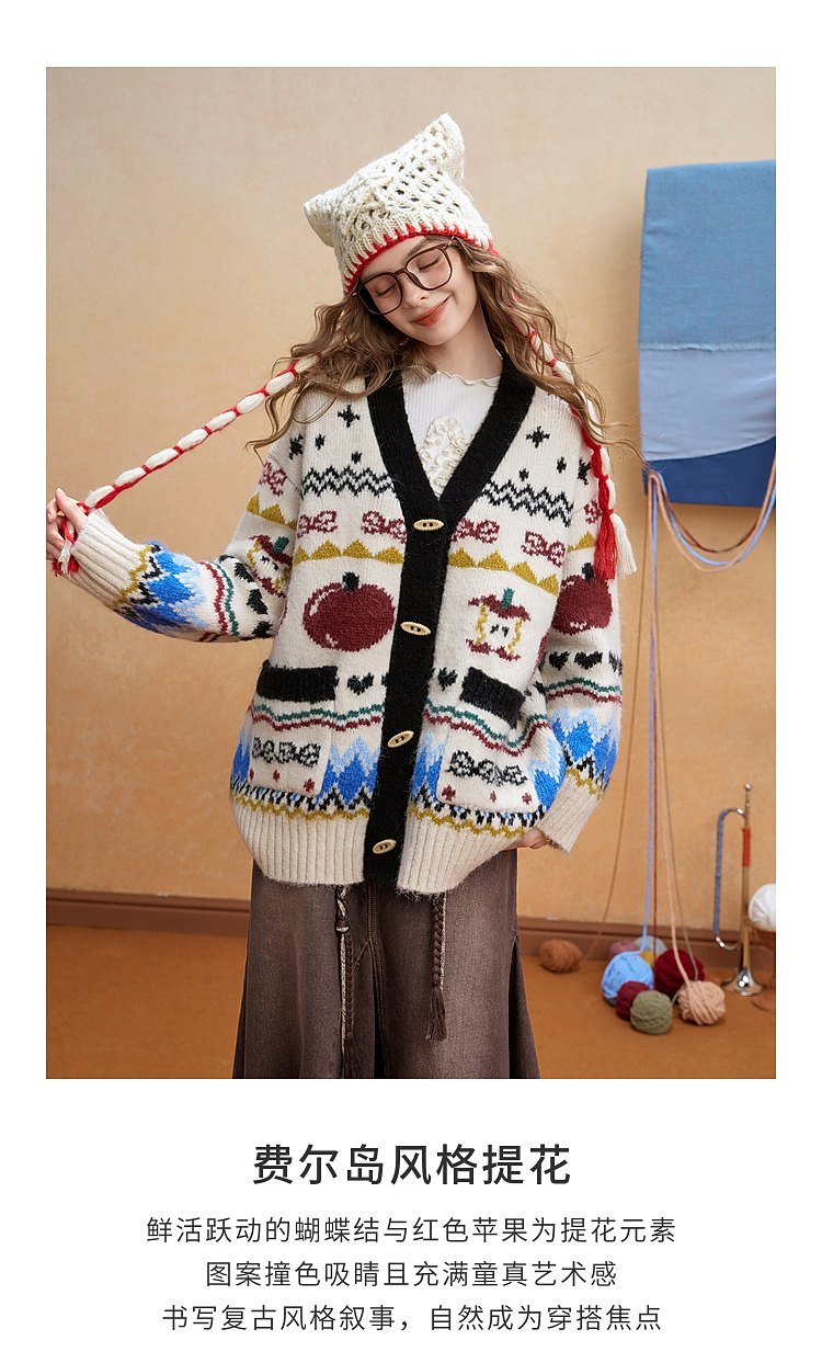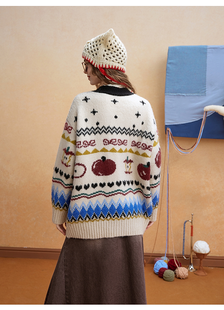两三事 迷途信标 2025冬季新款童趣提花图案费尔岛花色毛衣开衫女