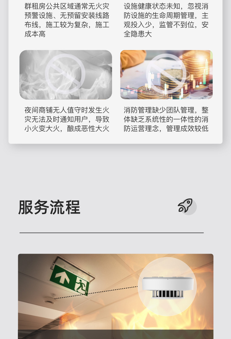 我们为客户提供家庭、商住场景的24小时在线防盗、防火、防毒以及无人化管理服务。实现老旧电子、消防设备“e”键入云,99%时间无故障使用,并升级智能化能力。