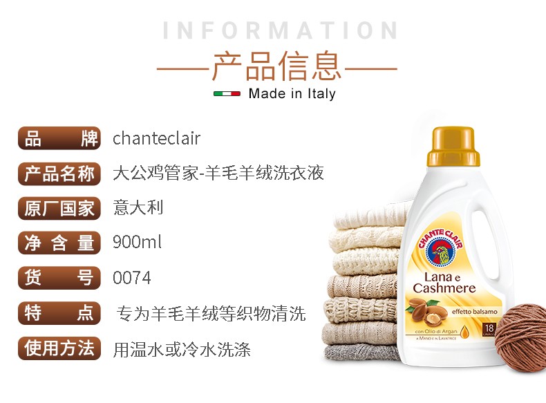 CHANTECLAIR大公鸡管家羊毛羊绒柔护洗衣液(高档衣物)900ml/瓶