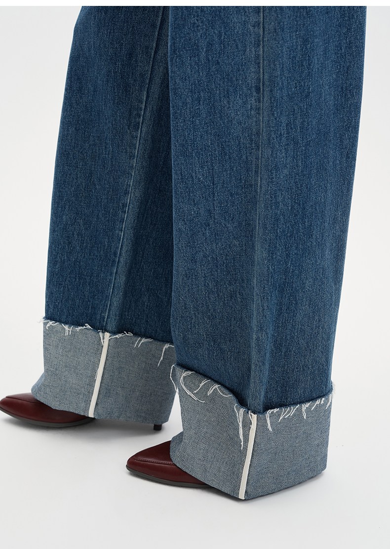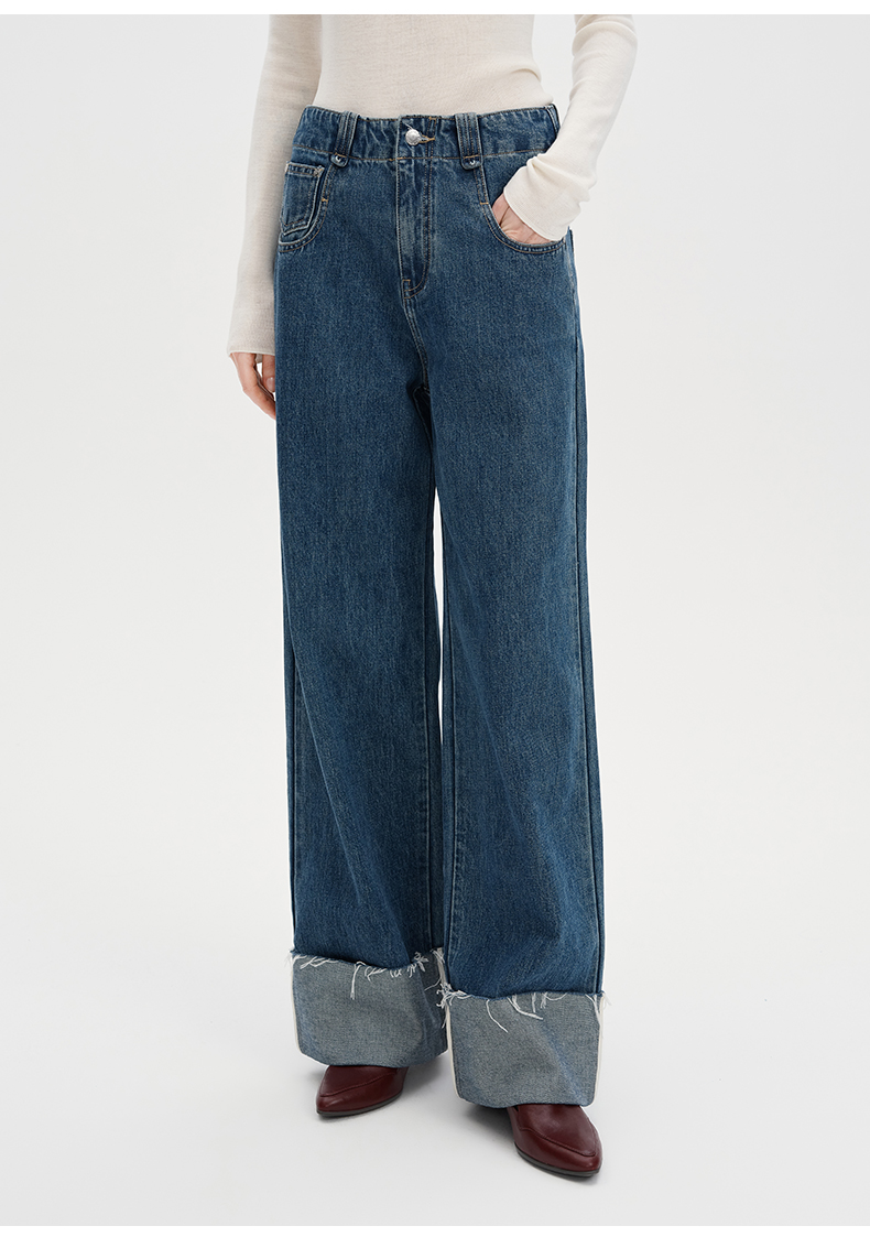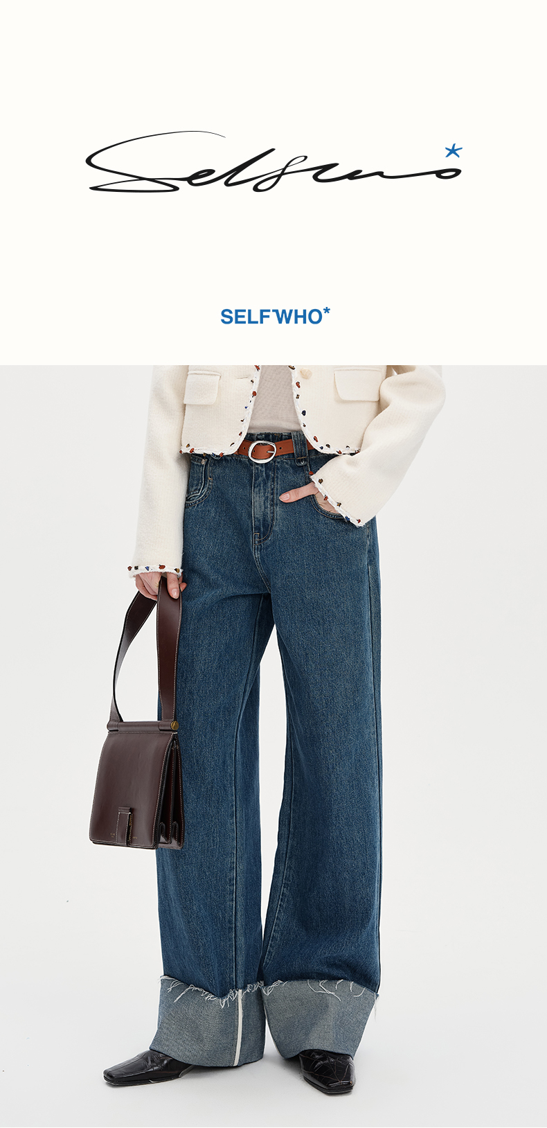 SELFWHO复古水洗蓝色纯棉牛仔裤女秋2024新款折边设计感直筒裤子