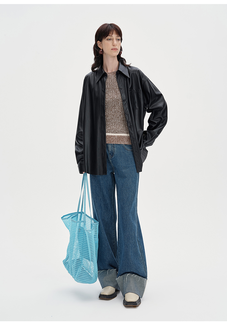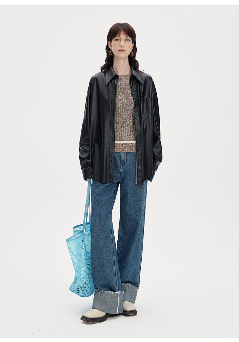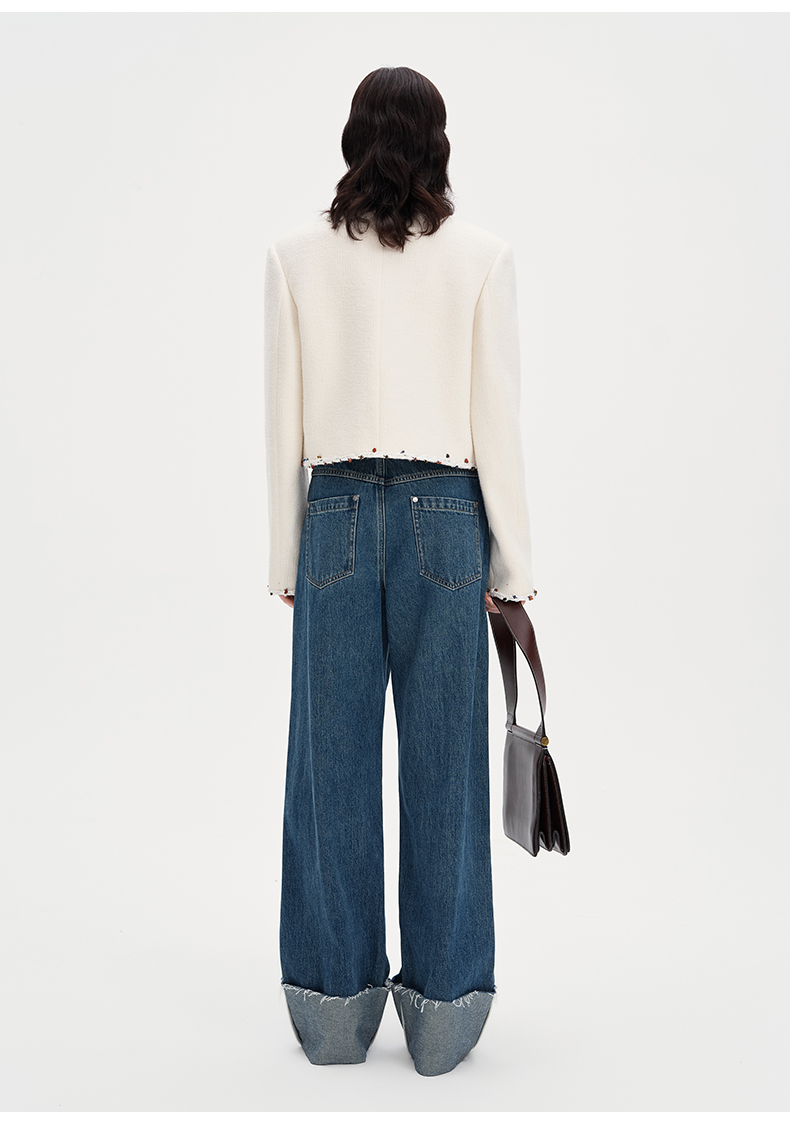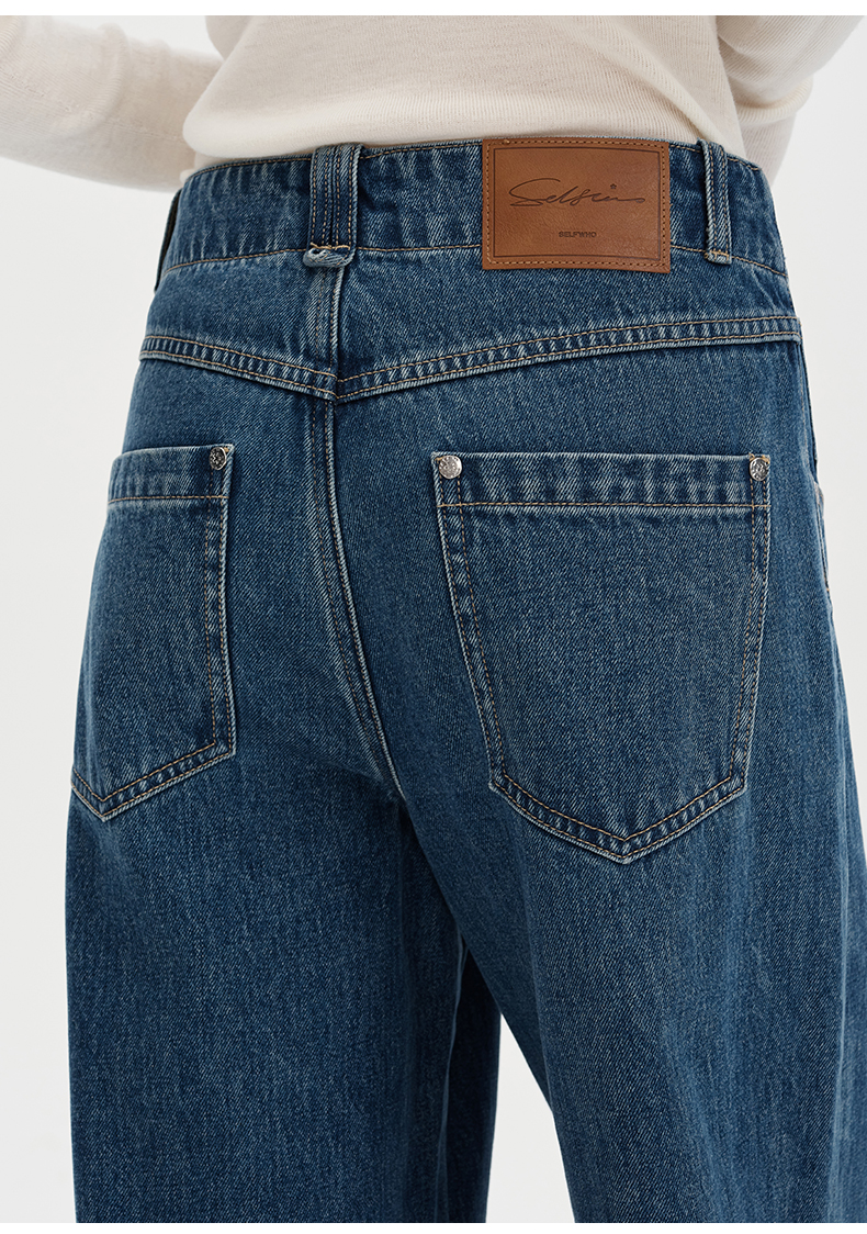 SELFWHO复古水洗蓝色纯棉牛仔裤女秋2024新款折边设计感直筒裤子