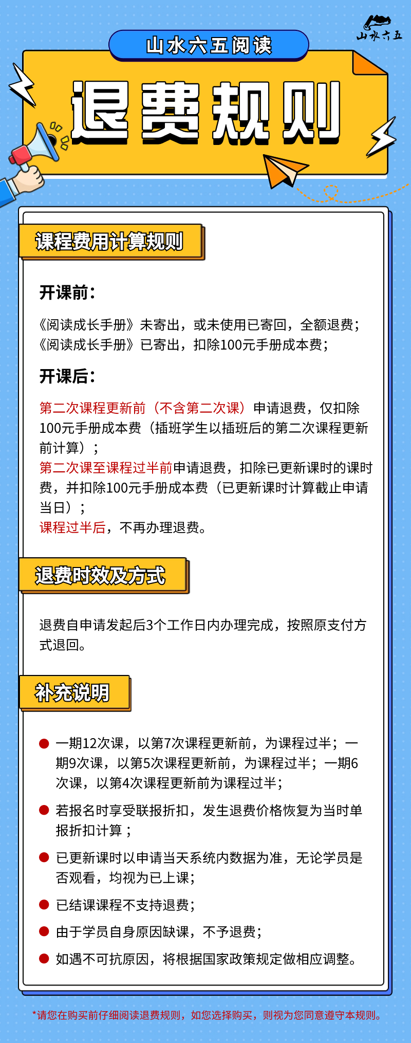 第二次课程更新前 (不含第二次课)申请退费,仅扣除100元手册成本费(插班学生以插班后的第二次课程更新前计算);