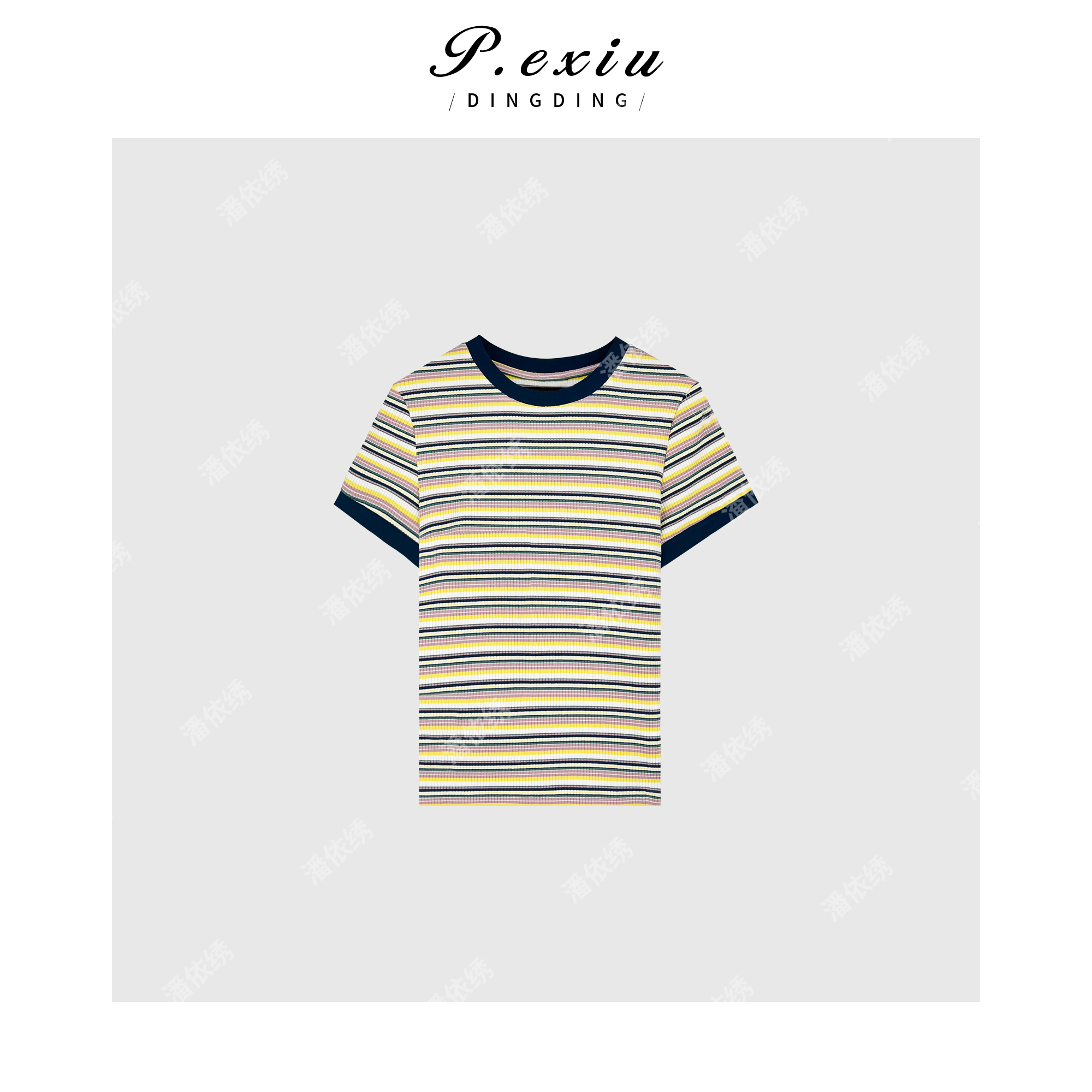 04-3潘依绣丁丁宠粉彩虹条纹撞色韩版短袖T恤Q4763