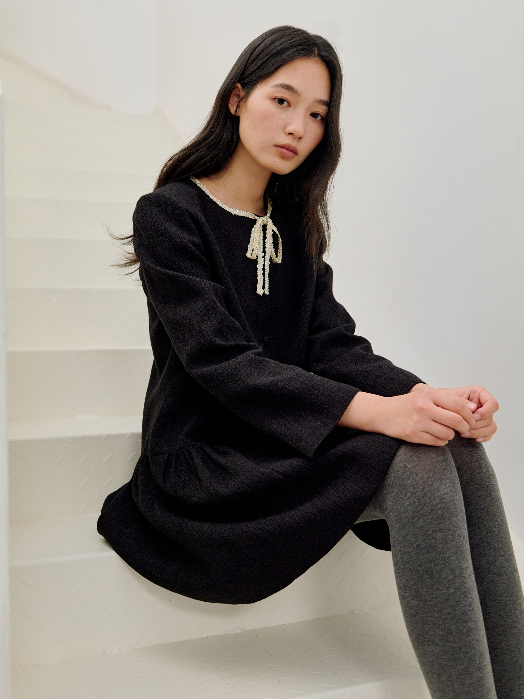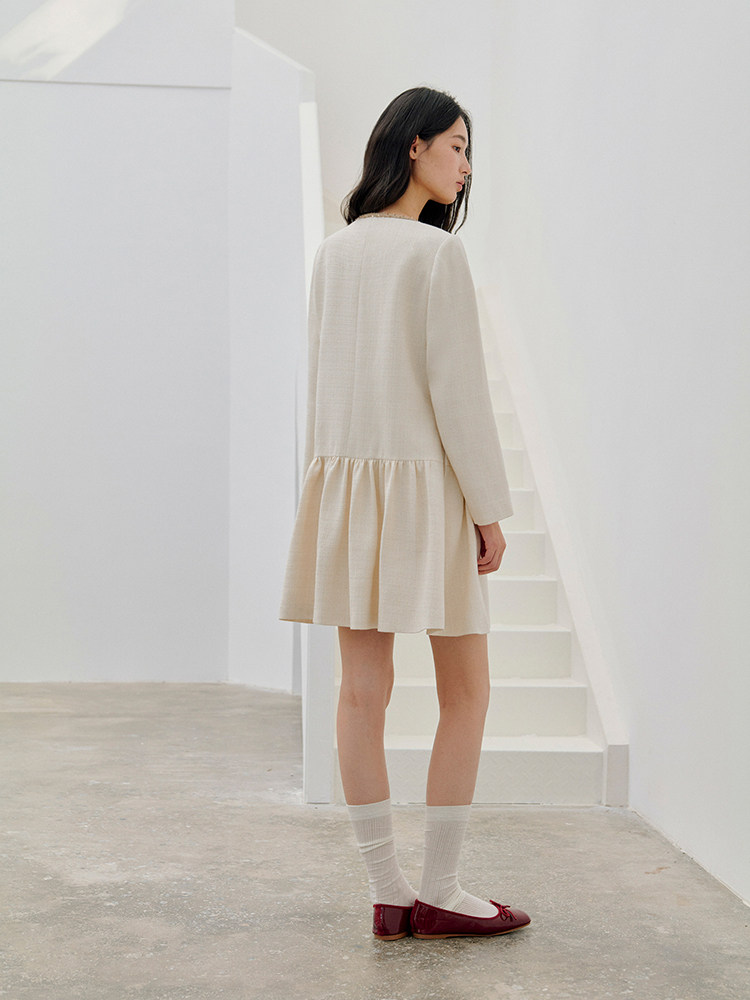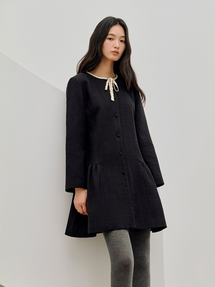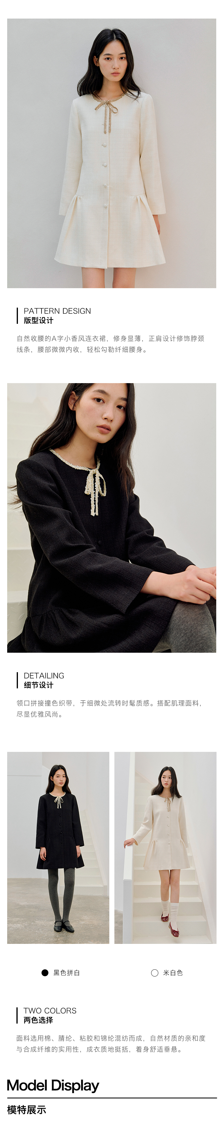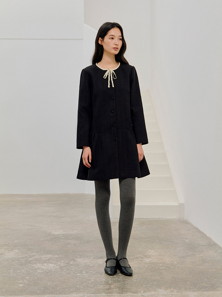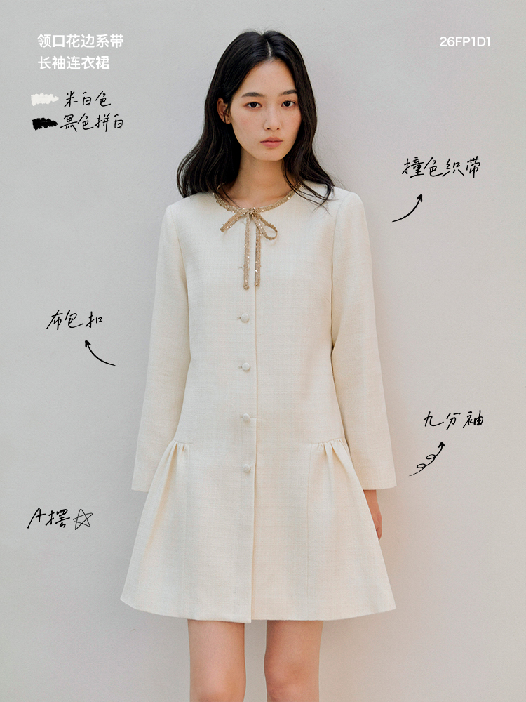 ForPoem 现货 26/SS原创设计领口花边系带小香风气质长袖连衣裙