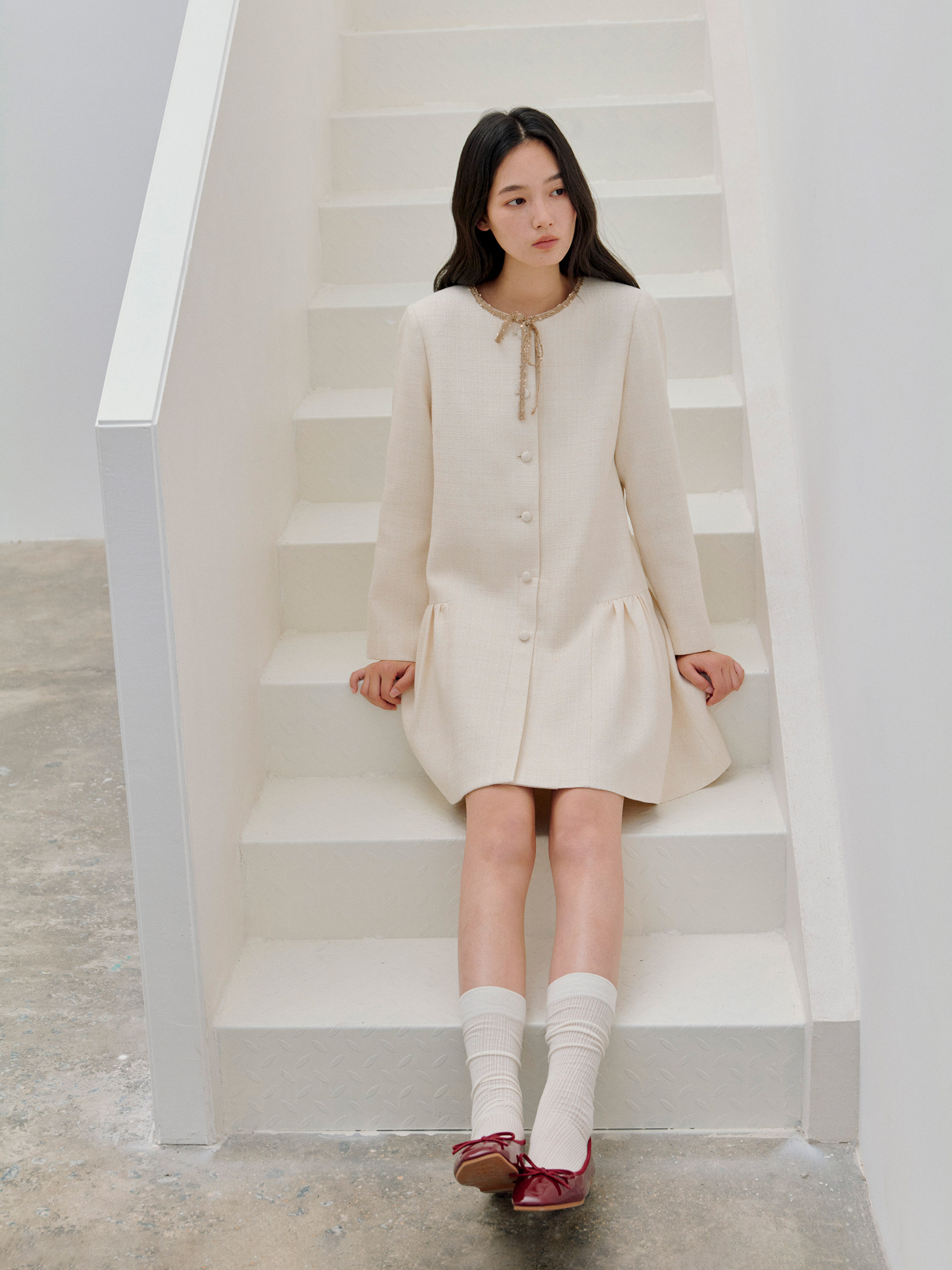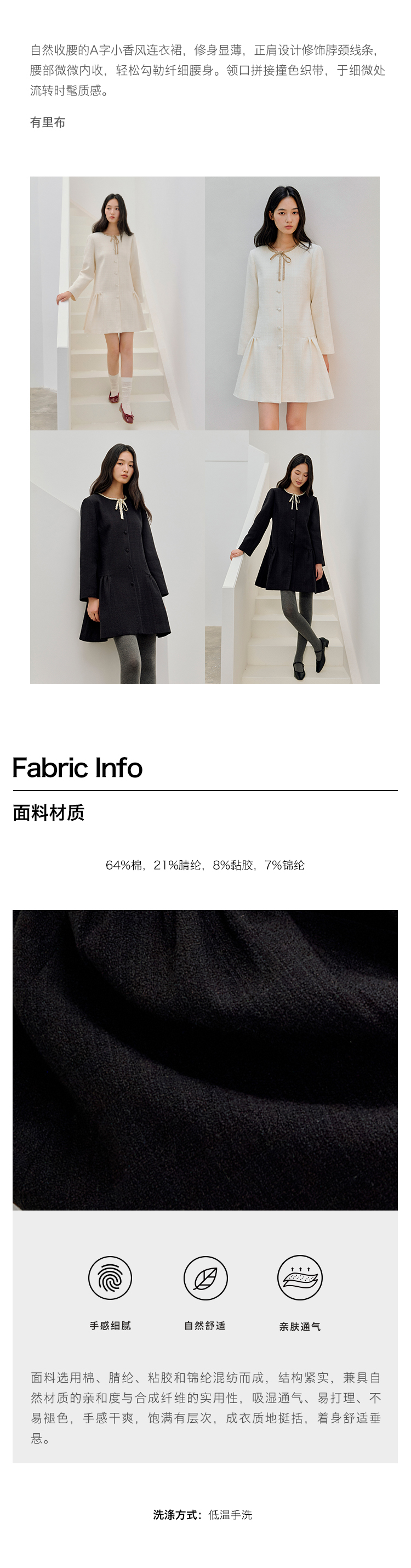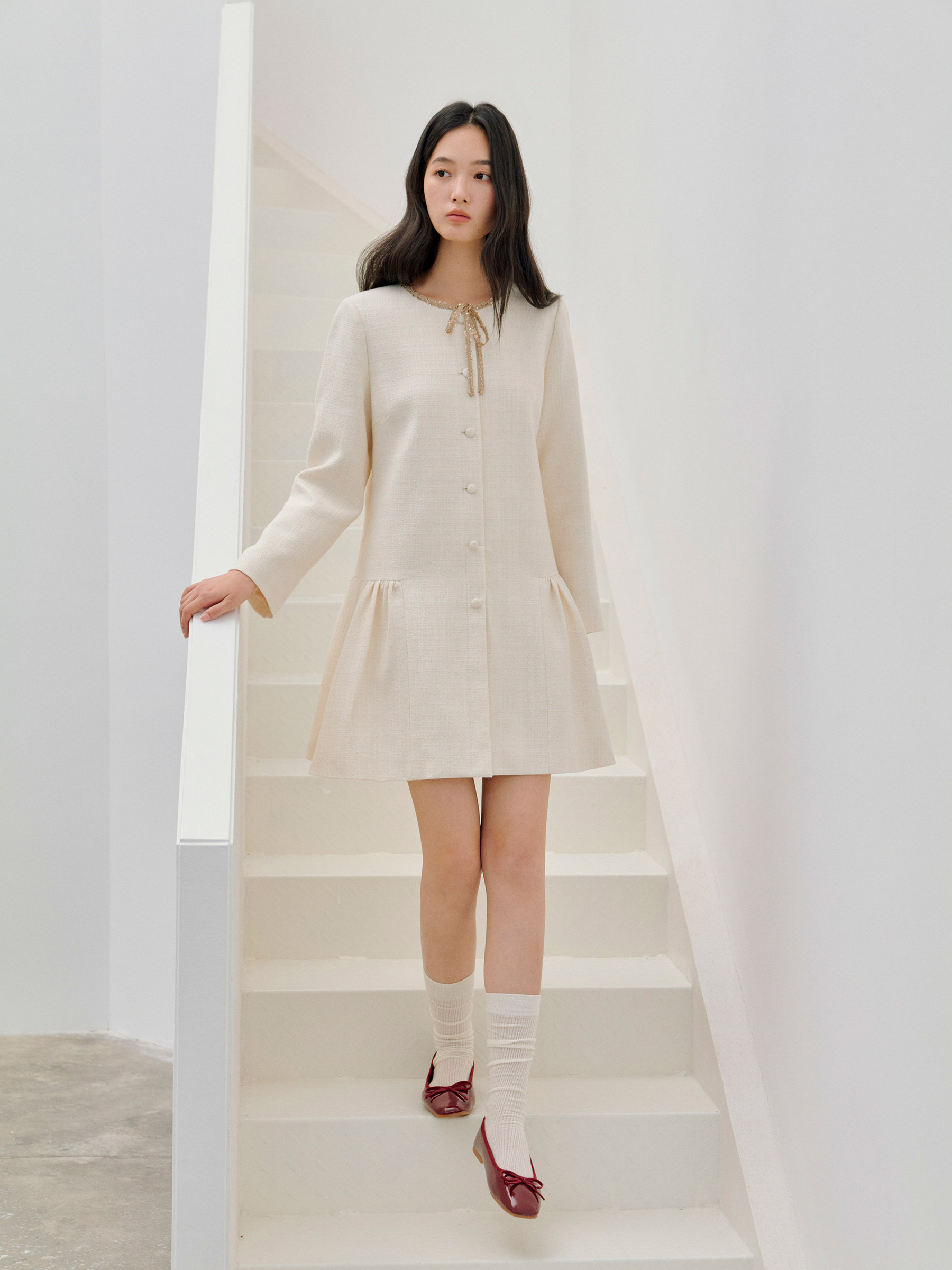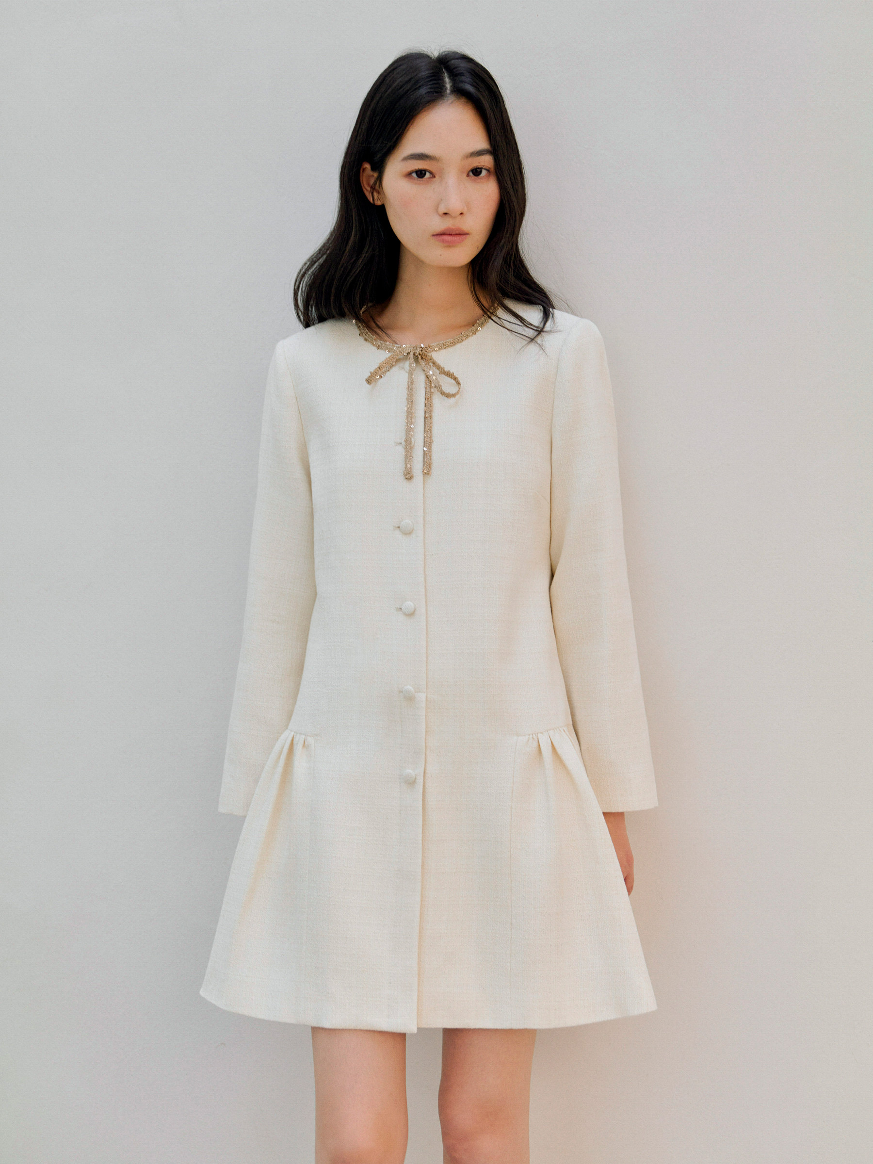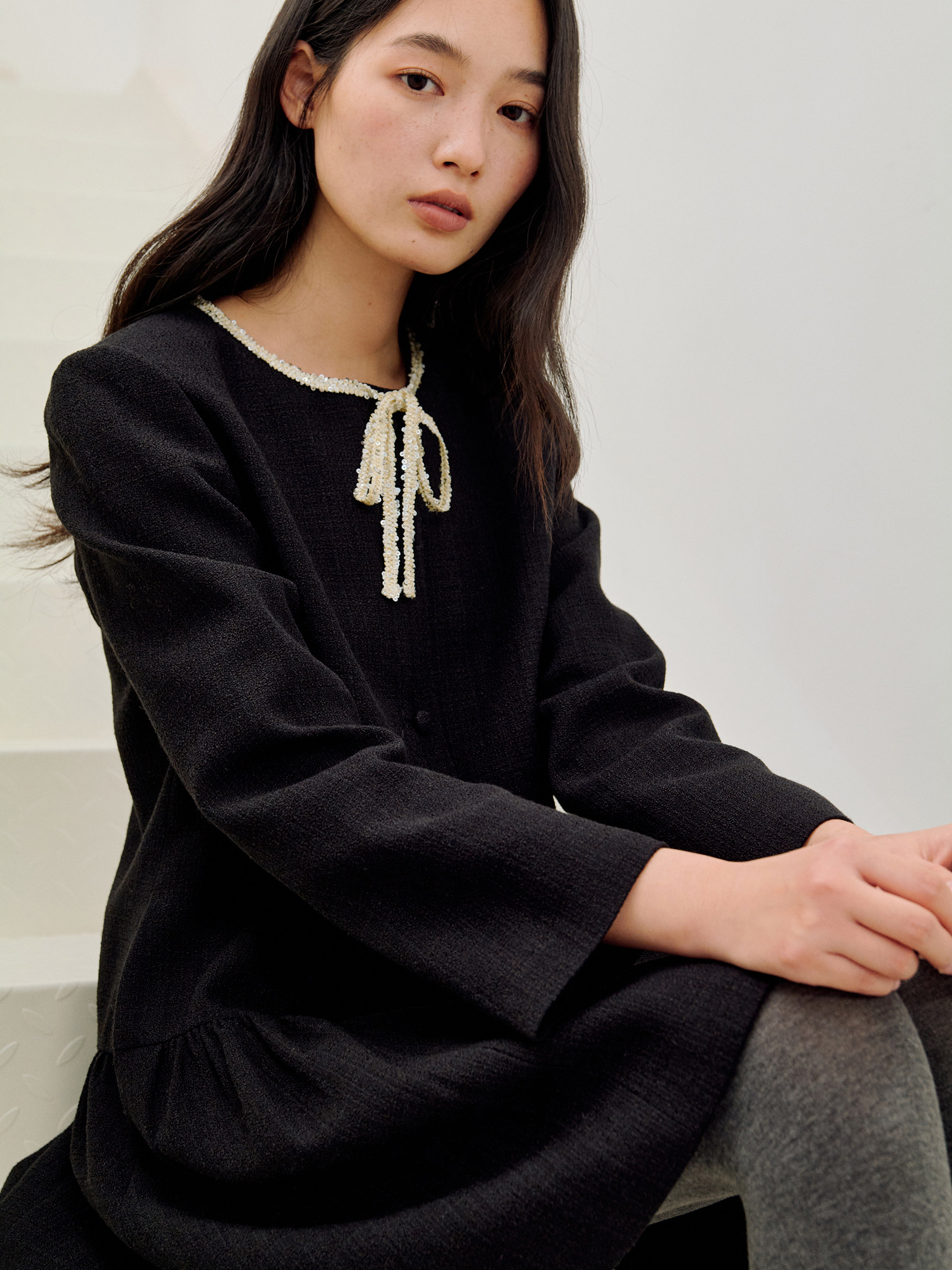 ForPoem 现货 26/SS原创设计领口花边系带小香风气质长袖连衣裙