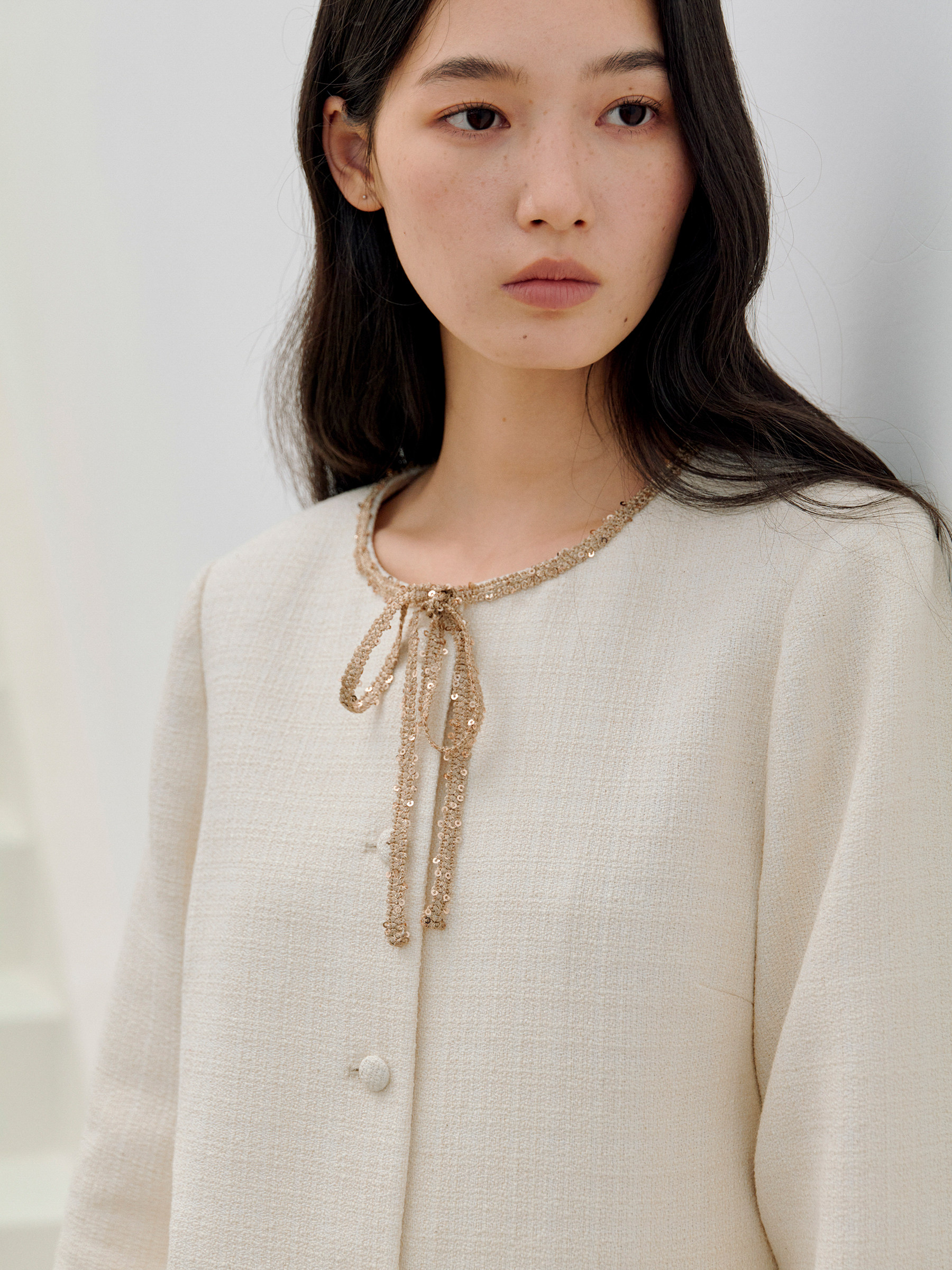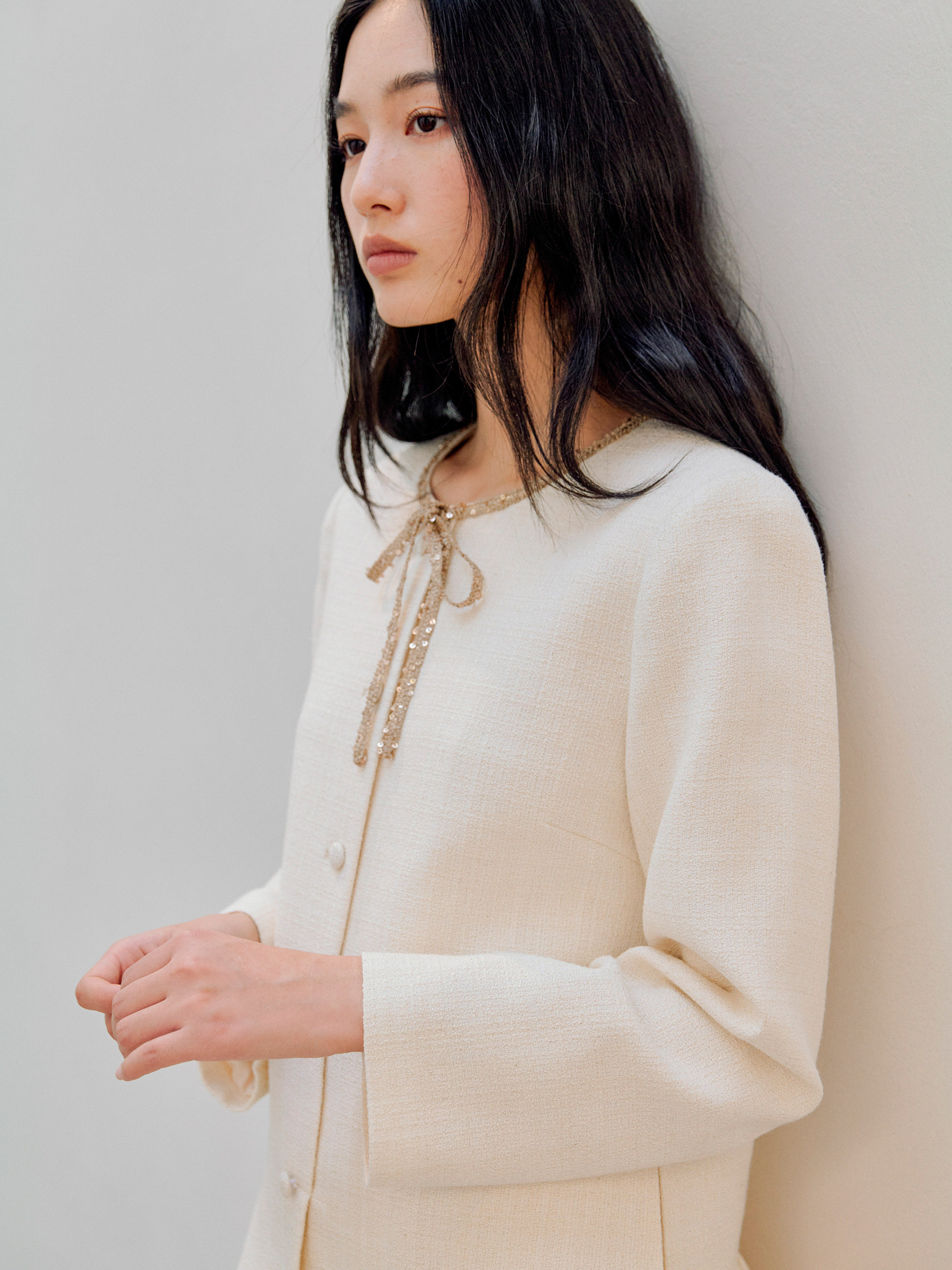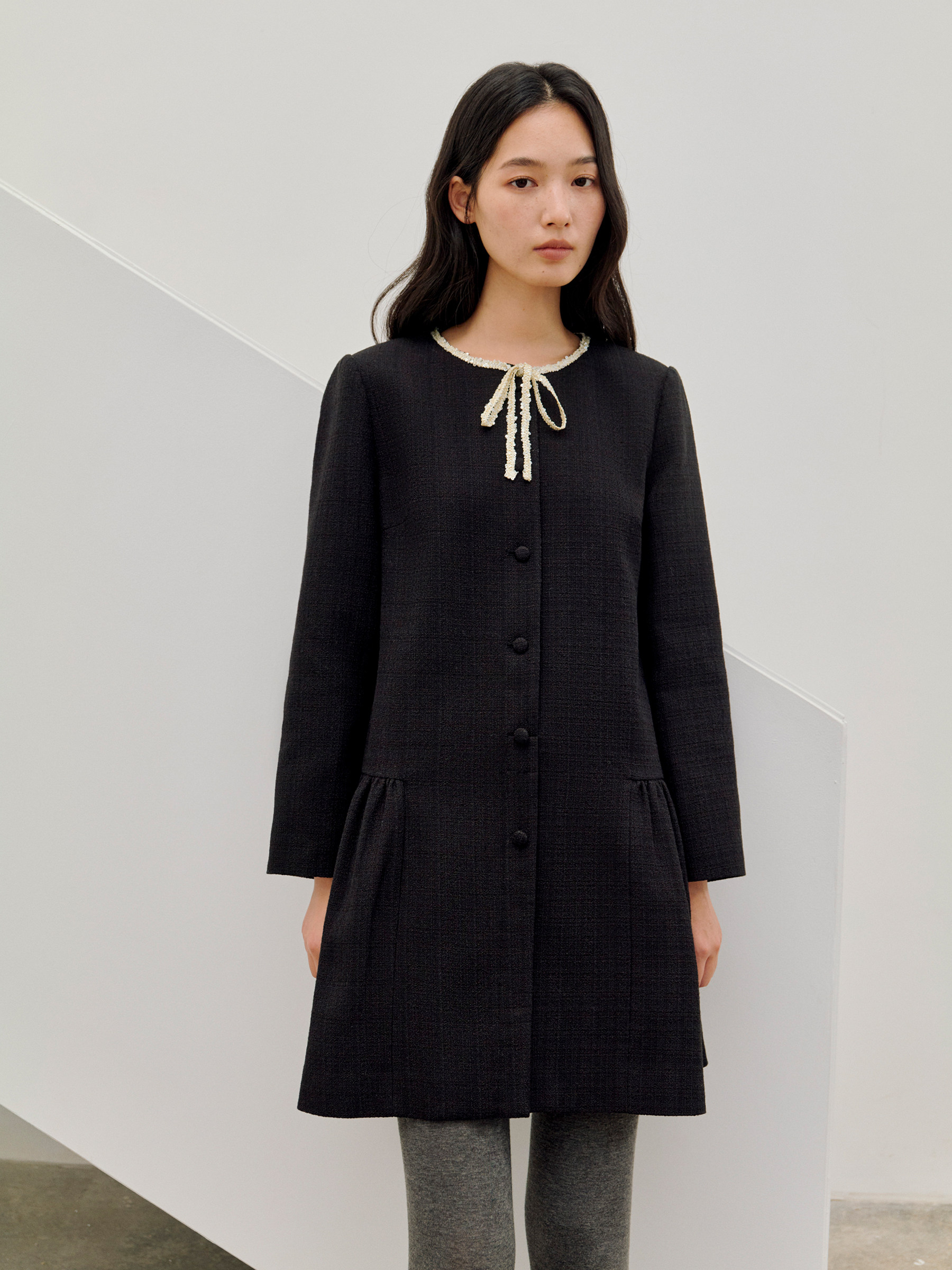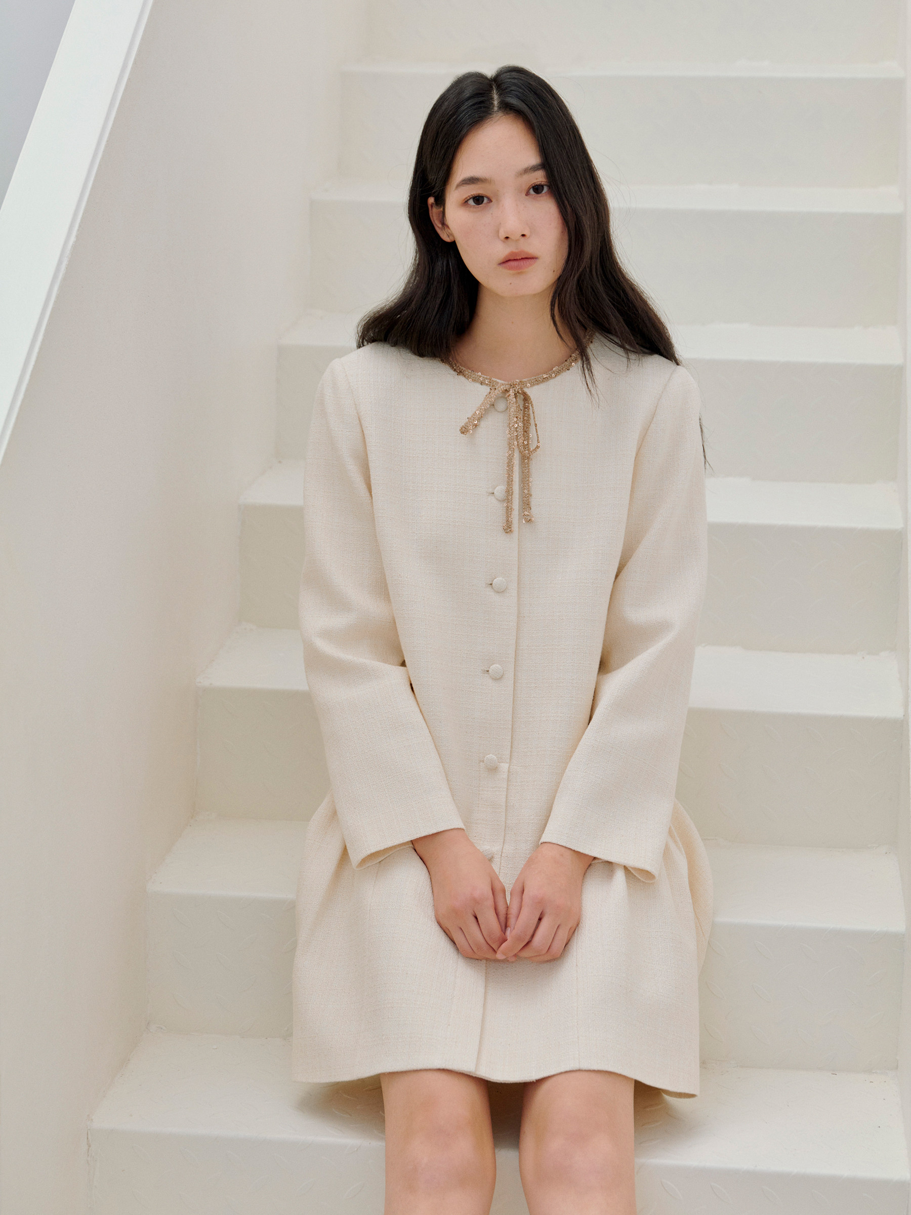 ForPoem 现货 26/SS原创设计领口花边系带小香风气质长袖连衣裙