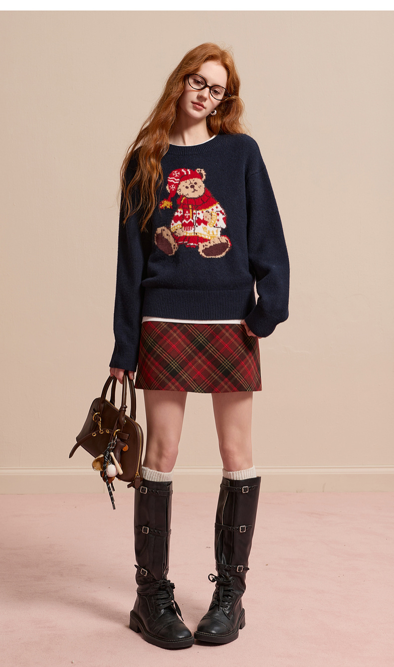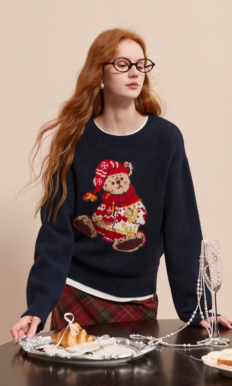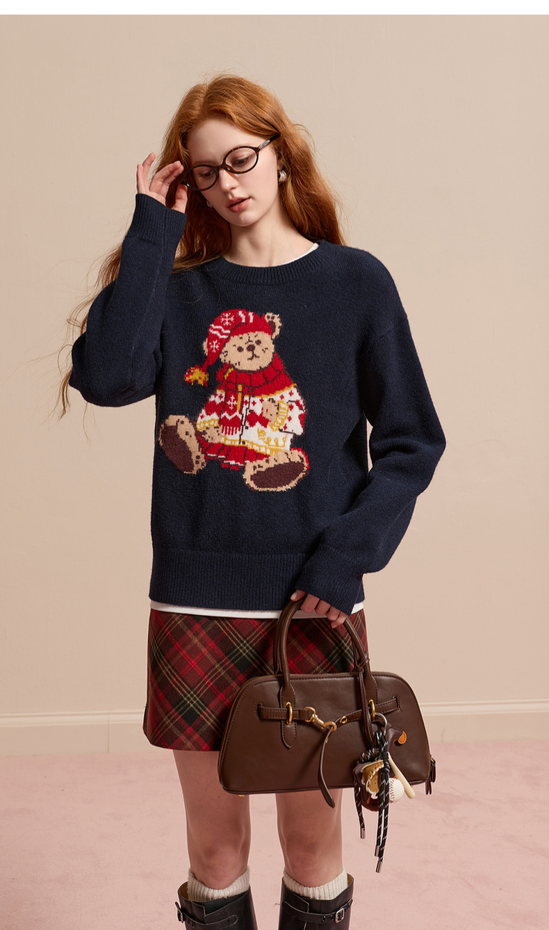 三彩2025冬季新款慵懒宽松圆领提花针织衫长袖套头衫上衣显瘦M
