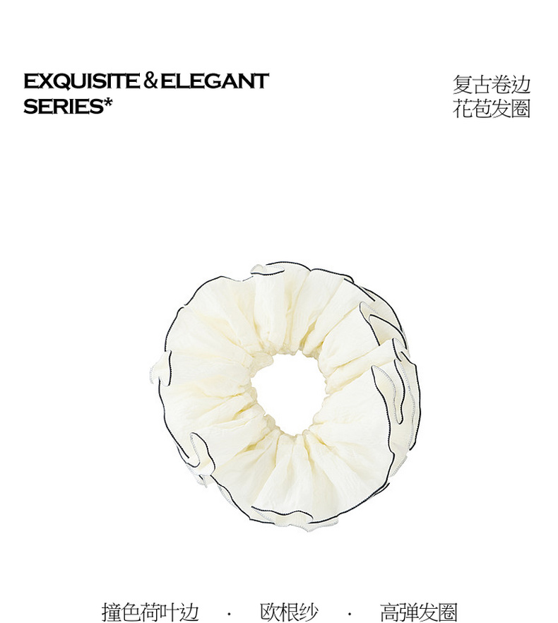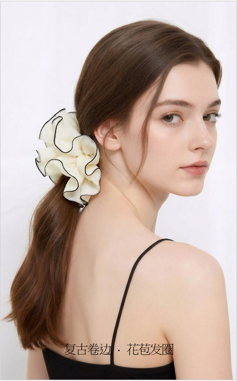 三彩2026新款米白撞色荷叶边花苞发圈高弹欧根纱氛围感通勤约会女