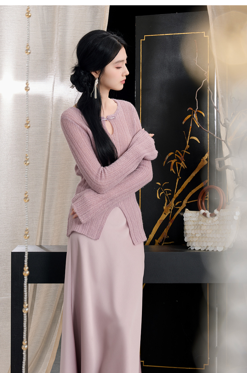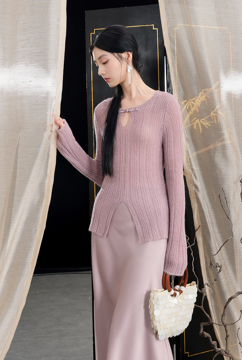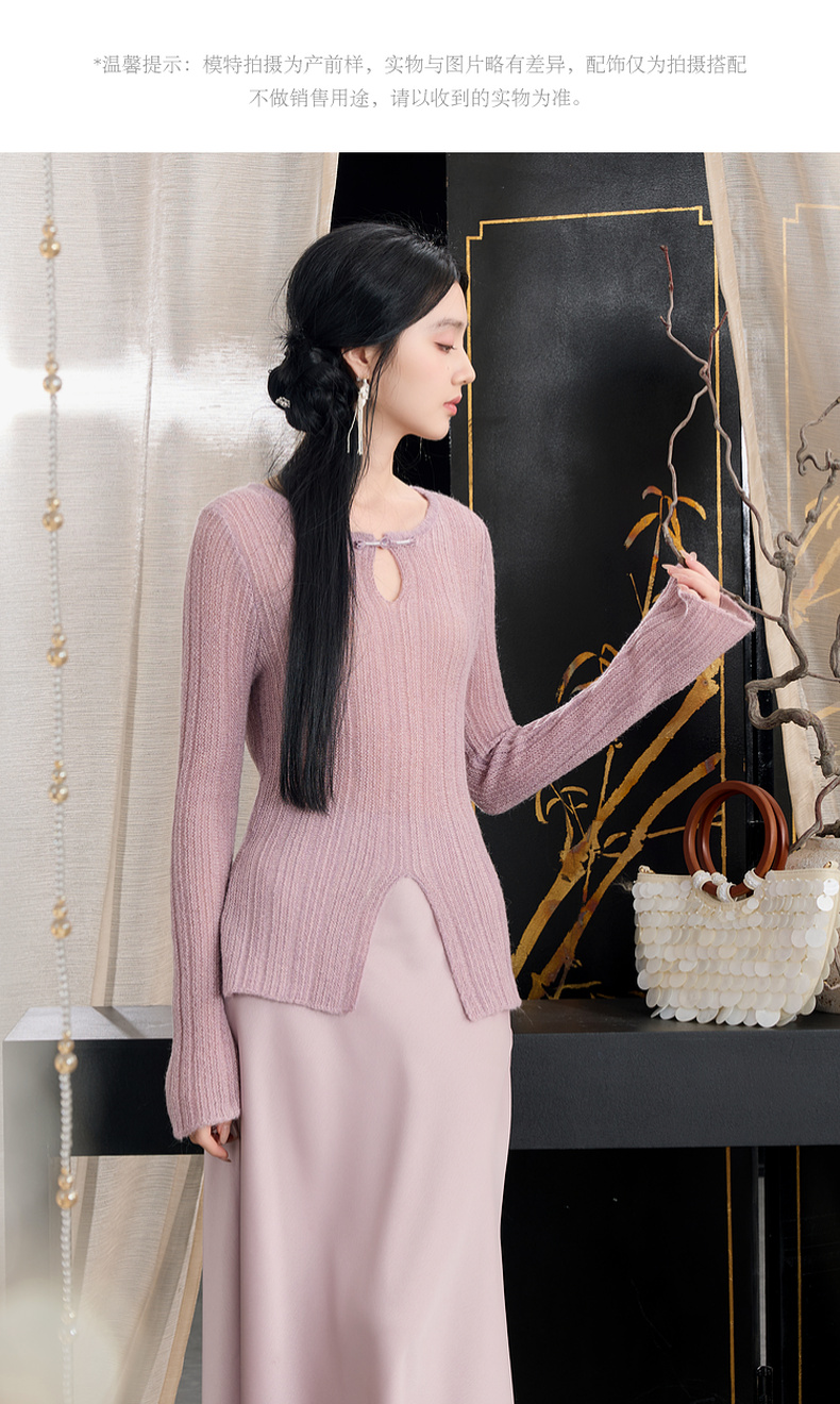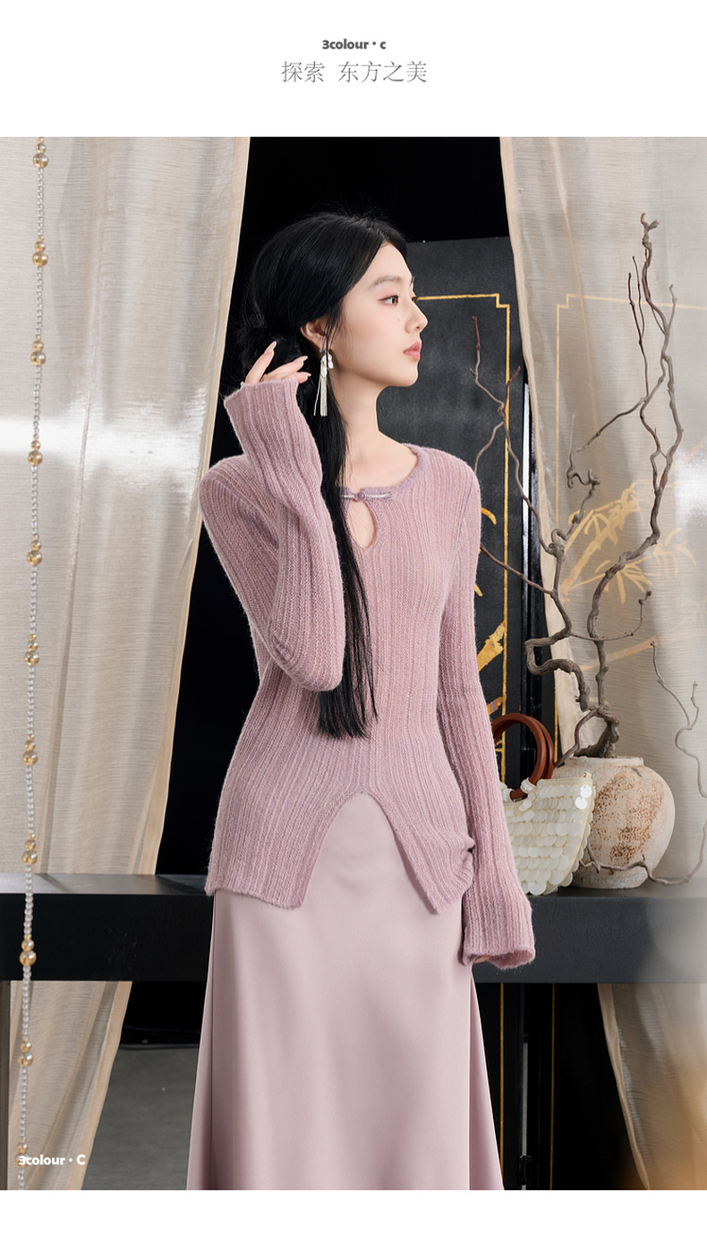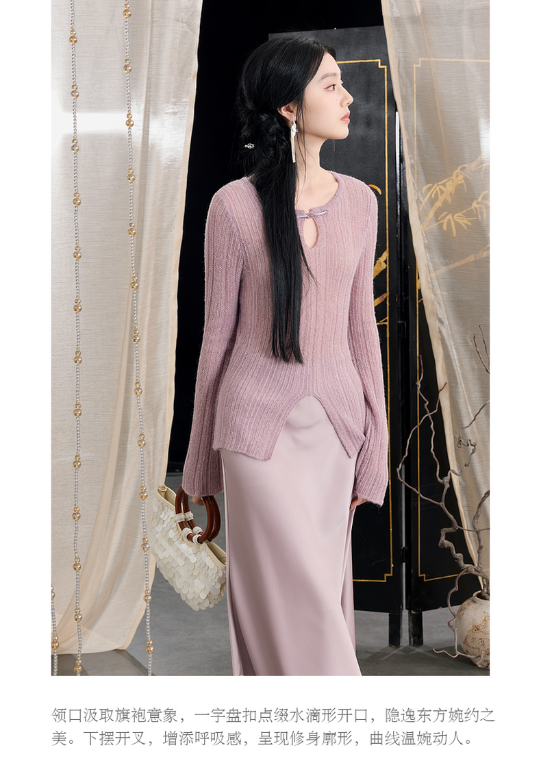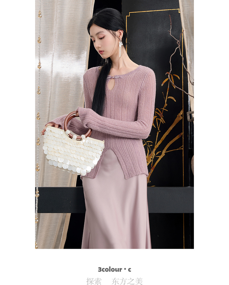 三彩【窈窕佳人】2025秋季新款修身针织衫盘扣开叉毛衫中式C