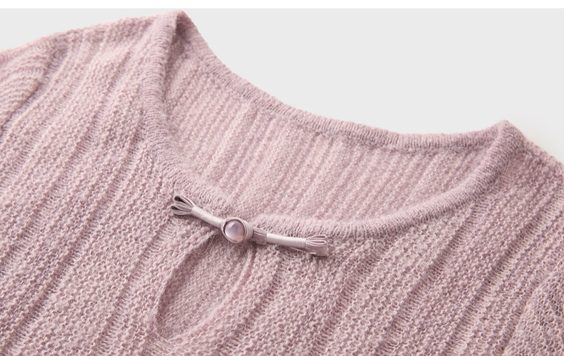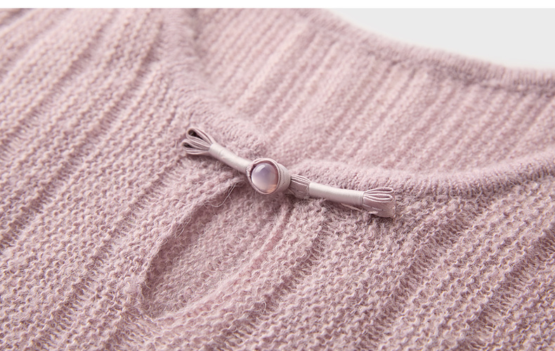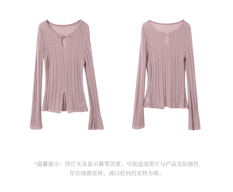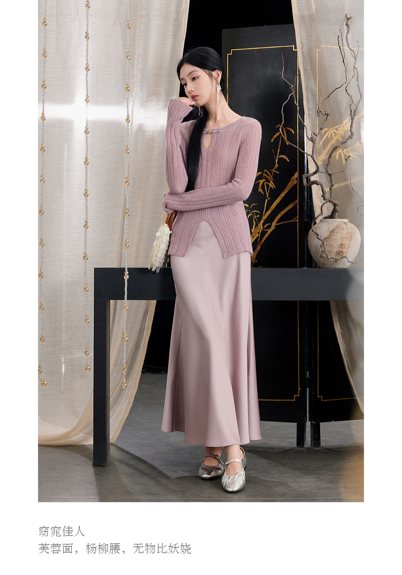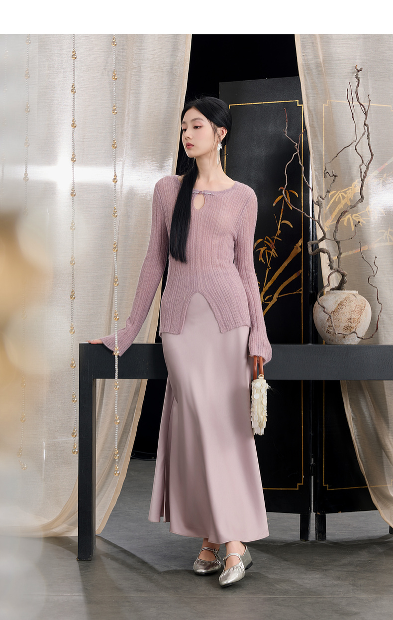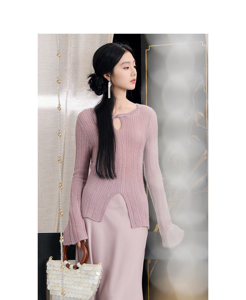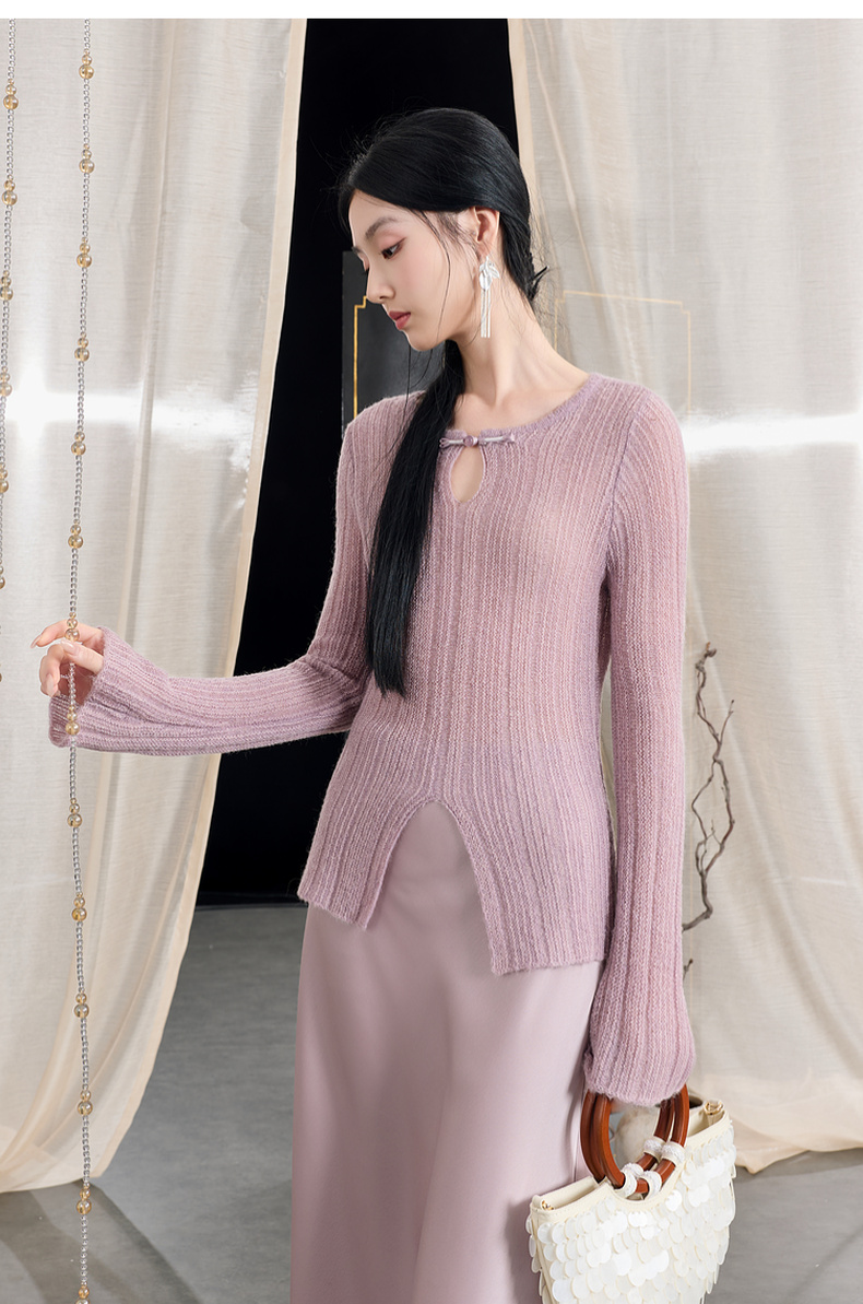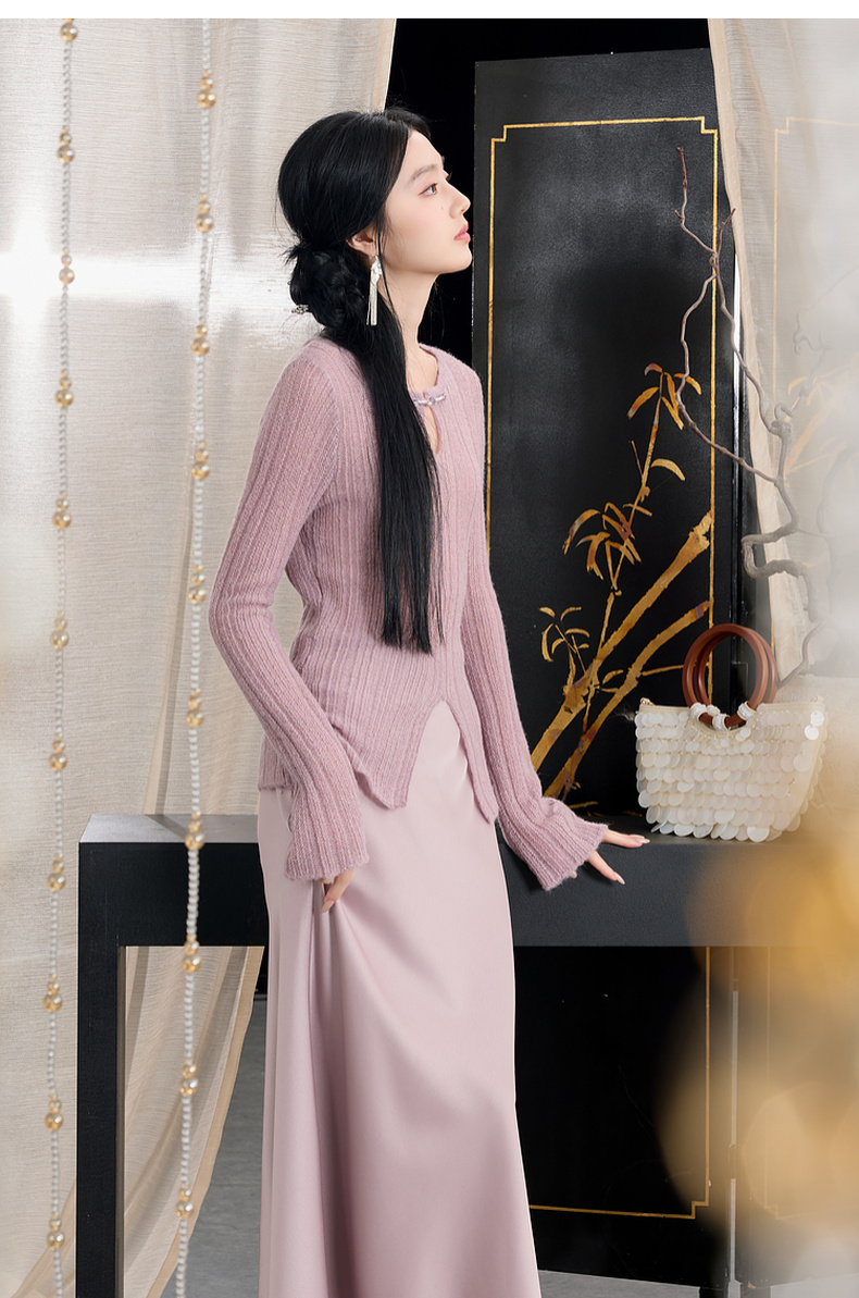 三彩【窈窕佳人】2025秋季新款修身针织衫盘扣开叉毛衫中式C