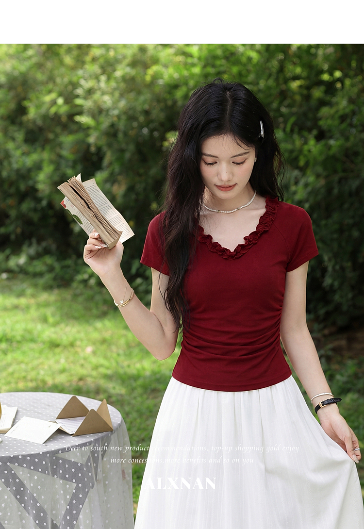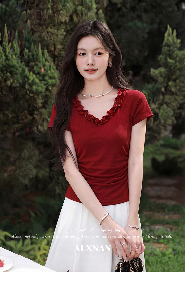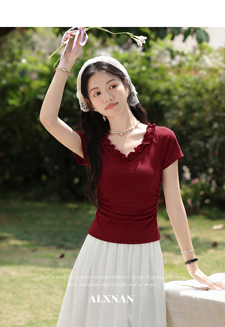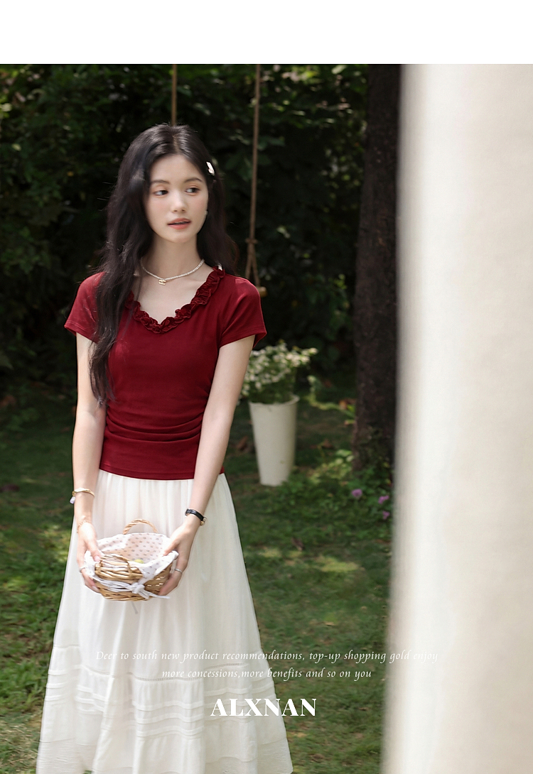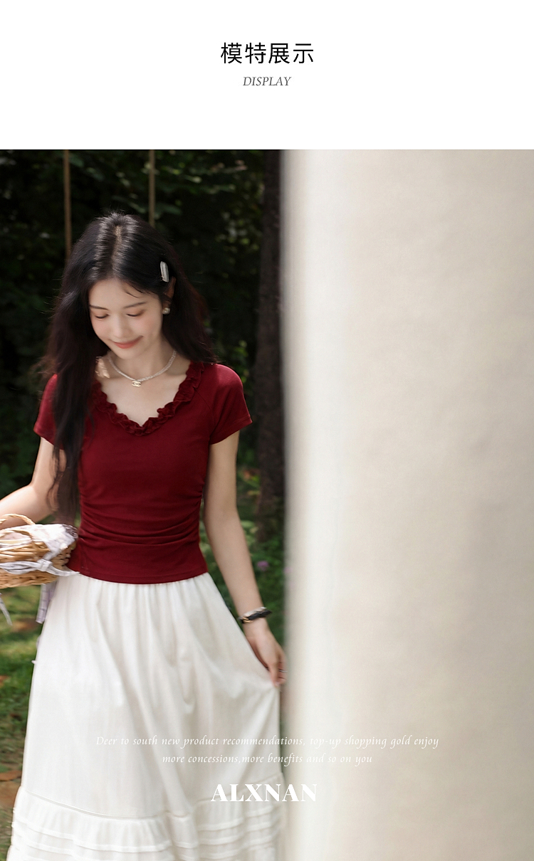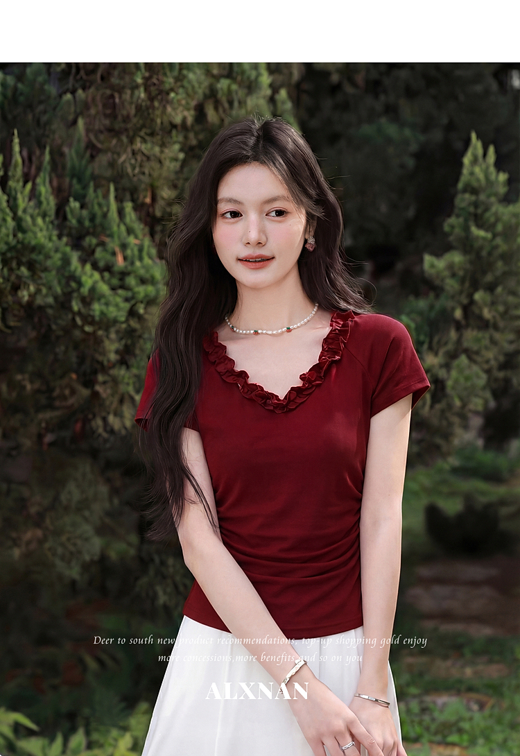 鹿向南「朗姆红茶」复古红色V领显瘦上衣女士夏季修身气质短袖T恤