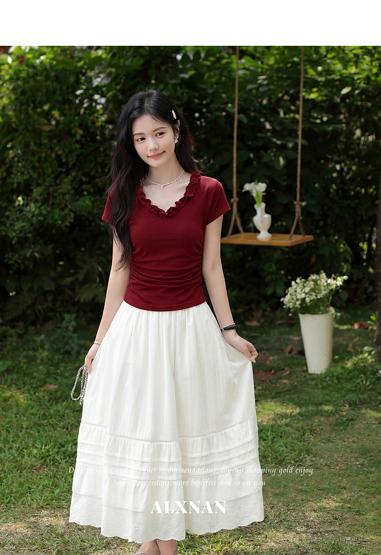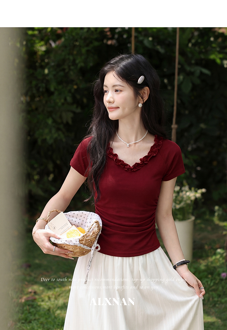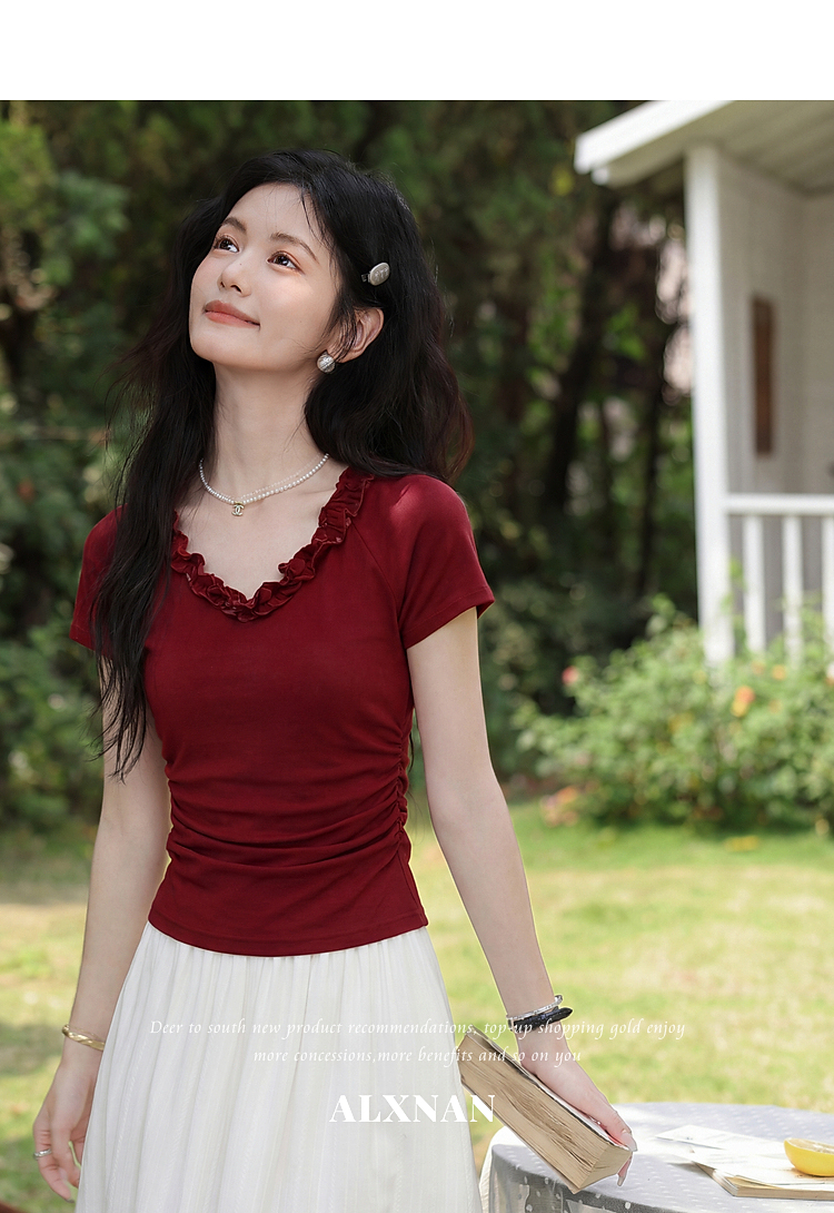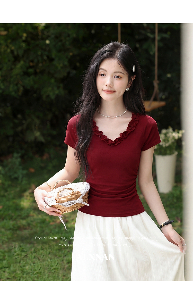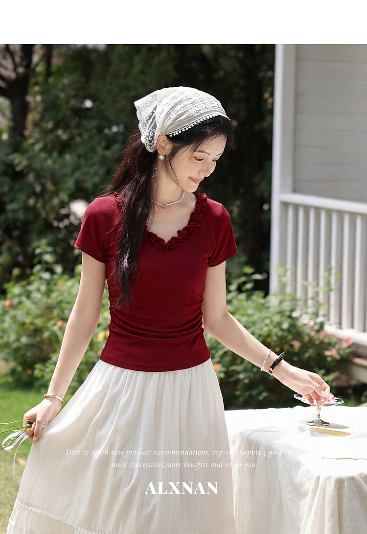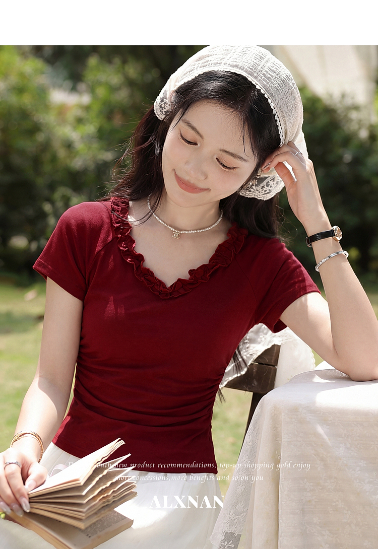 鹿向南「朗姆红茶」复古红色V领显瘦上衣女士夏季修身气质短袖T恤