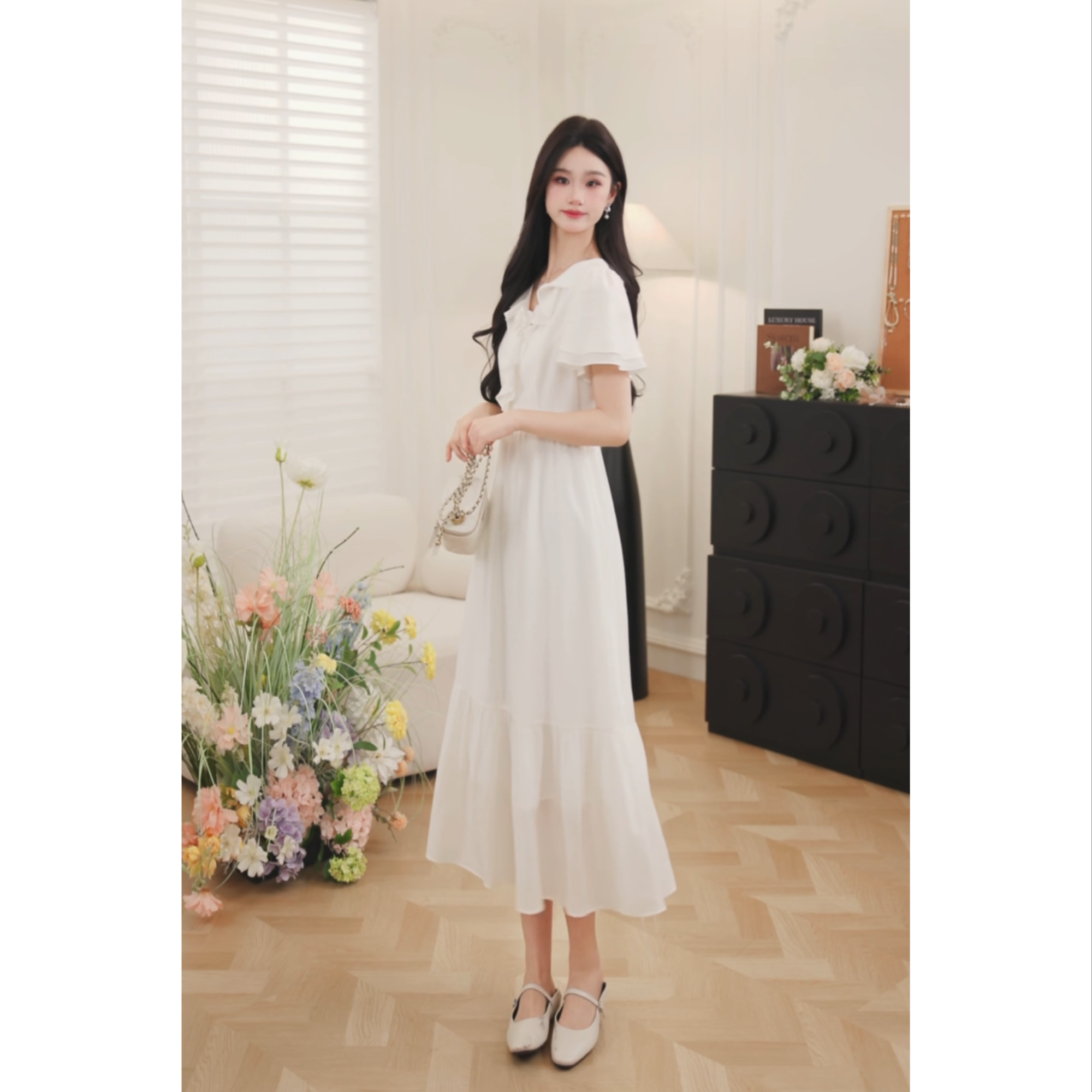 鹿向南「海棠未眠」法式设计感短袖连衣裙女夏气质白月光收腰长裙 商品图0