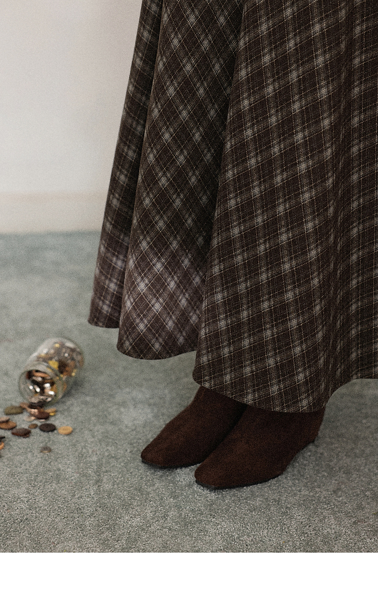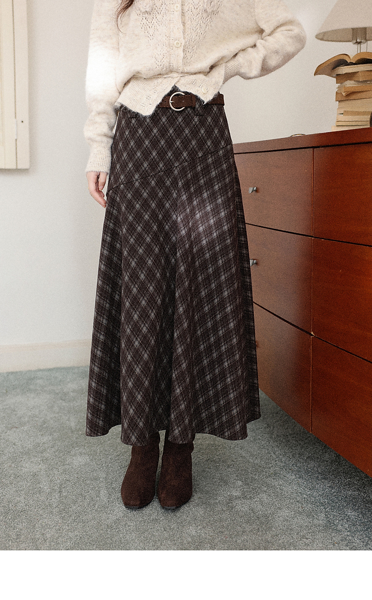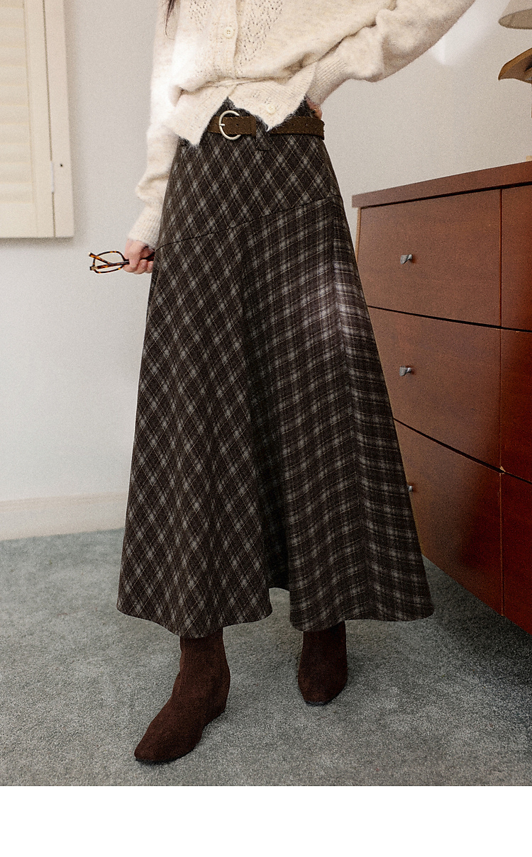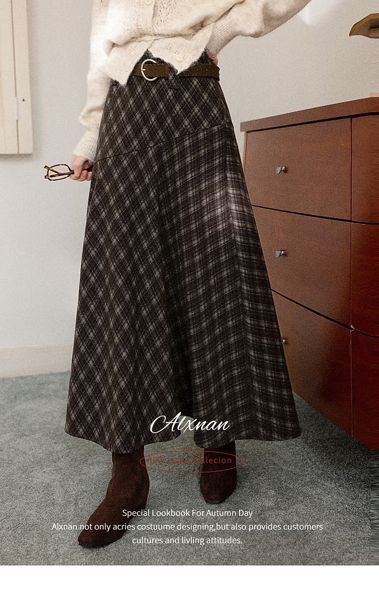 鹿向南「巴尔罗岛」咖色复古格纹a字半身裙女秋冬小个子高腰长裙
