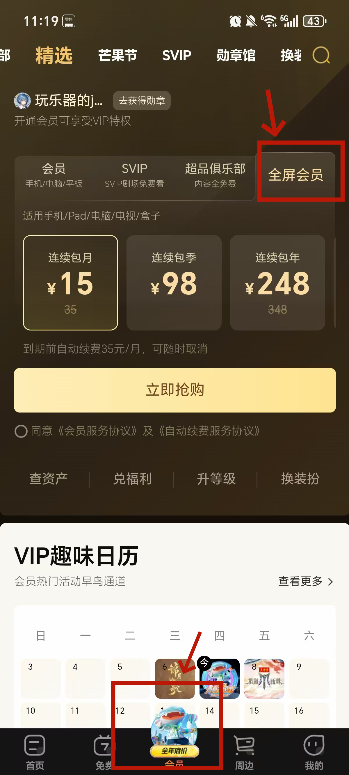 1. 在芒果TV app→ 使用手机号验证码登录 →会员→全屏会员位置。