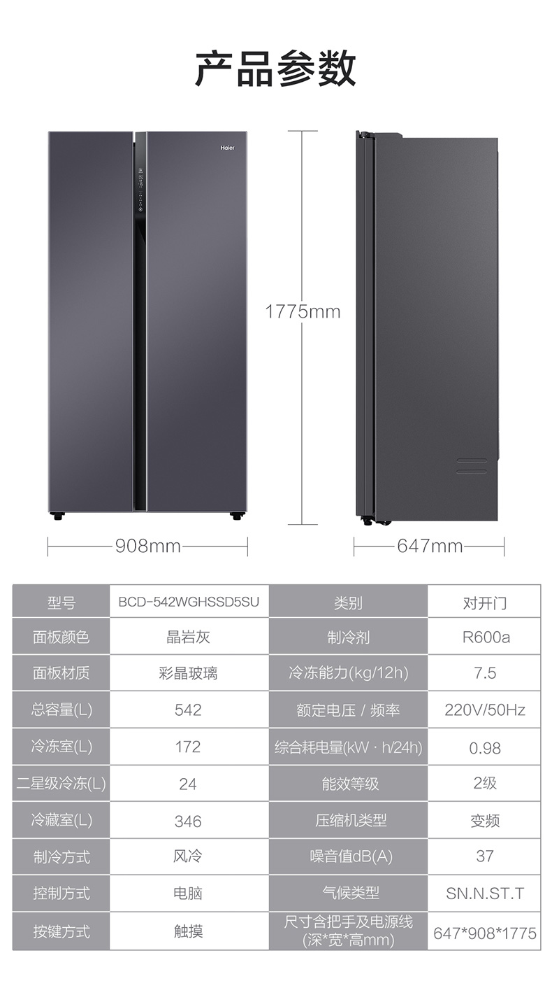 海尔542L对开门冰箱风冷无霜家用家电大容量官方旗舰店BCD-542WGHSSD5SU