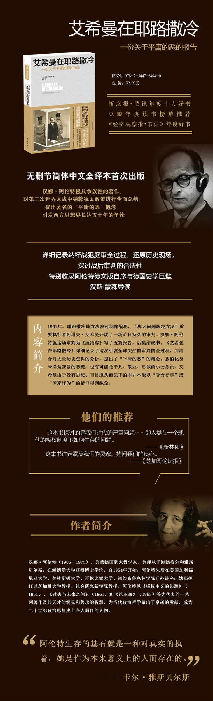 艾希曼在耶路撒冷:一份关于平庸的恶的报告 汉娜·阿伦特极具争议性的著作,简体汉译无删节全本首次出版。深刻反思纳粹犹太政策,提出著名的“平庸的恶”概念,引发西方思想界长达五十年的争论