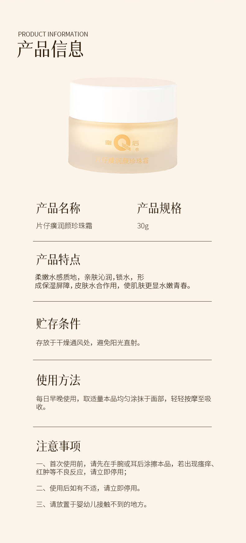 【新品 】片仔癀皇后牌润颜珍珠霜 保湿舒缓 (含片仔癀成分) 30g