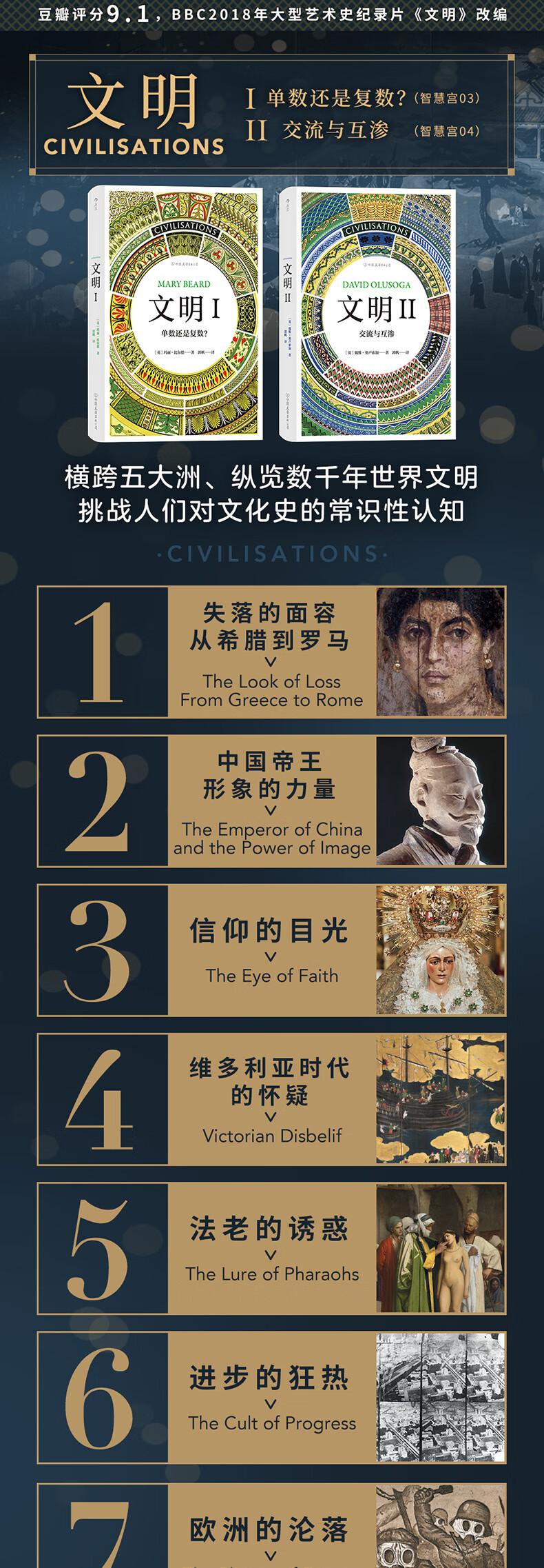 《文明I》一书脱胎于玛丽·比尔德应英国广播公司邀约撰写的纪录片Civilisations第2集和第四集的内容。这个纪录片项目着重挑战了之前文化界对“单一的西方文明”(the civilisation)的推崇,将视野扩大到了世界上更多的国家及其辉煌灿烂的文化遗产。 比尔德围绕历史上各种文明对“人体”和“神明”两种形象的呈现展开论述,并介绍了古人和今人围绕这些形象有过的诸多讨论和争议,在展示或精美、或朴拙、或华丽、或极简的各种形象艺术的同时,她还时时敦促她的读者去思考和质疑我们长期以来被灌输的那些关于何为艺术中的“美”,何为信仰中的“诚”的陈词滥调,以及主流艺术史观里有关艺术风格流变的常规叙事。比尔德在这本书里有力地提示我们,形象的力量很大程度上在于其观看者和批评者,而形象的生命只有在后世观者复调式的阐释和批评声音中才得以真正延续。