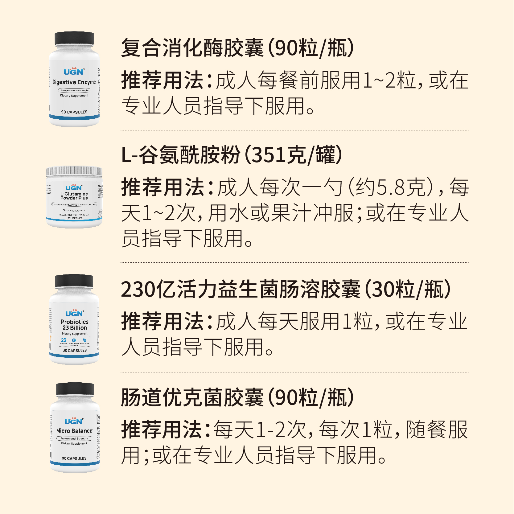 UGN肠道健康组合(消化酶*1瓶+谷氨酰胺粉*1瓶+230亿益生菌*1瓶+优克菌胶囊*1瓶)