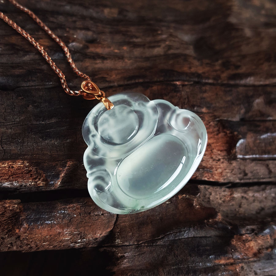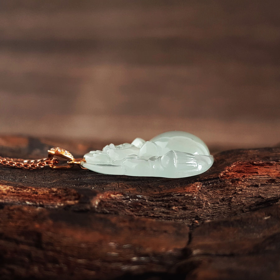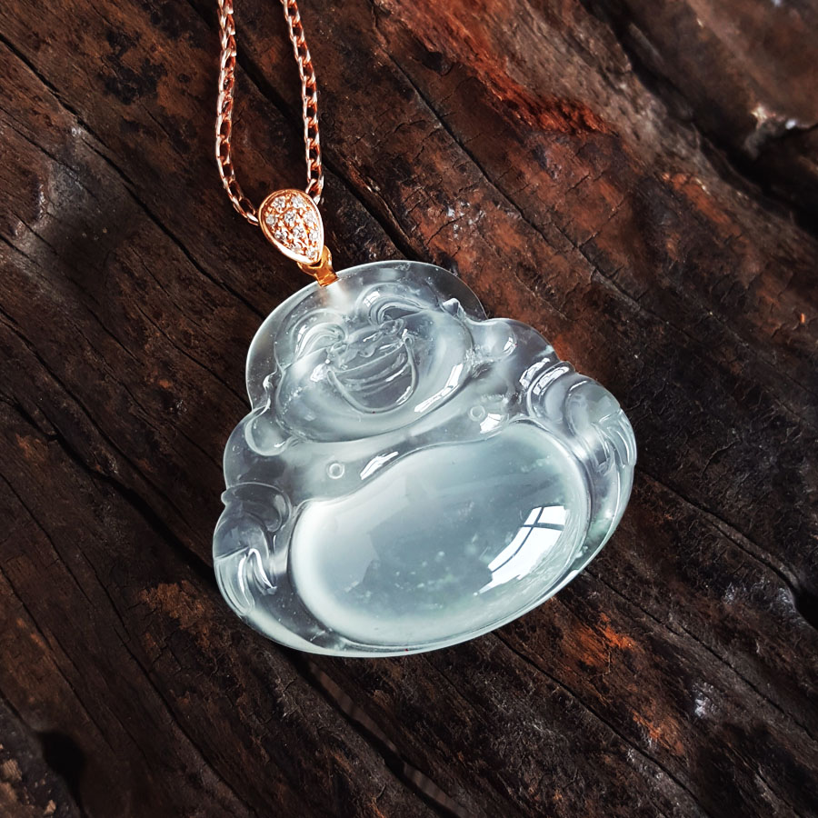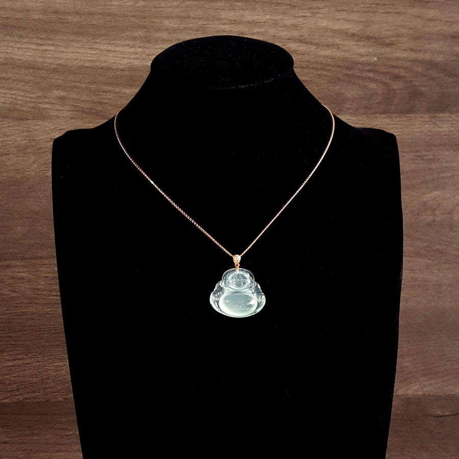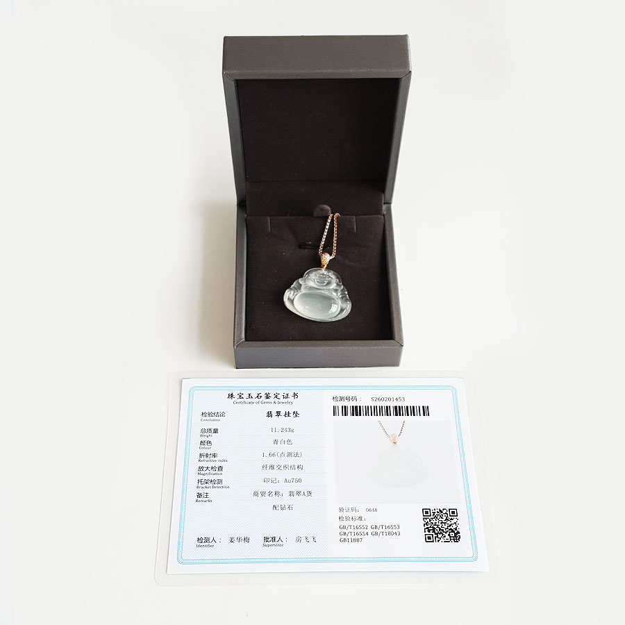 名称 | AU750收藏级玫瑰金镶钻镶天然细腻青白色高冰种起荧佛公翡翠吊坠项链 |
