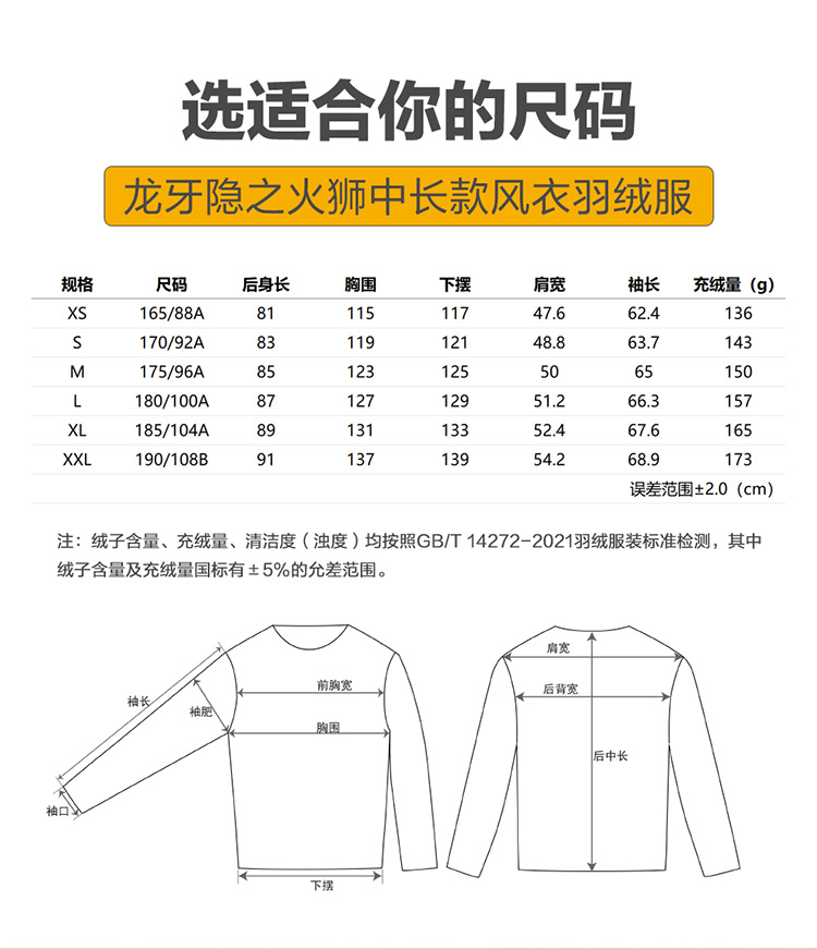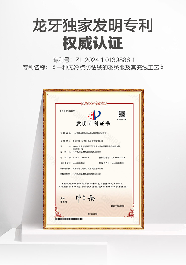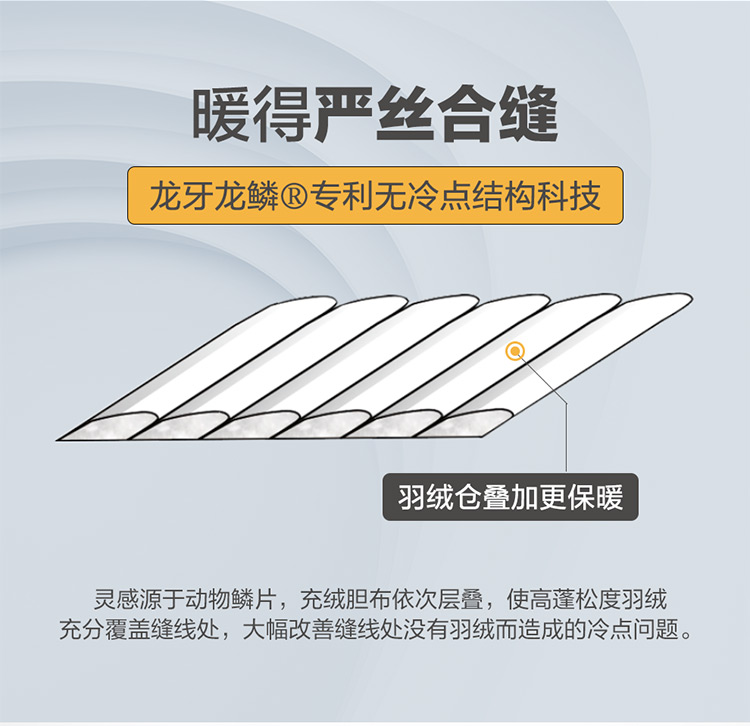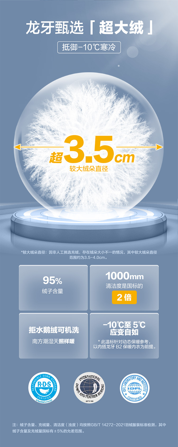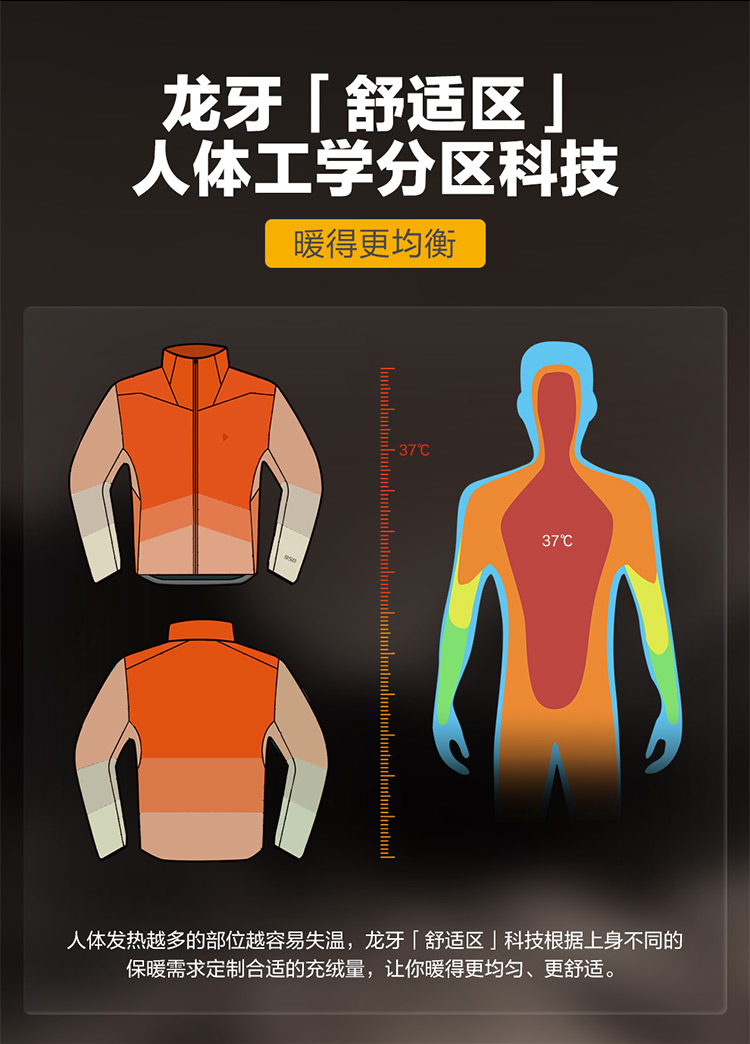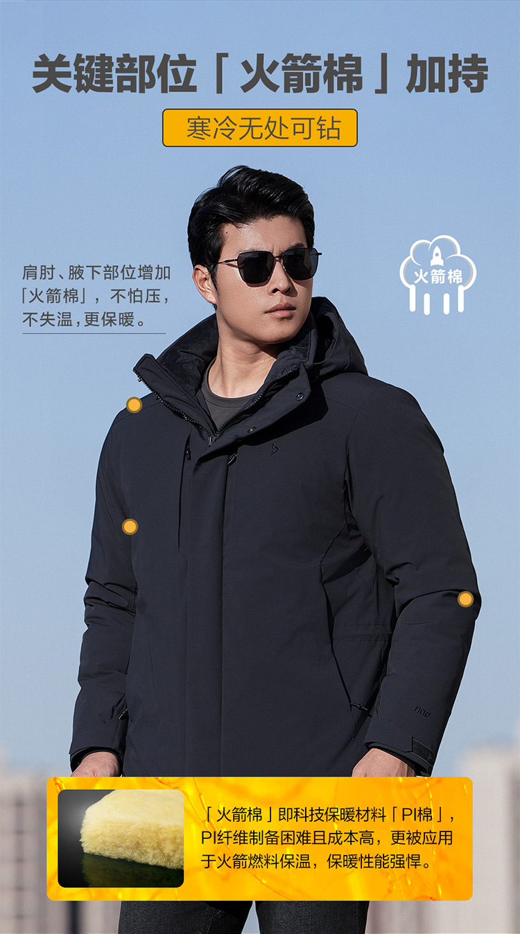 为提升穿着时的保暖性,同时达到更好的透气性与舒适度,龙牙羽绒服会在产品局部拼接少量PI火箭棉,此行为符合国标规定,请放心购买。