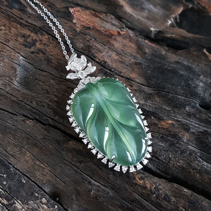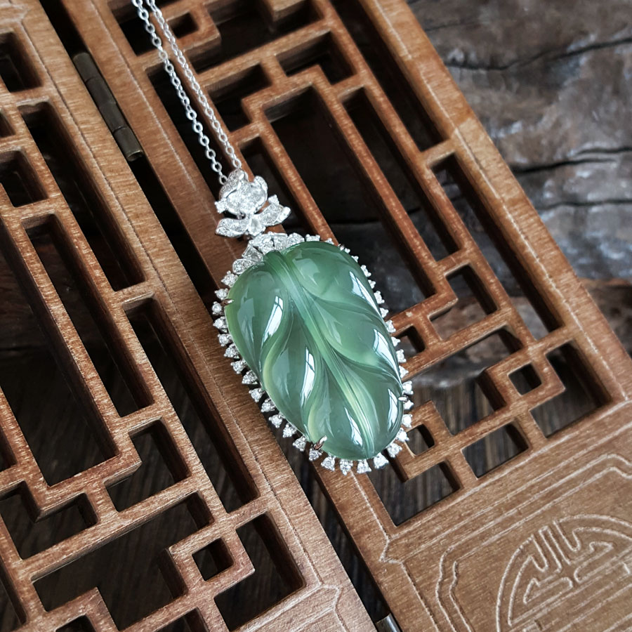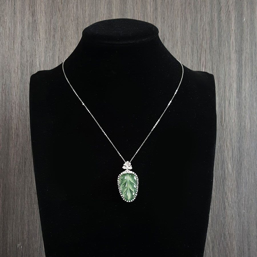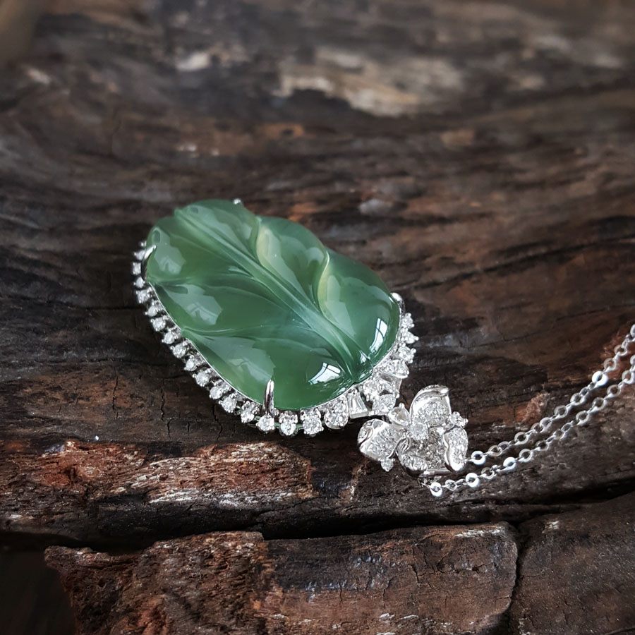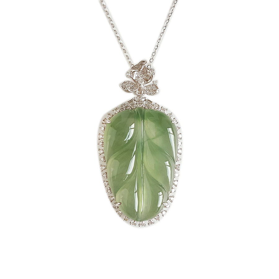 名称 | AU750白金镶天然细腻无纹裂冰种叶子(金枝玉叶)翡翠吊坠项链 |