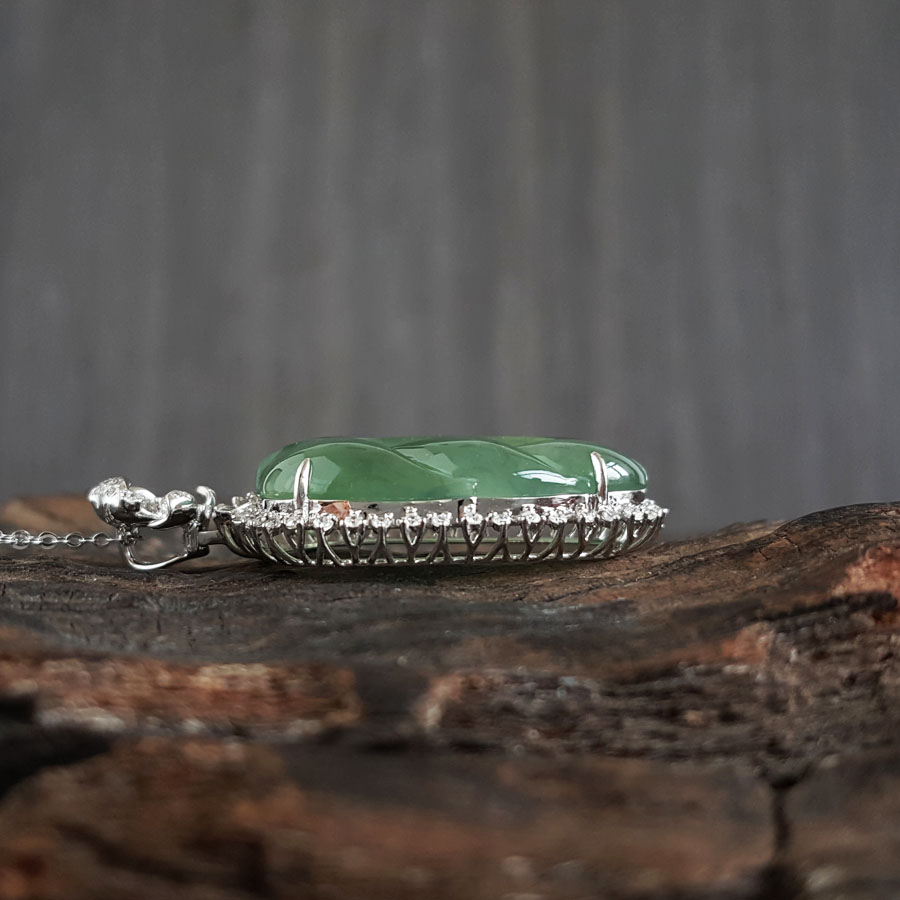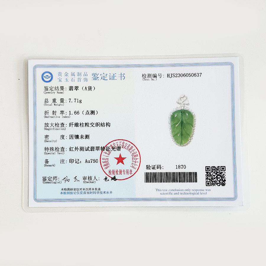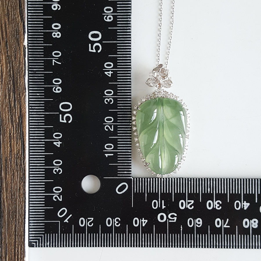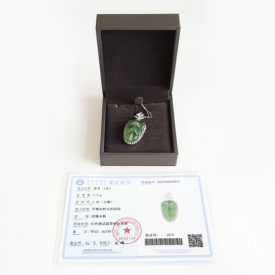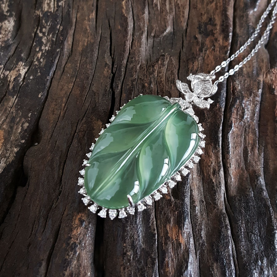 名称 | AU750白金镶天然细腻无纹裂冰种叶子(金枝玉叶)翡翠吊坠项链 |