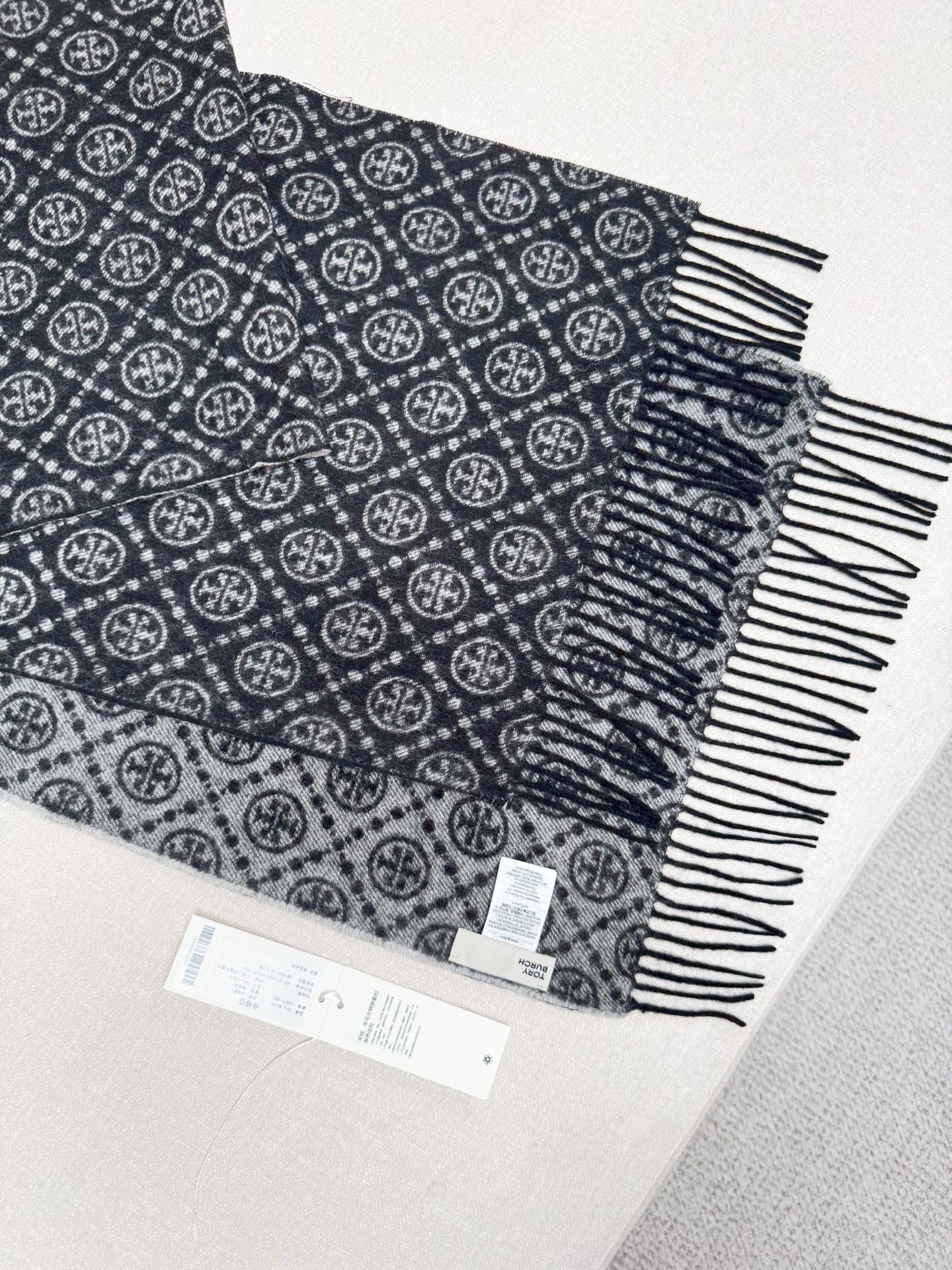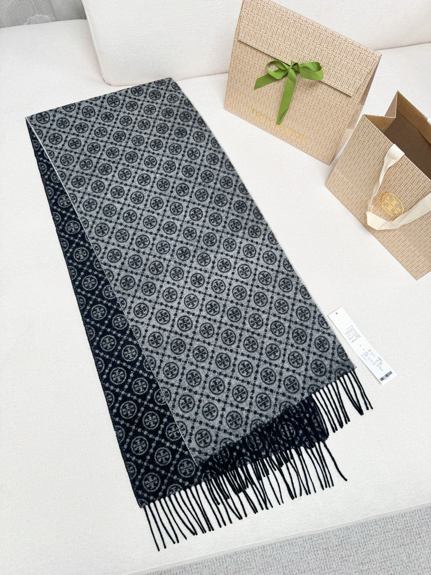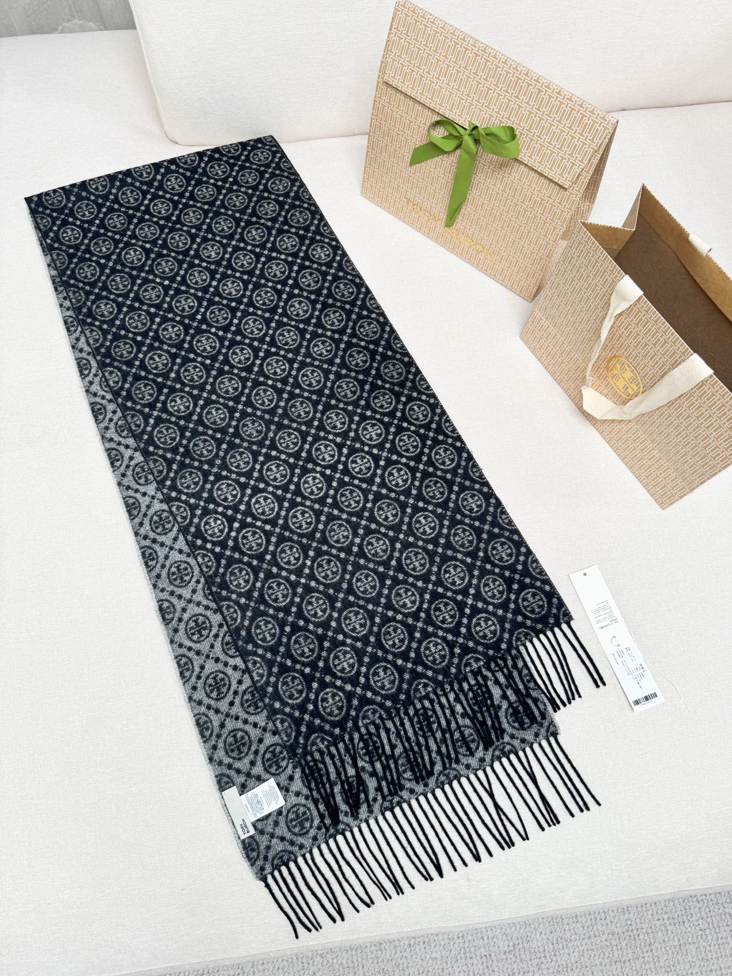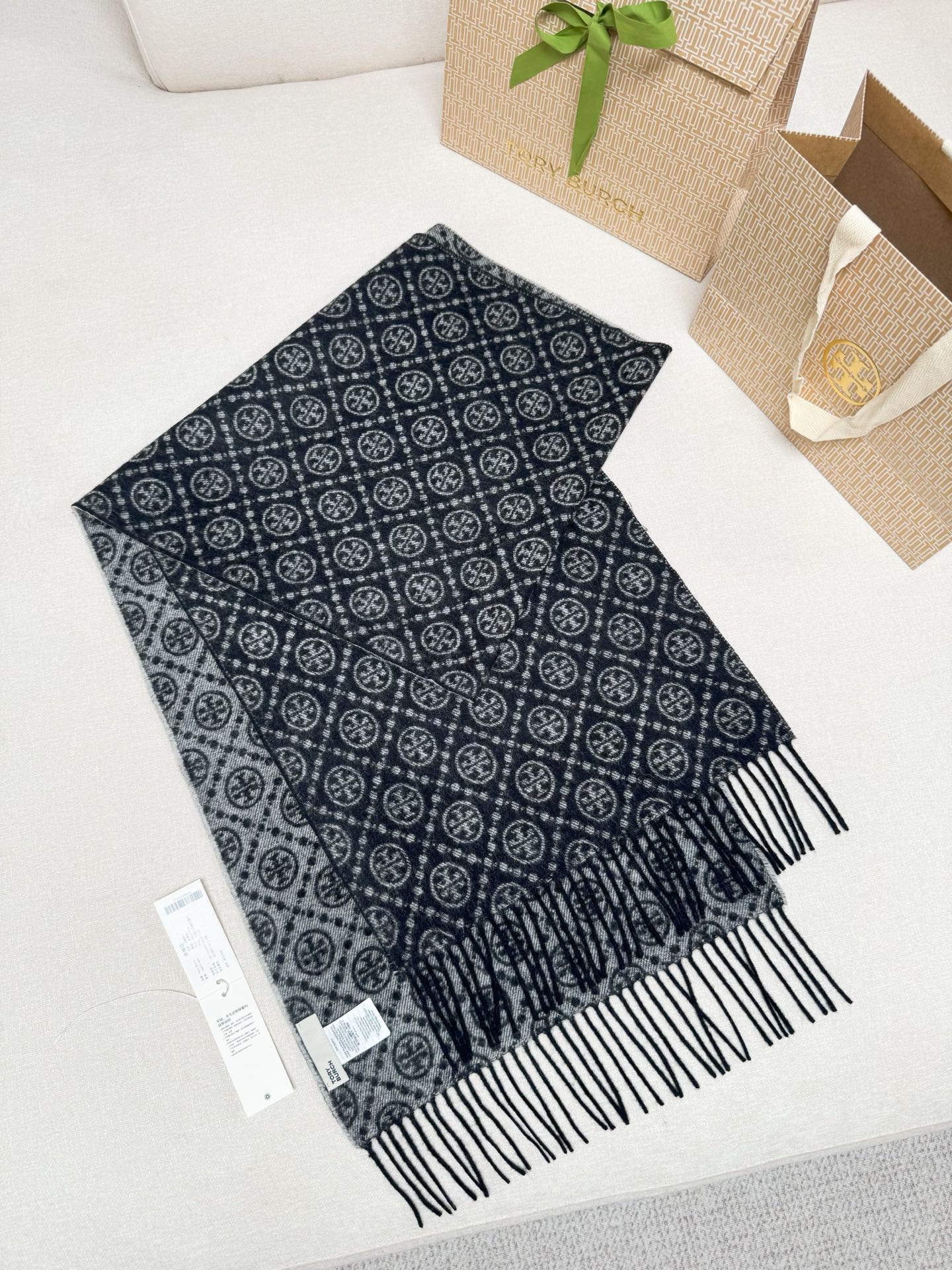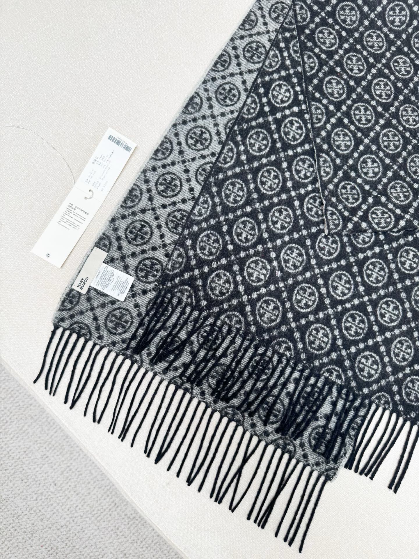 TORY BURCH.TB 原版包装,信封包装➕手提袋 材质:90%绵羊羊毛+10%山羊绒 尺寸:180CM*38CM 顶部和底部饰以扭结式流苏,轻奢搭配,简单的深浅印花大logo上身很有气质,超级百搭,个性小姐姐轻奢选择,不张扬,凸显温柔气质!
