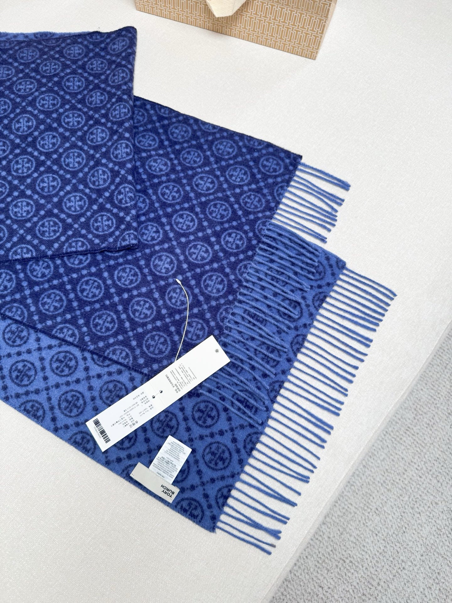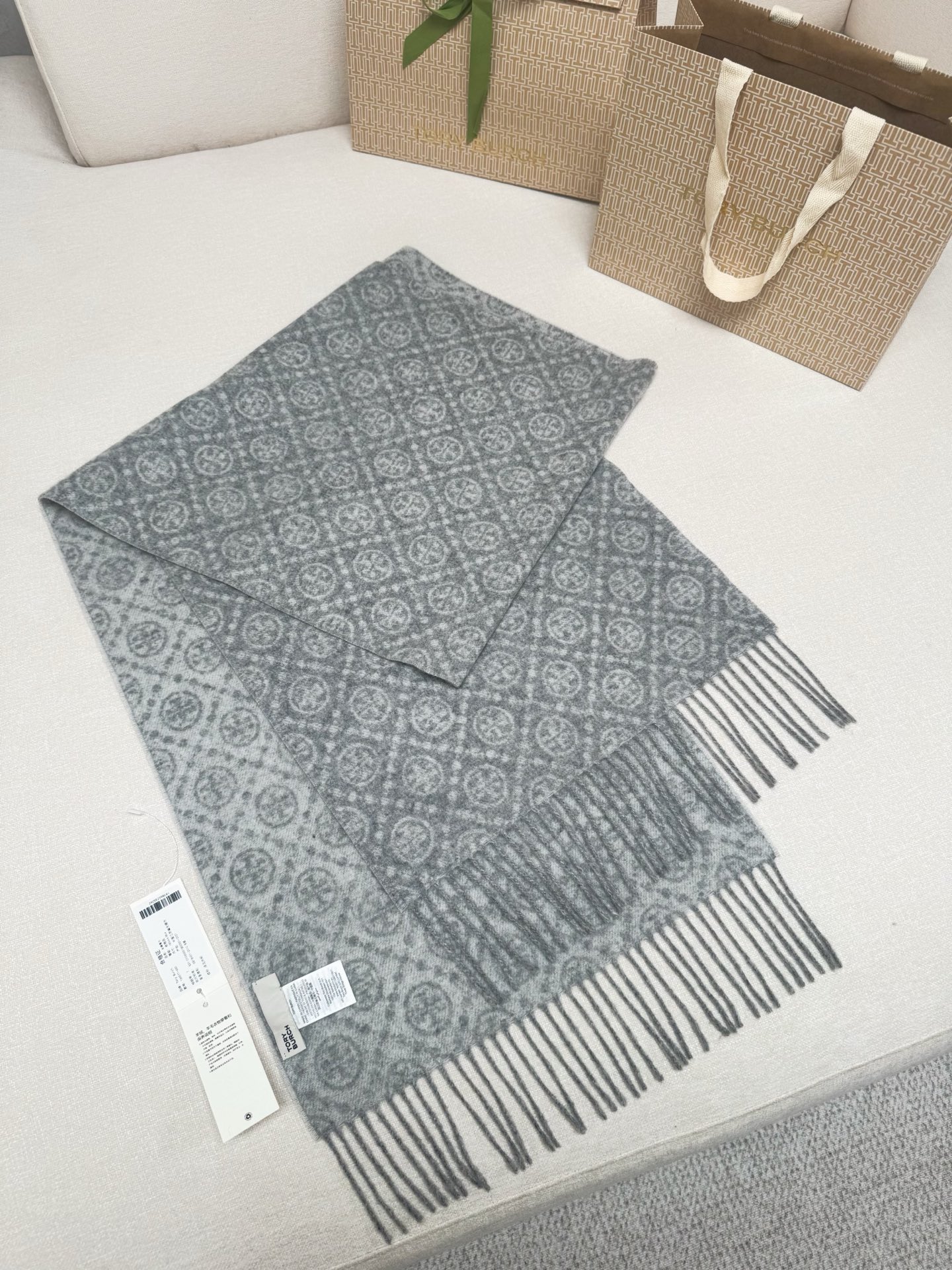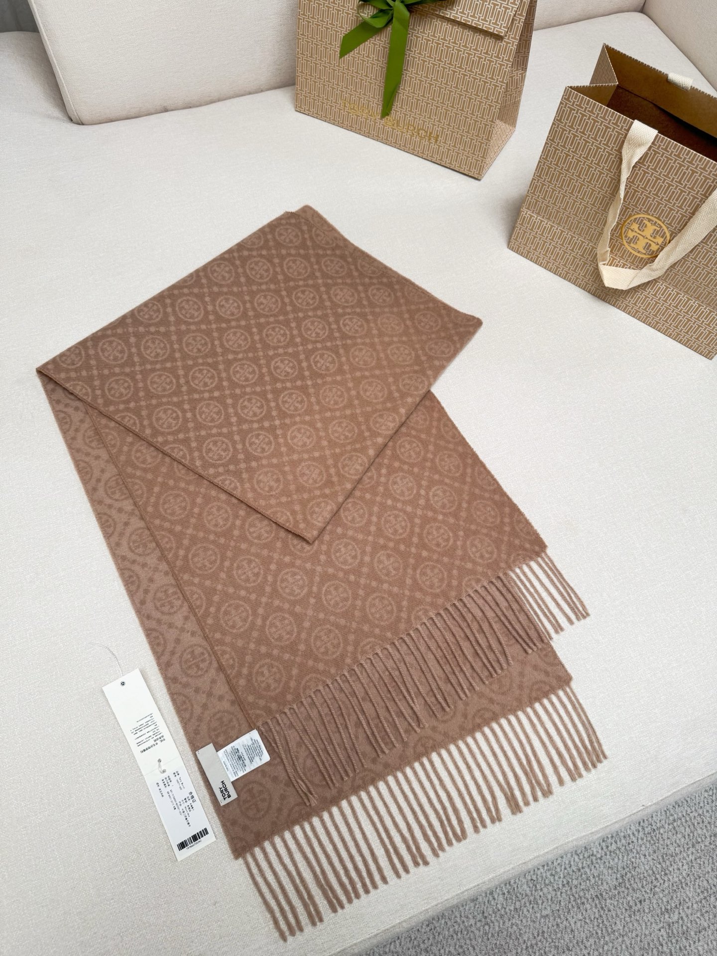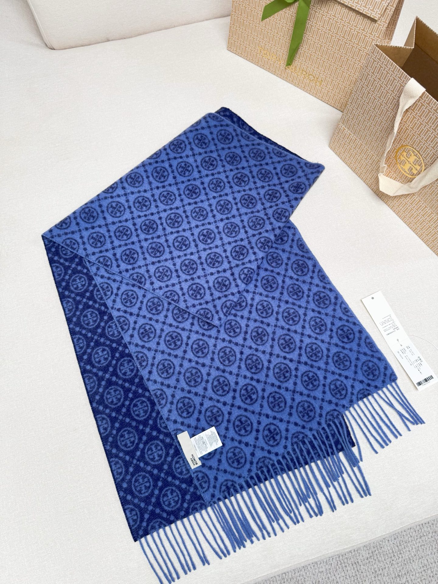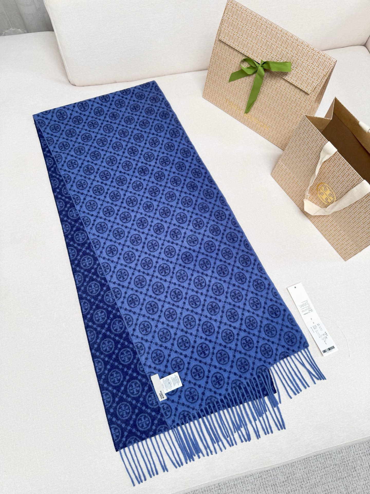TORY BURCH.TB 原版包装,信封包装➕手提袋 材质:90%绵羊羊毛+10%山羊绒 尺寸:180CM*38CM 顶部和底部饰以扭结式流苏,轻奢搭配,简单的深浅印花大logo上身很有气质,超级百搭,个性小姐姐轻奢选择,不张扬,凸显温柔气质!