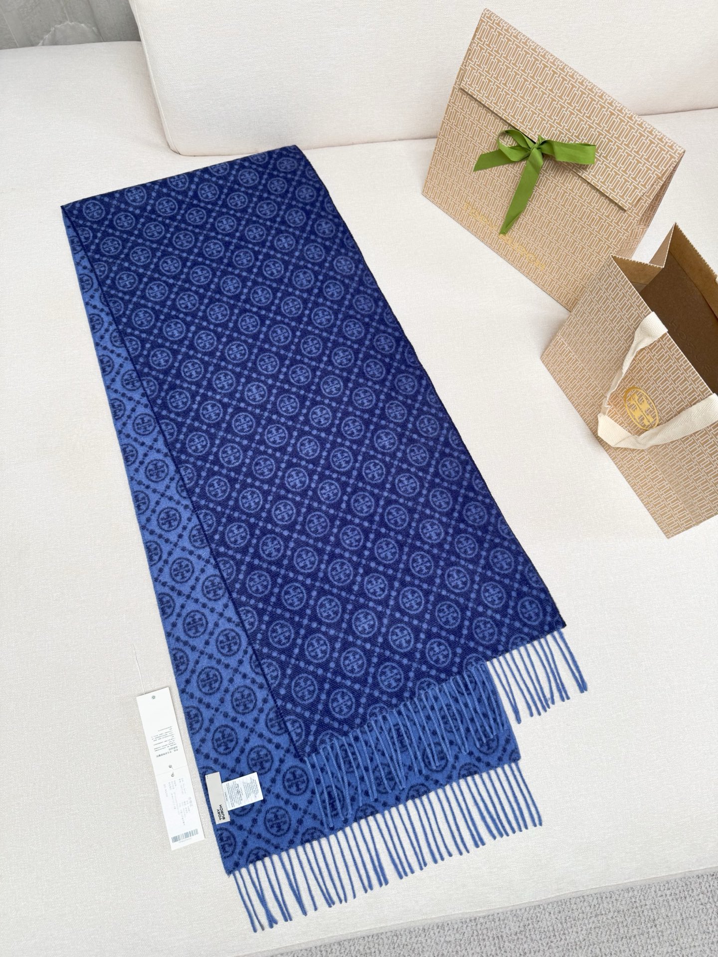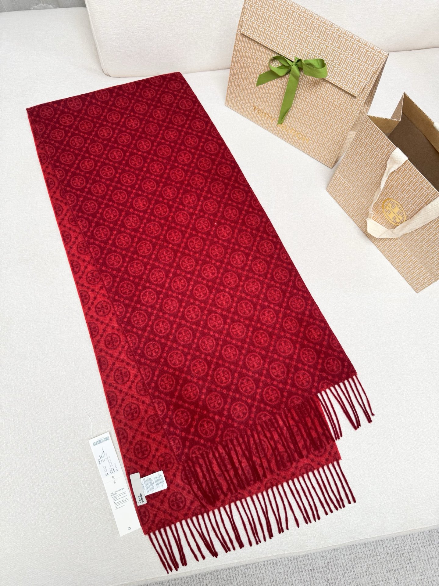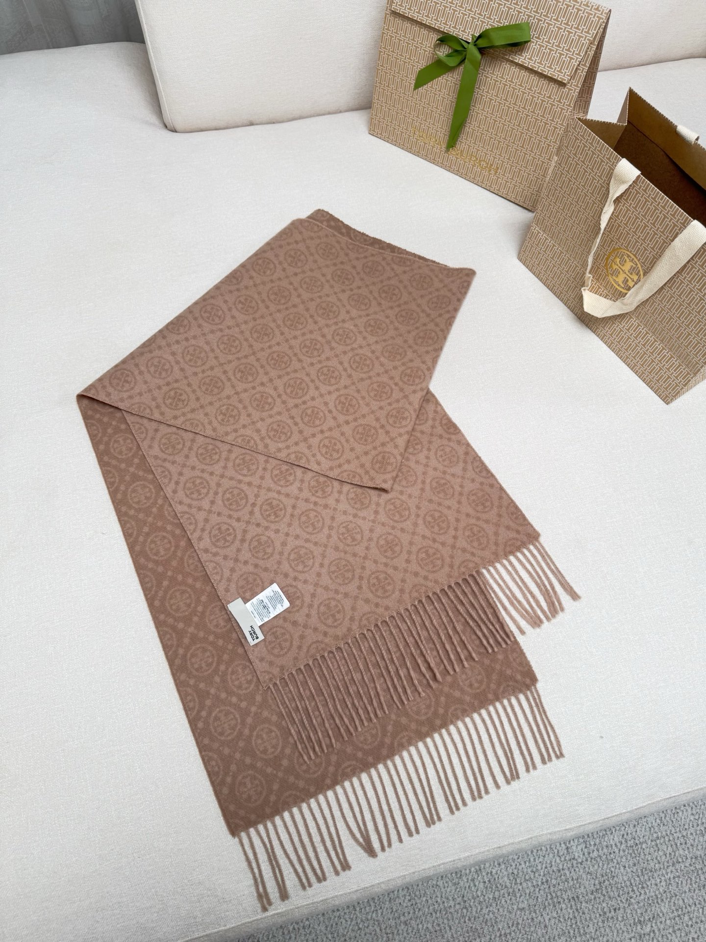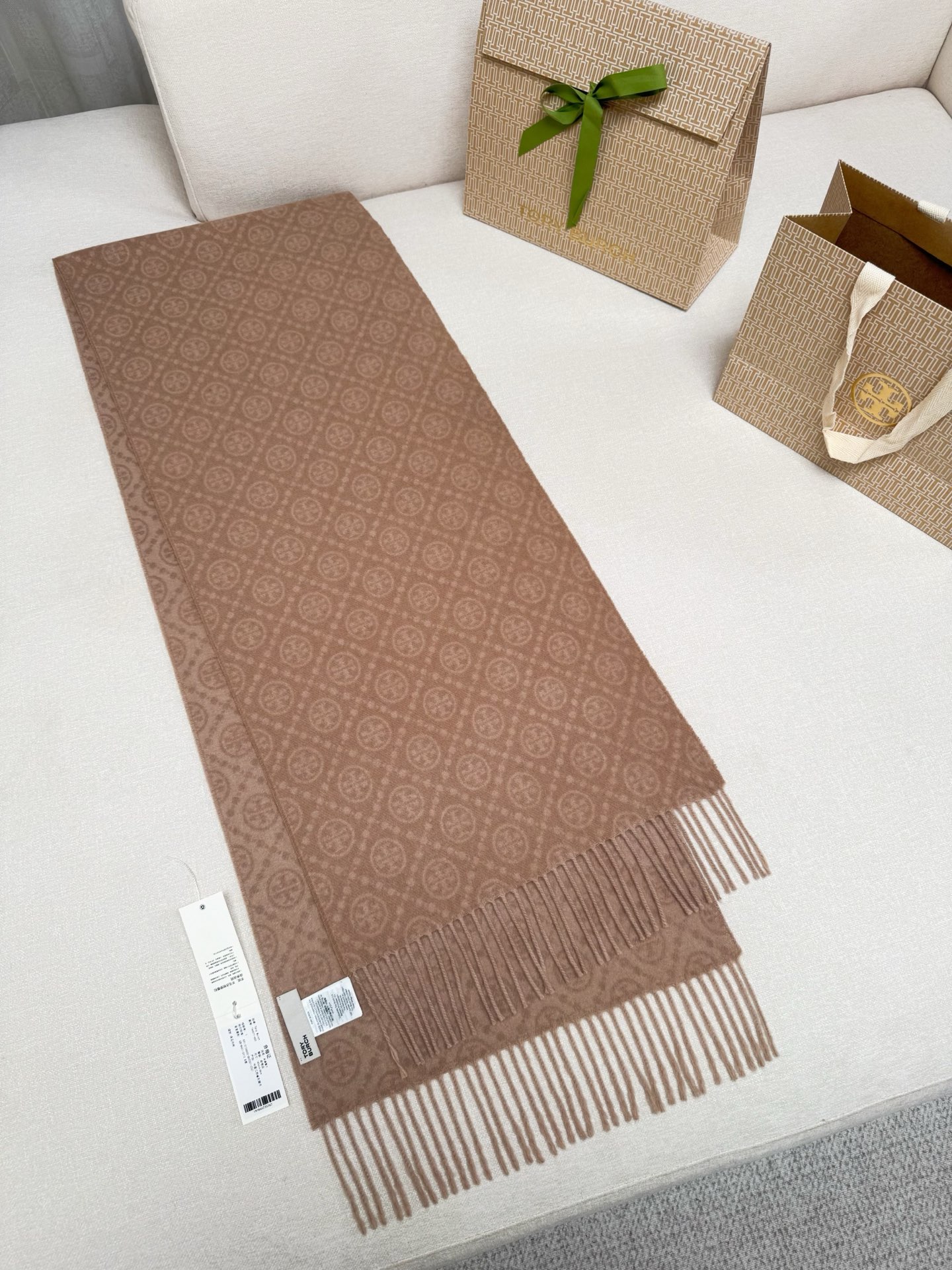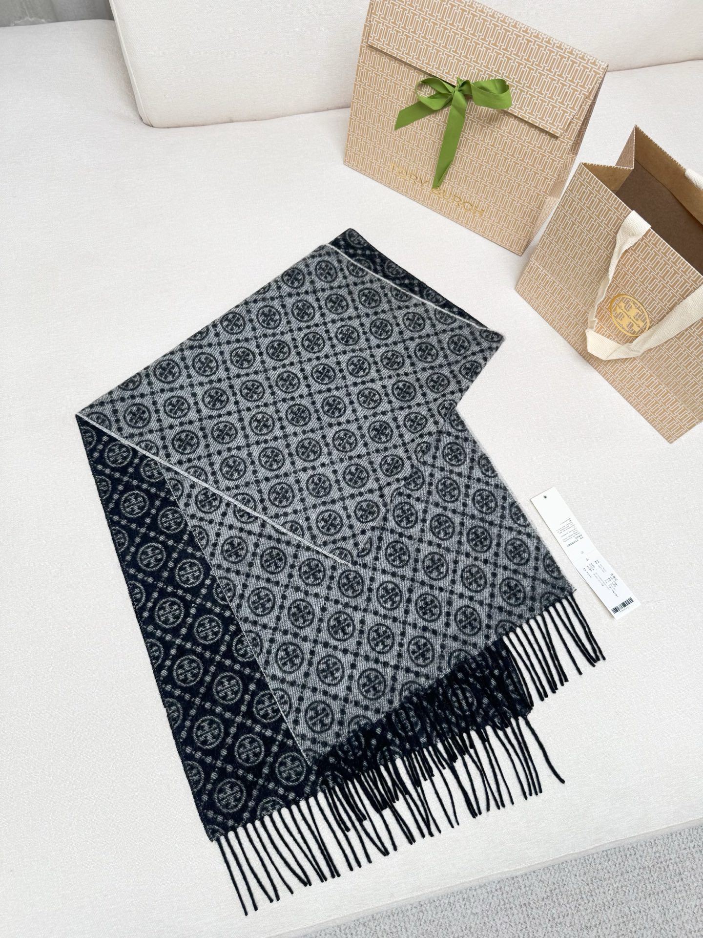 TORY BURCH.TB 原版包装,信封包装➕手提袋 材质:90%绵羊羊毛+10%山羊绒 尺寸:180CM*38CM 顶部和底部饰以扭结式流苏,轻奢搭配,简单的深浅印花大logo上身很有气质,超级百搭,个性小姐姐轻奢选择,不张扬,凸显温柔气质!