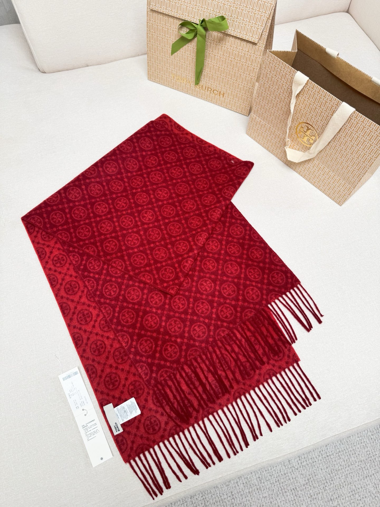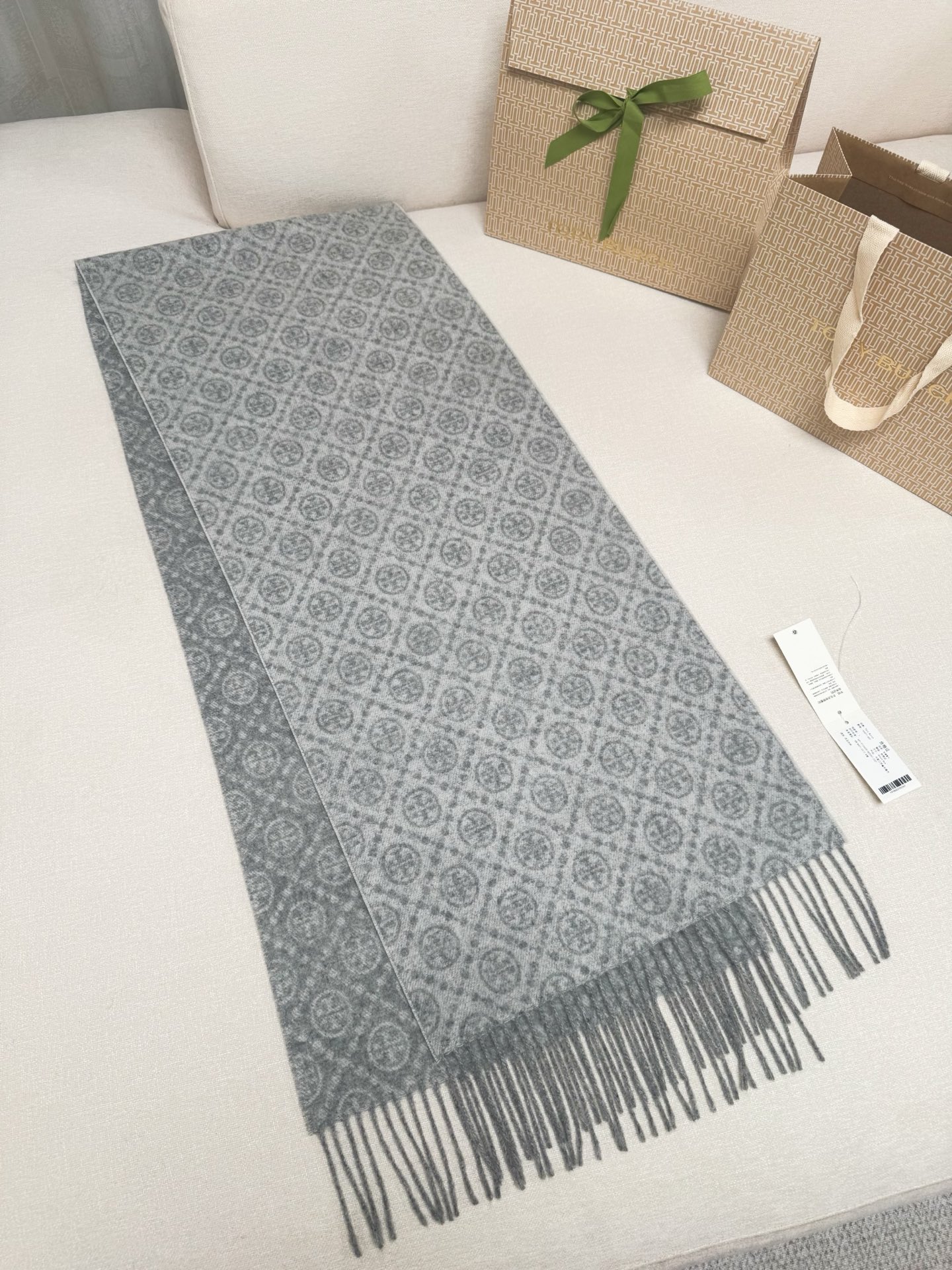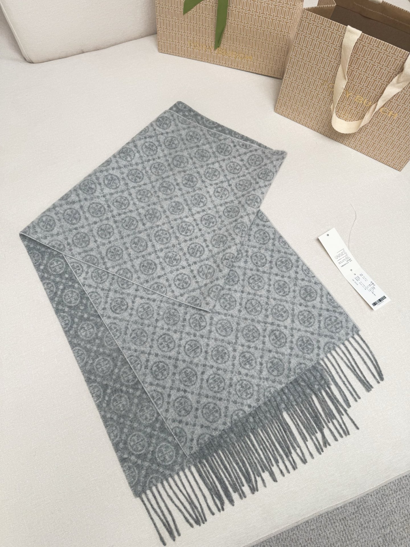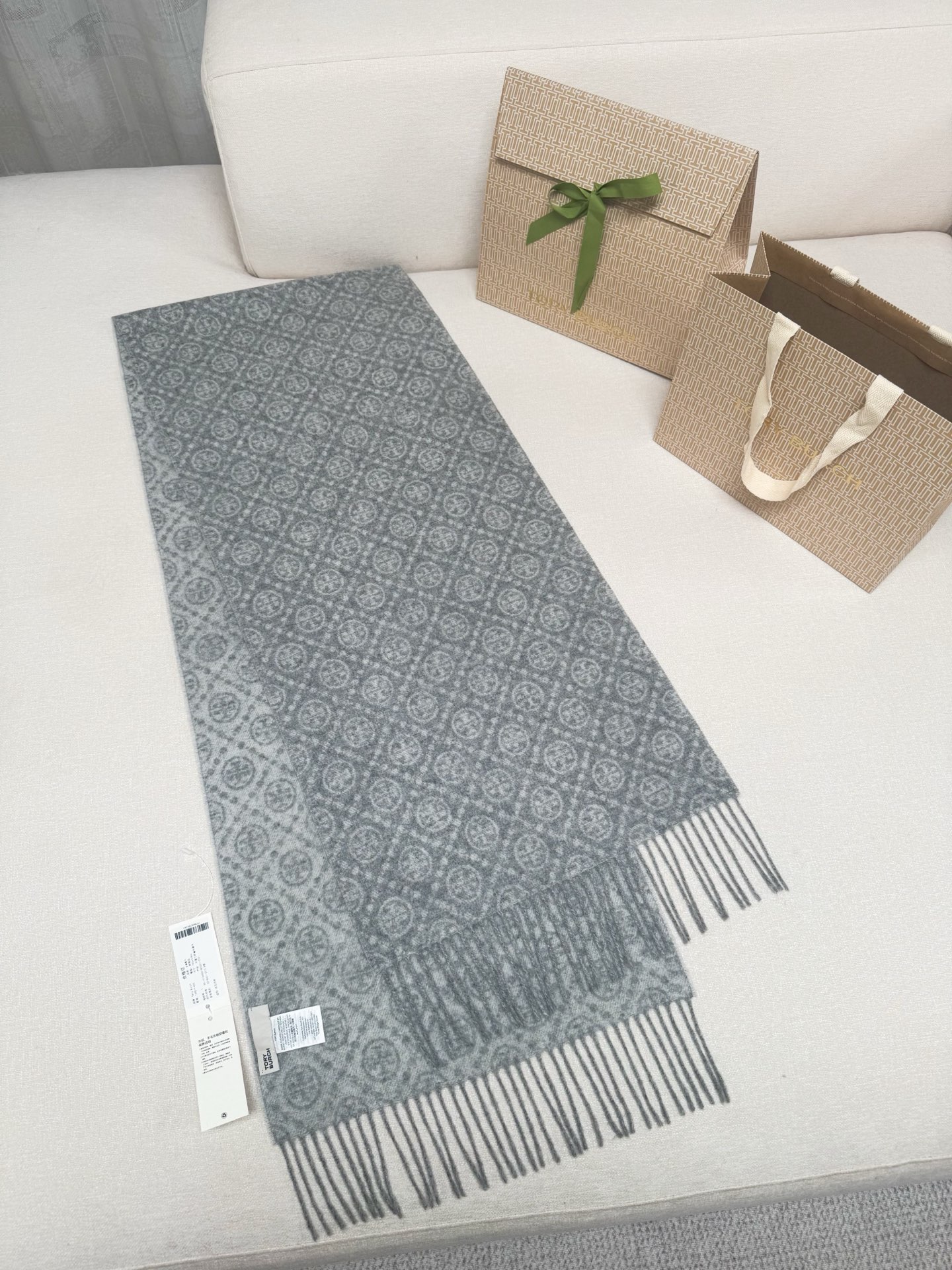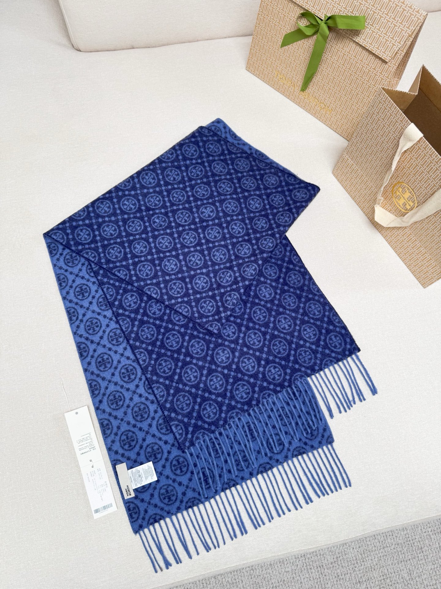 TORY BURCH.TB 原版包装,信封包装➕手提袋 材质:90%绵羊羊毛+10%山羊绒 尺寸:180CM*38CM 顶部和底部饰以扭结式流苏,轻奢搭配,简单的深浅印花大logo上身很有气质,超级百搭,个性小姐姐轻奢选择,不张扬,凸显温柔气质!