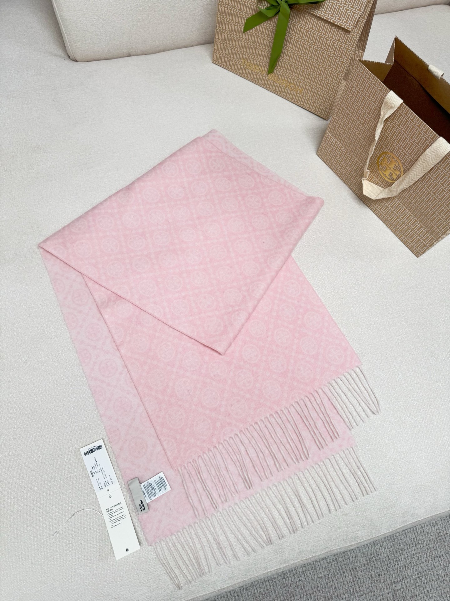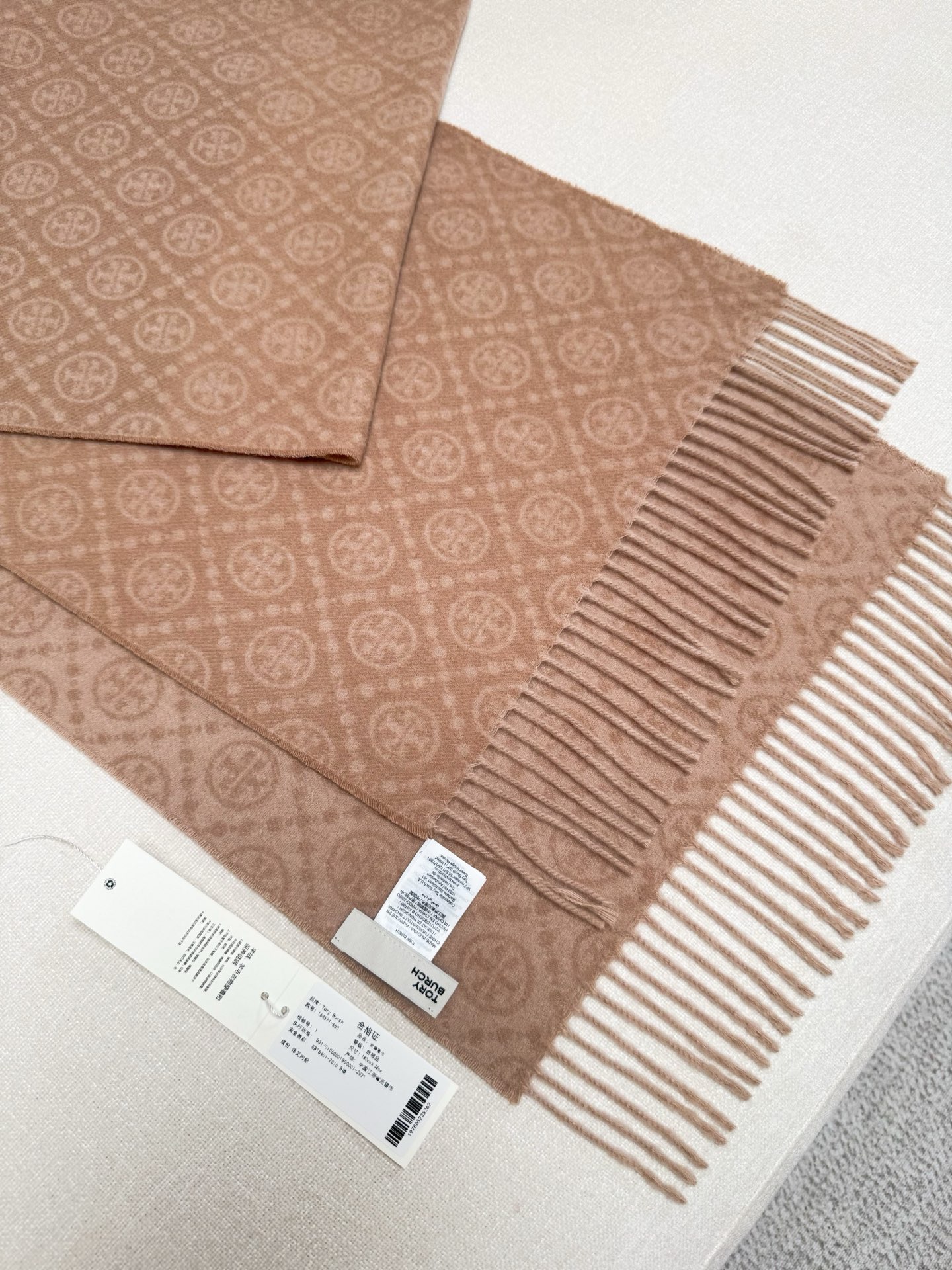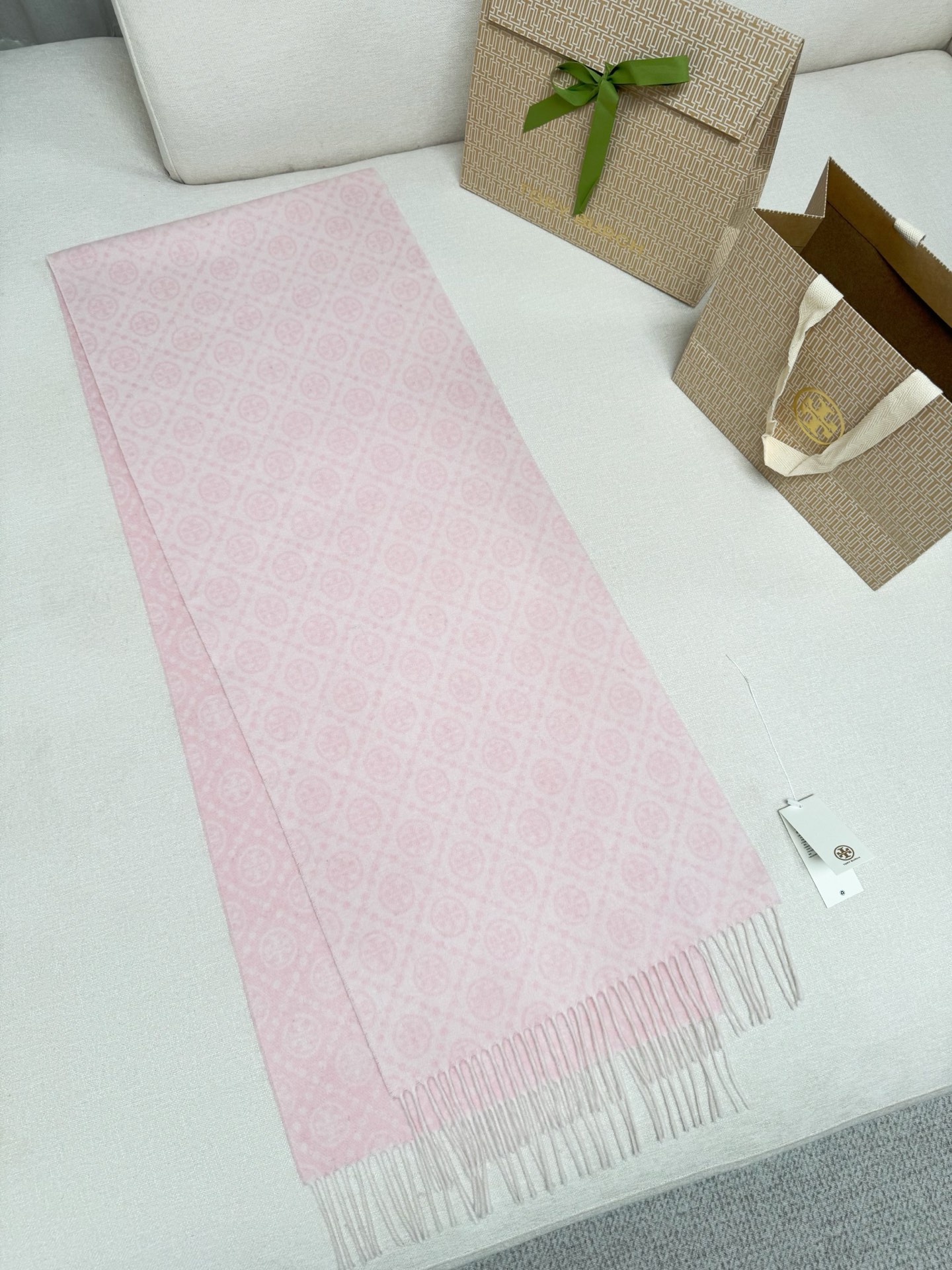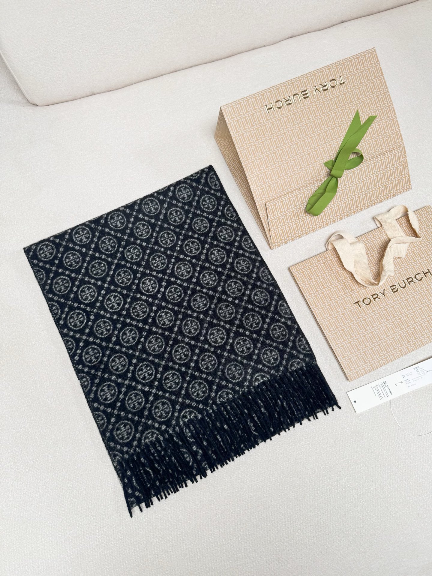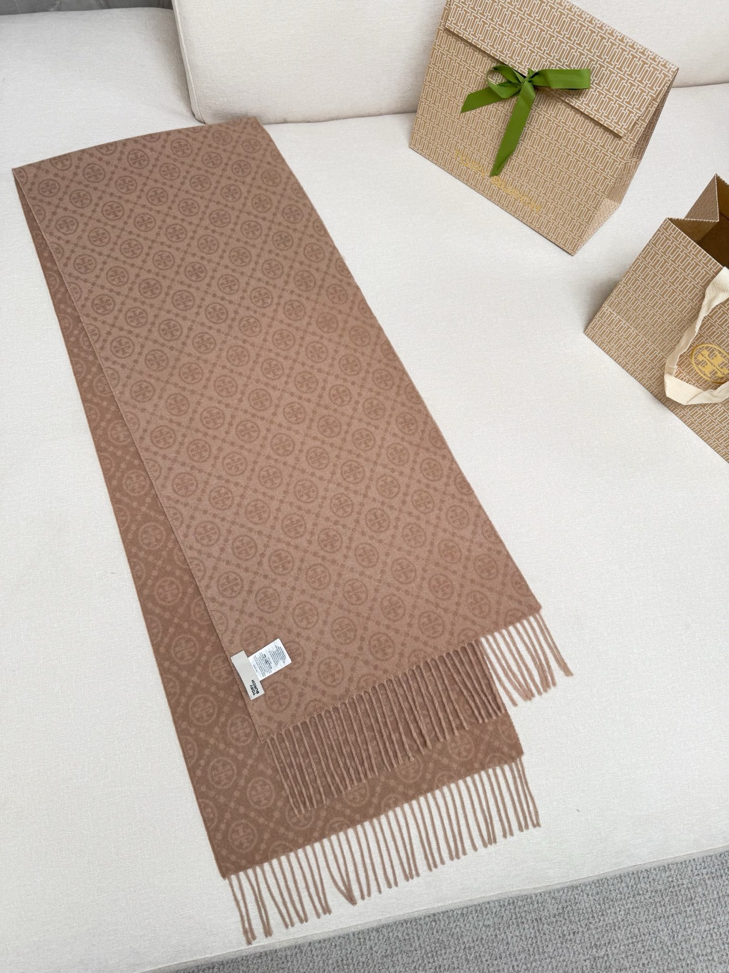TORY BURCH.TB 原版包装,信封包装➕手提袋 材质:90%绵羊羊毛+10%山羊绒 尺寸:180CM*38CM 顶部和底部饰以扭结式流苏,轻奢搭配,简单的深浅印花大logo上身很有气质,超级百搭,个性小姐姐轻奢选择,不张扬,凸显温柔气质!