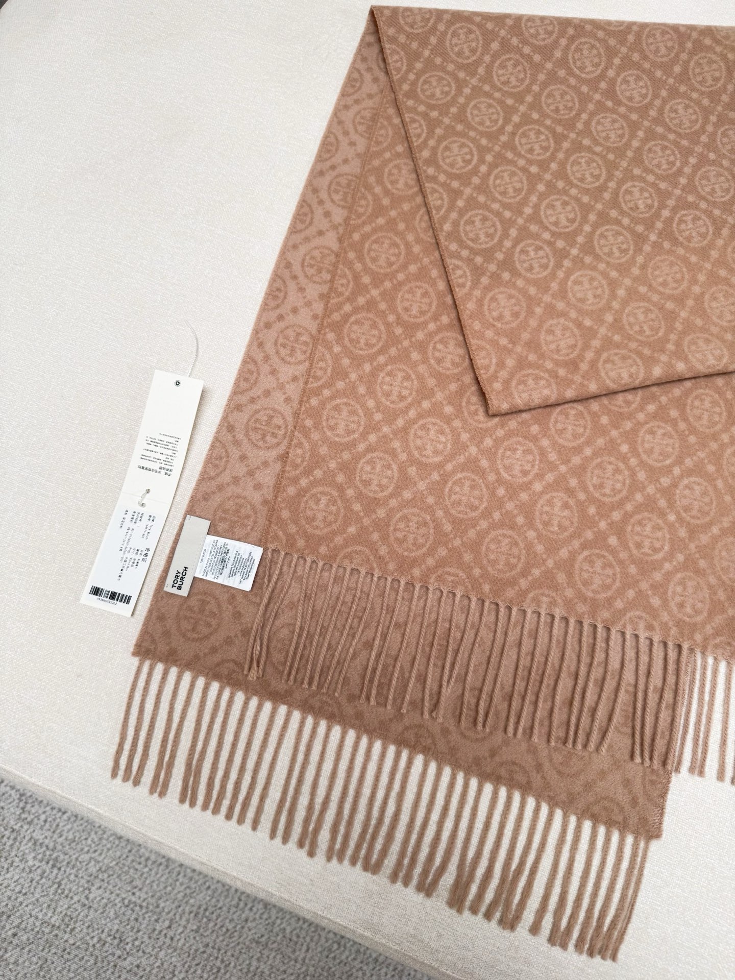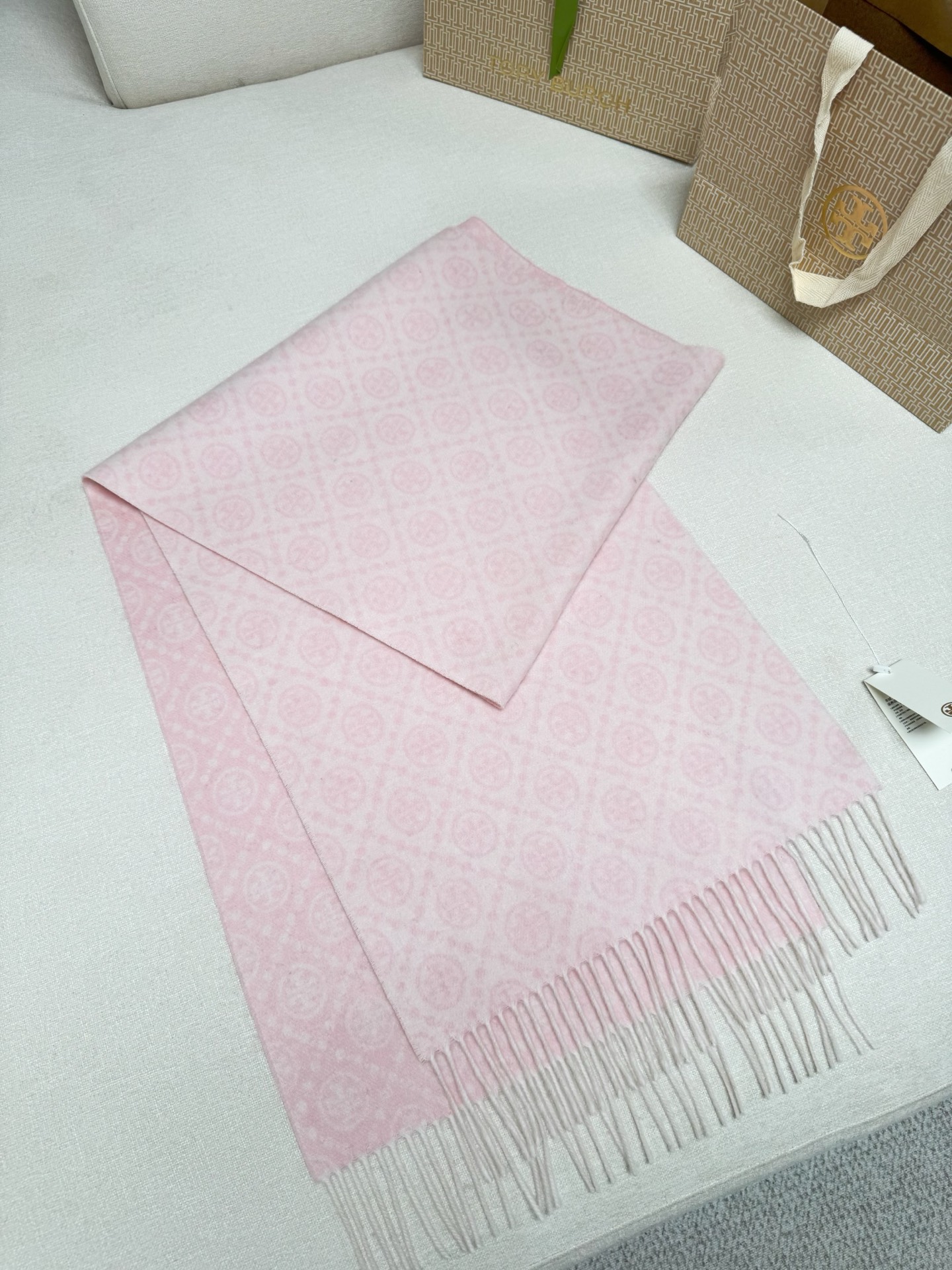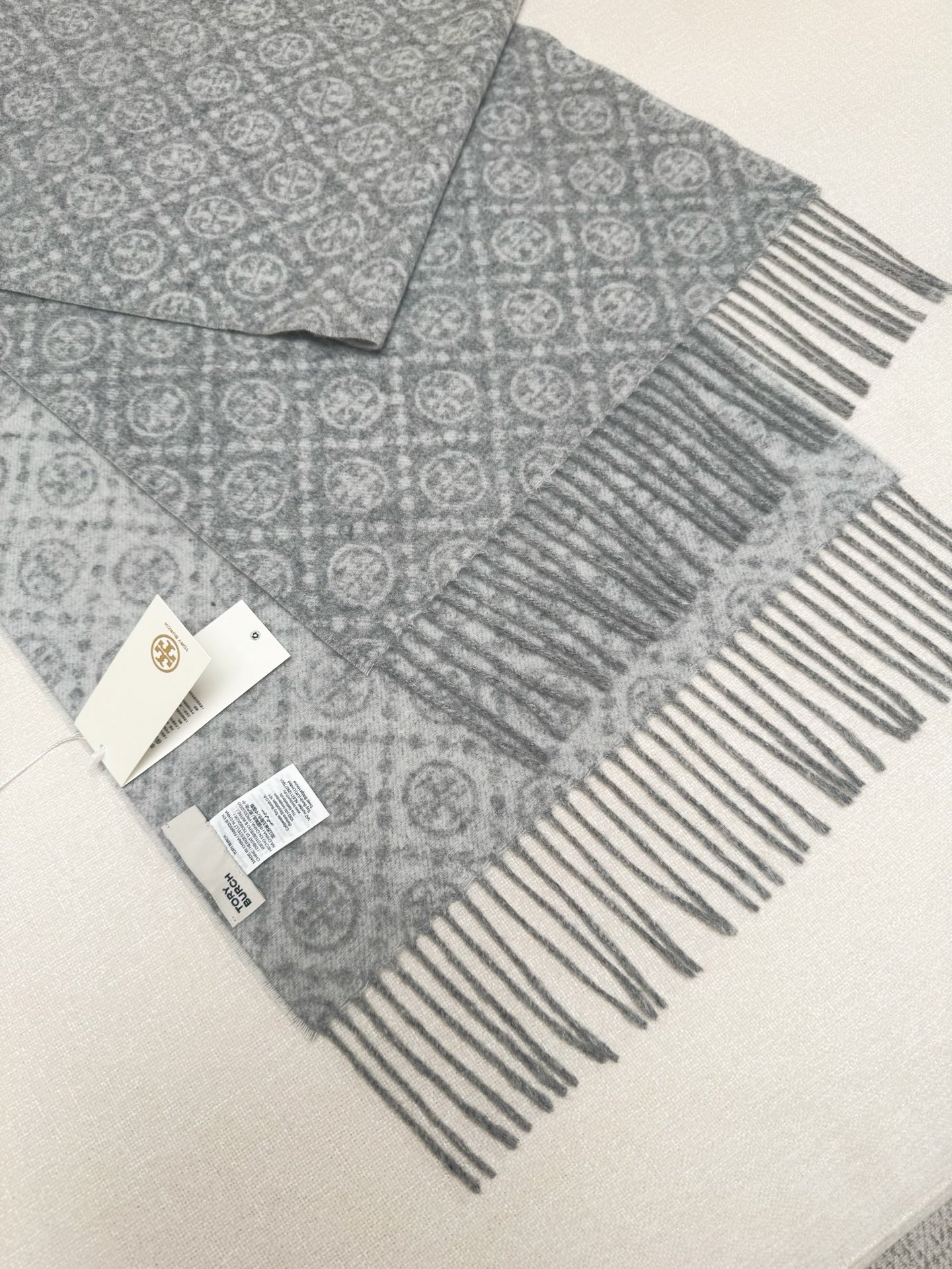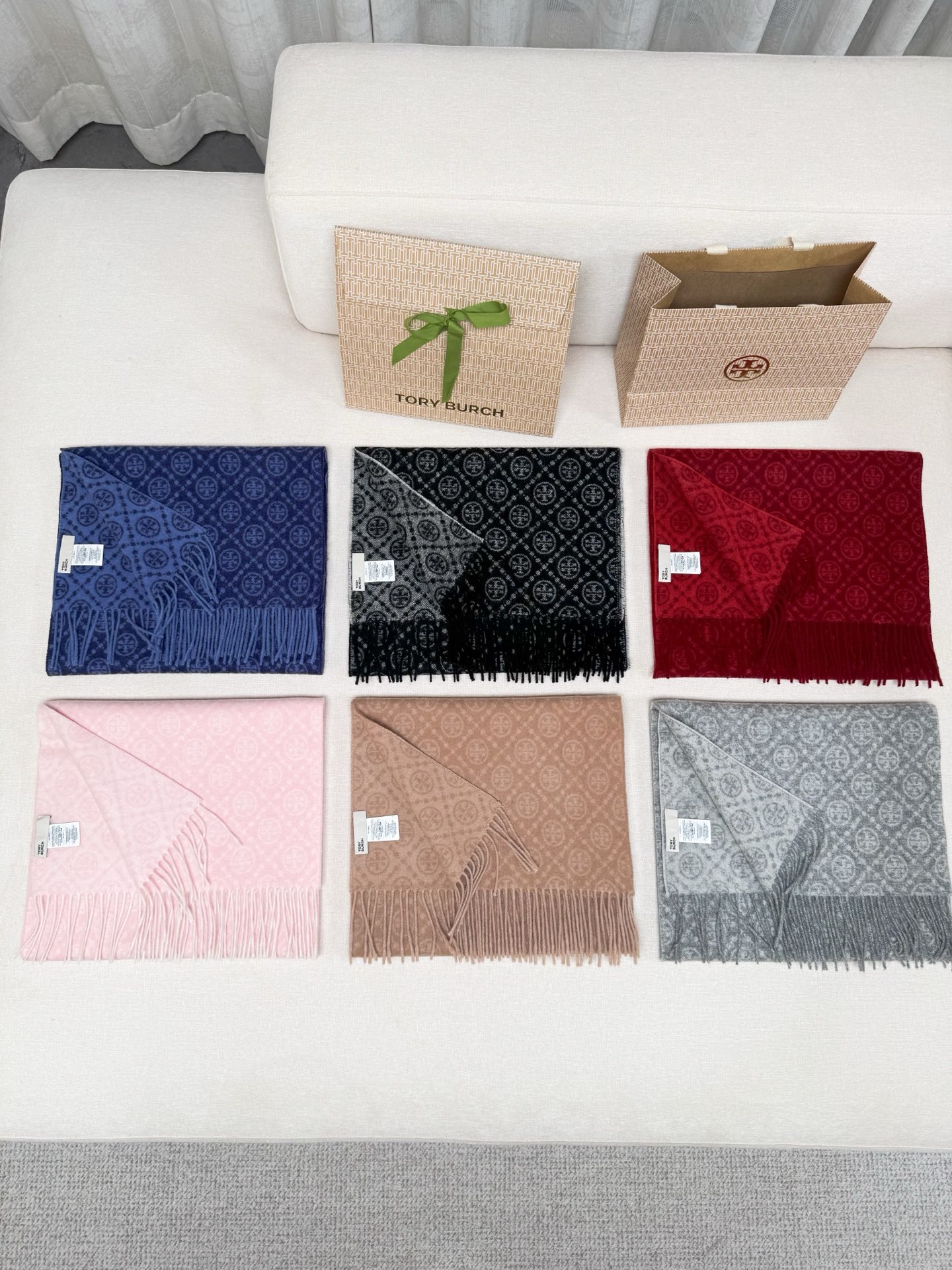 TORY BURCH.TB 原版包装,信封包装➕手提袋 材质:90%绵羊羊毛+10%山羊绒 尺寸:180CM*38CM 顶部和底部饰以扭结式流苏,轻奢搭配,简单的深浅印花大logo上身很有气质,超级百搭,个性小姐姐轻奢选择,不张扬,凸显温柔气质!