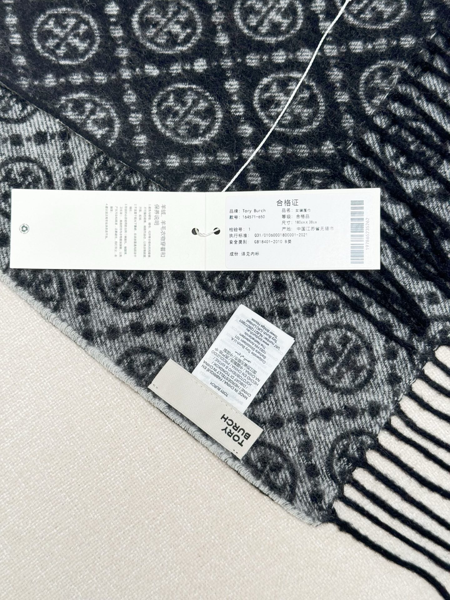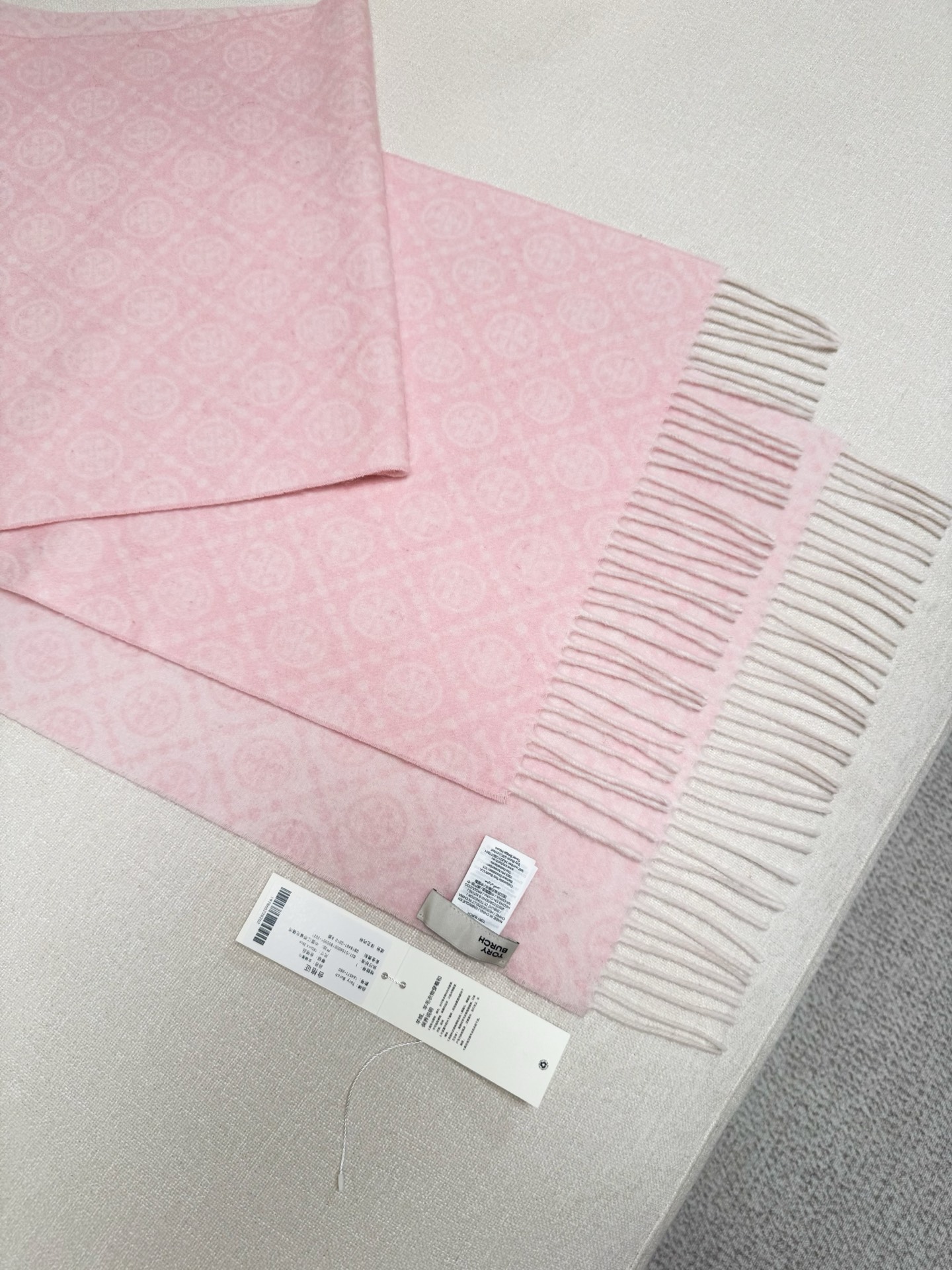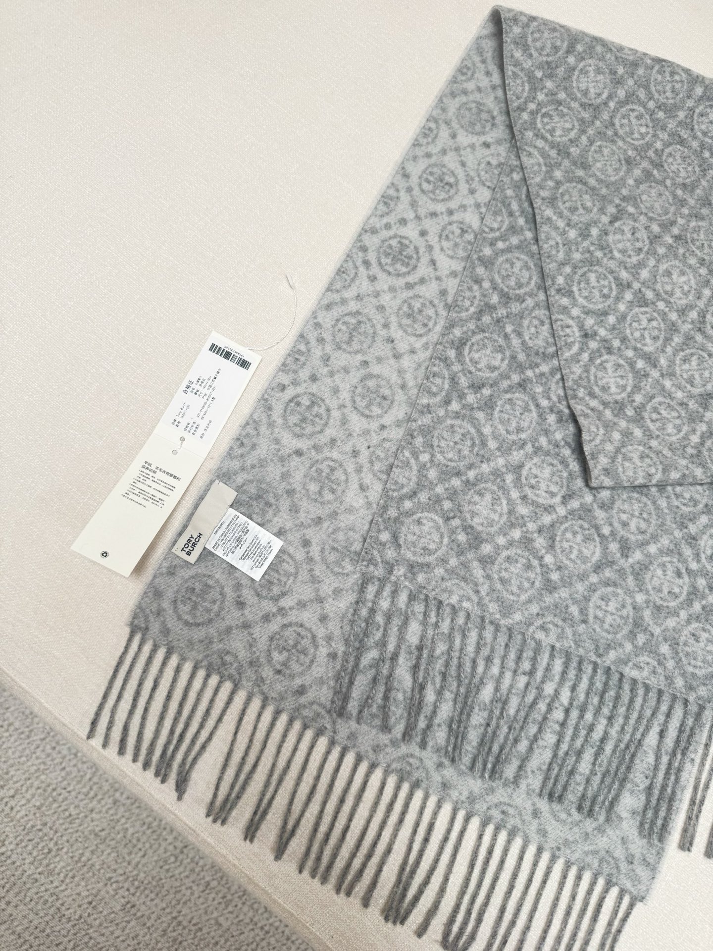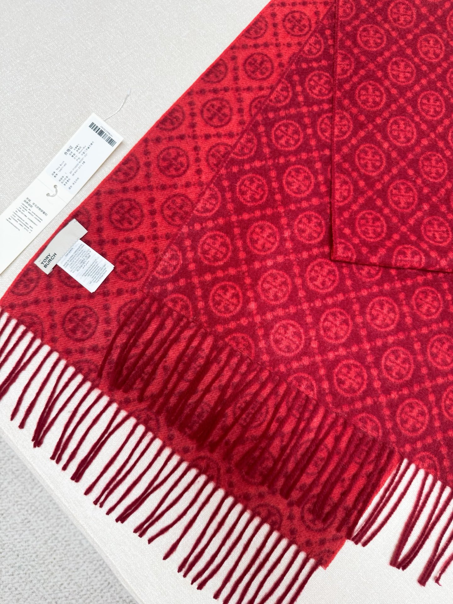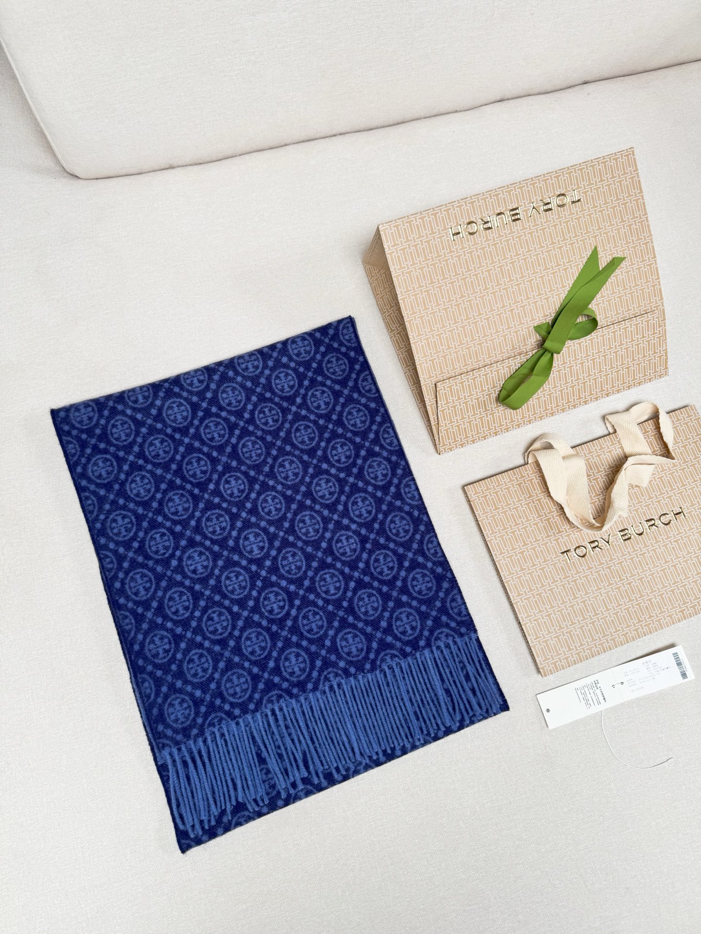 TORY BURCH.TB 原版包装,信封包装➕手提袋 材质:90%绵羊羊毛+10%山羊绒 尺寸:180CM*38CM 顶部和底部饰以扭结式流苏,轻奢搭配,简单的深浅印花大logo上身很有气质,超级百搭,个性小姐姐轻奢选择,不张扬,凸显温柔气质!