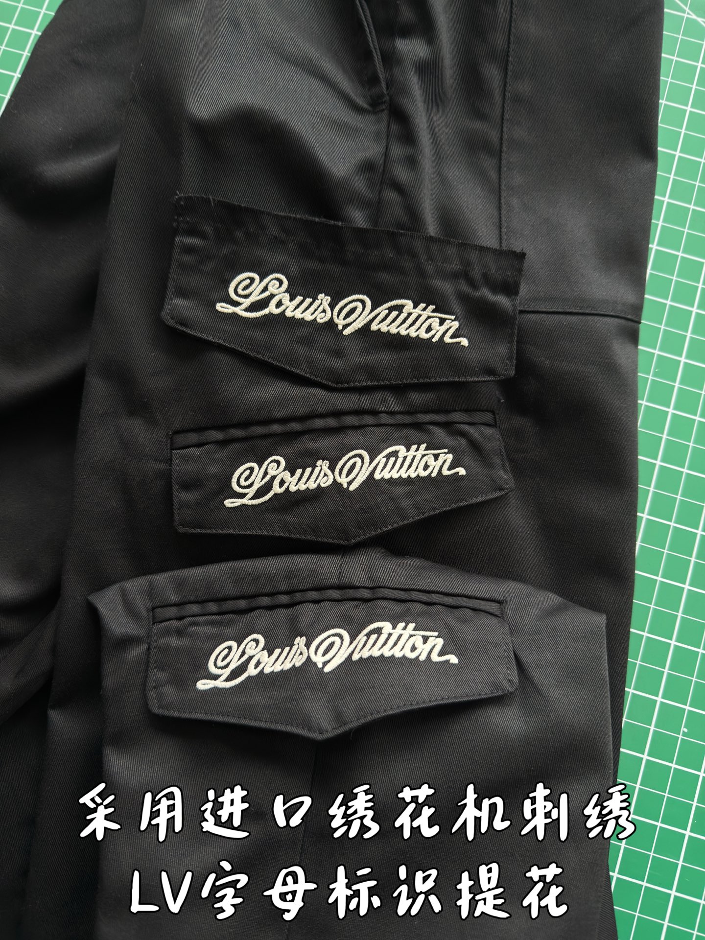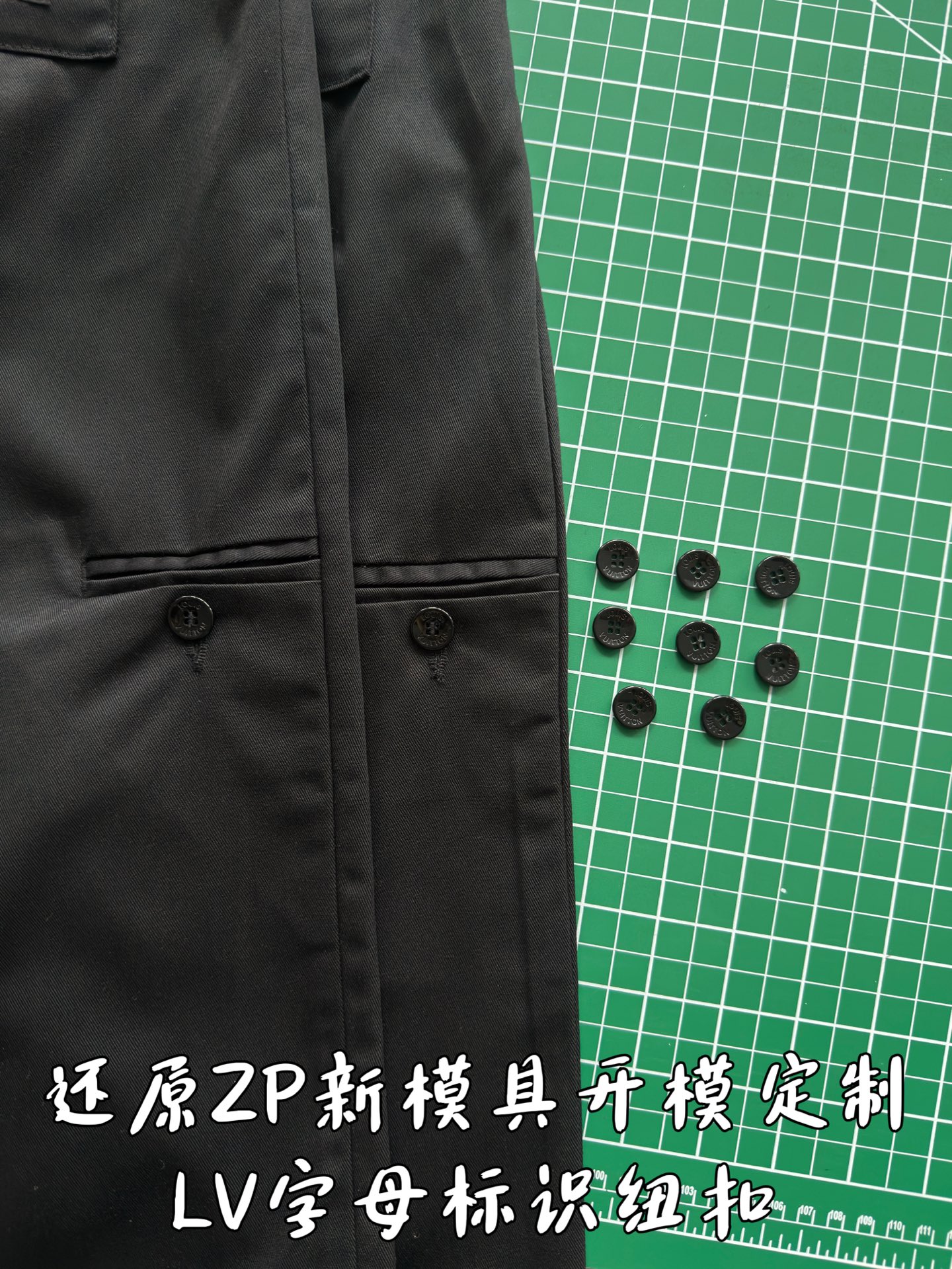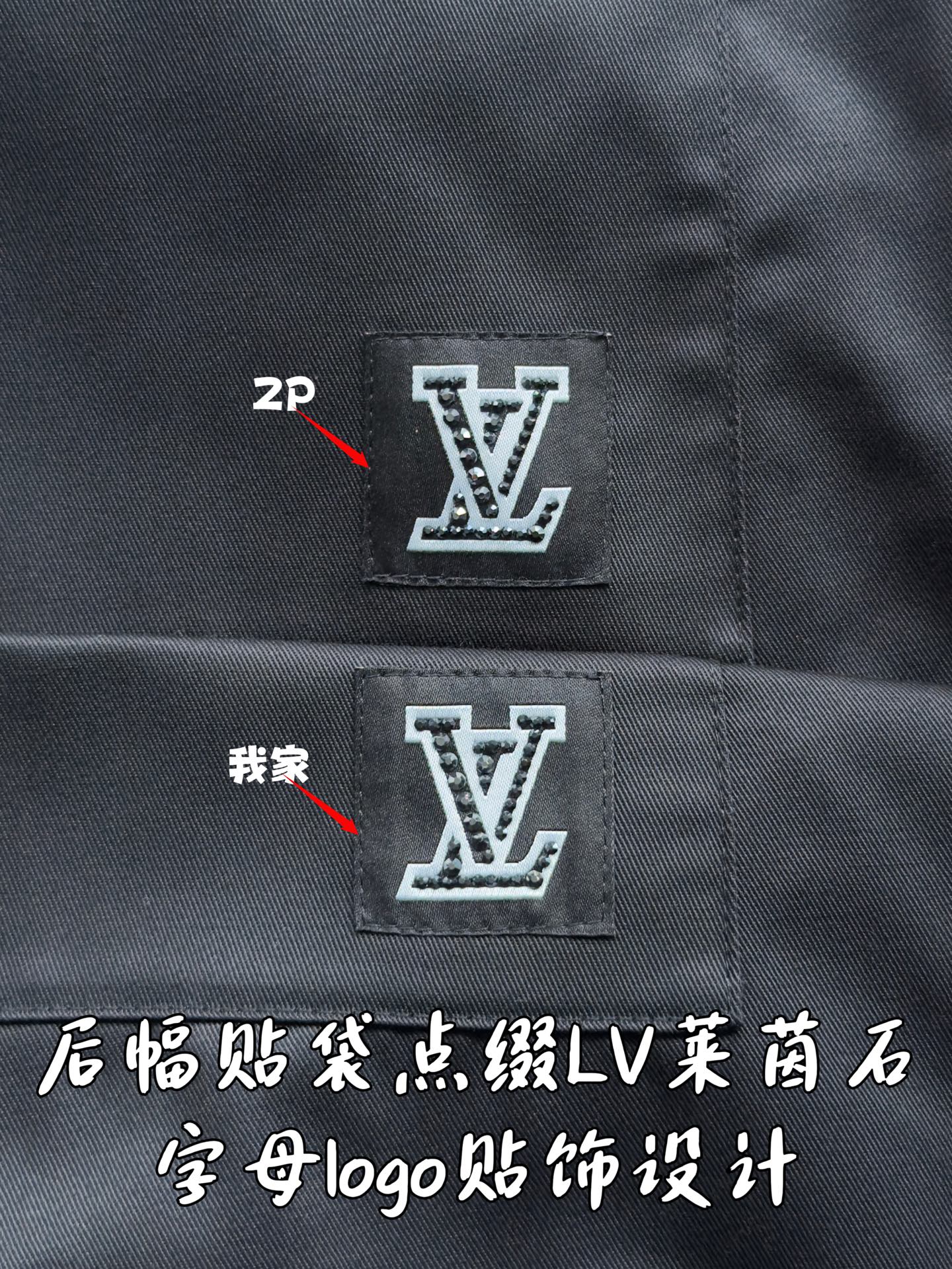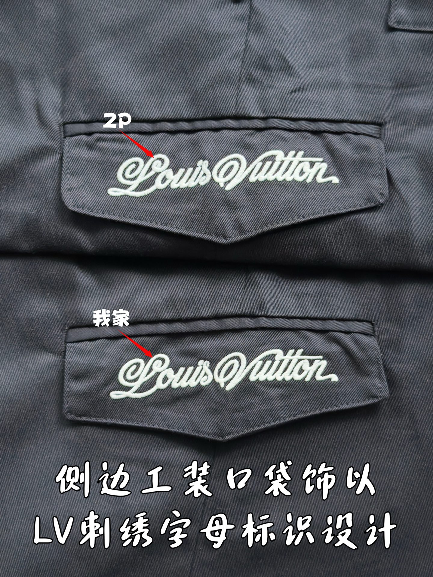 ✍️细节对比 后侧口袋开模定制LV字母标识纽扣 字母做到清晰立体🫡 后幅口袋饰以LV字母logo莱茵石设计 侧边工装口袋LV刺绣字母标识提花设计🤔 门襟开模定制LV字母logo拉链 字母做到跟ZP一样清晰✅